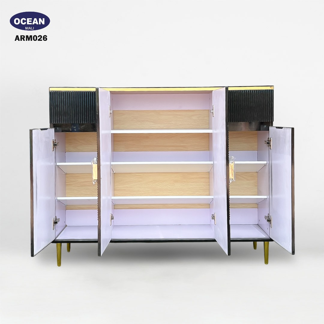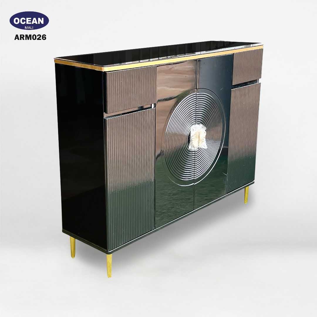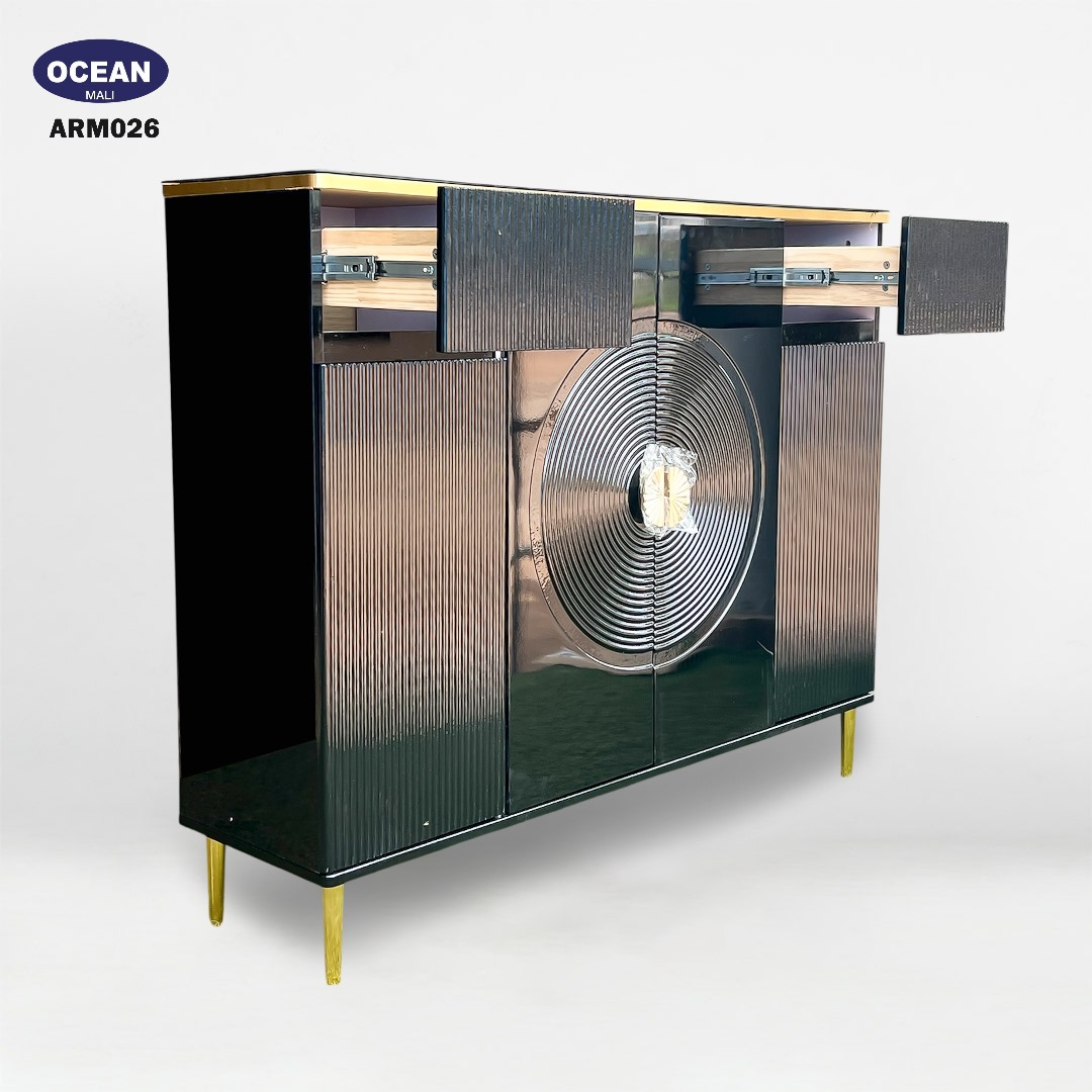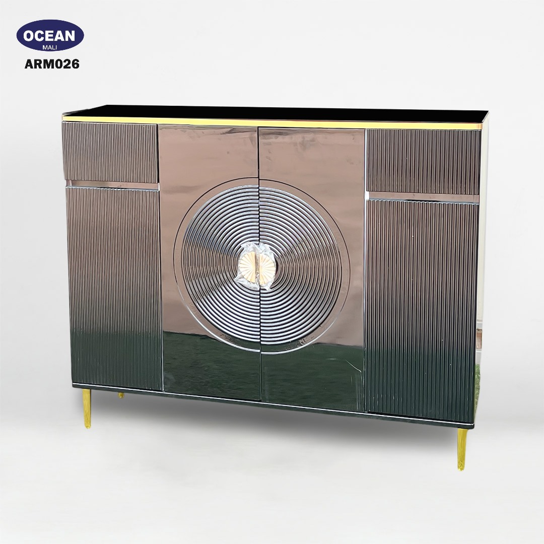 Affirmez votre style avec le Buffet Prestige Chrome ARM026 signé Ocean Mali. Ce meuble au design futuriste et luxueux est doté d’un revêtement miroir chromé avec une sculpture centrale circulaire hypnotique. Parfait pour les intérieurs modernes et les ambiances chic, il combine élégance, originalité et fonctionnalité.