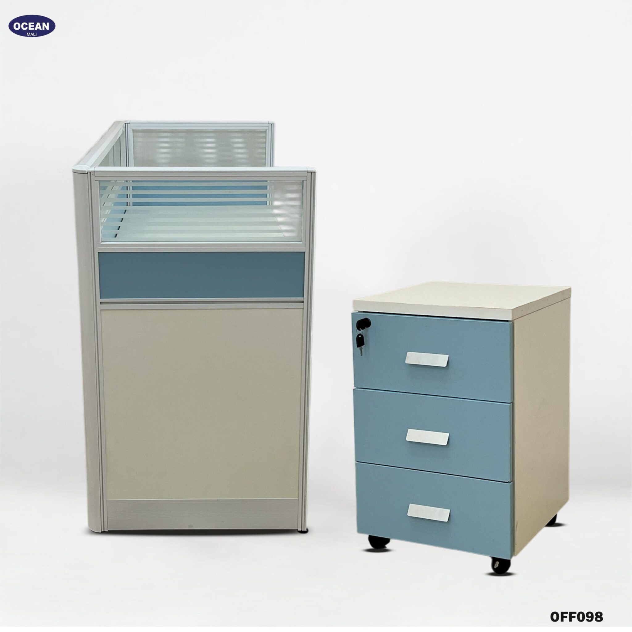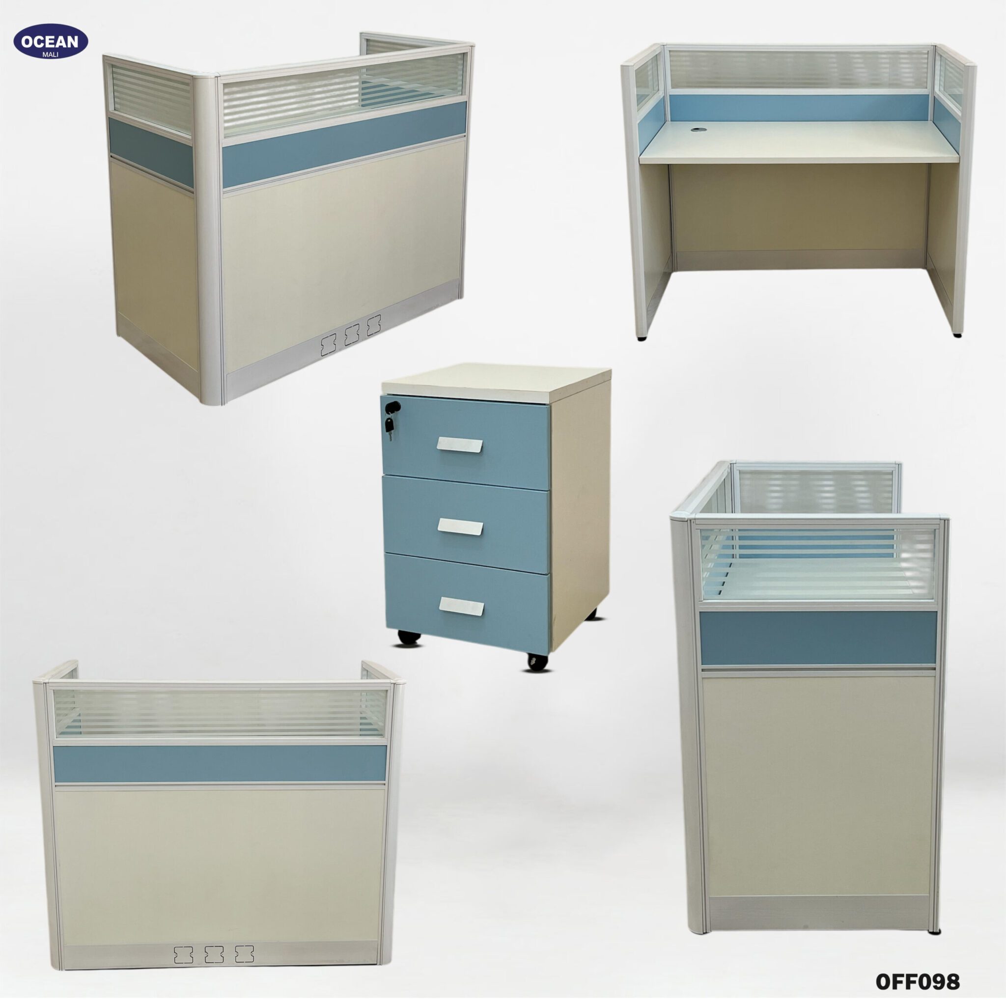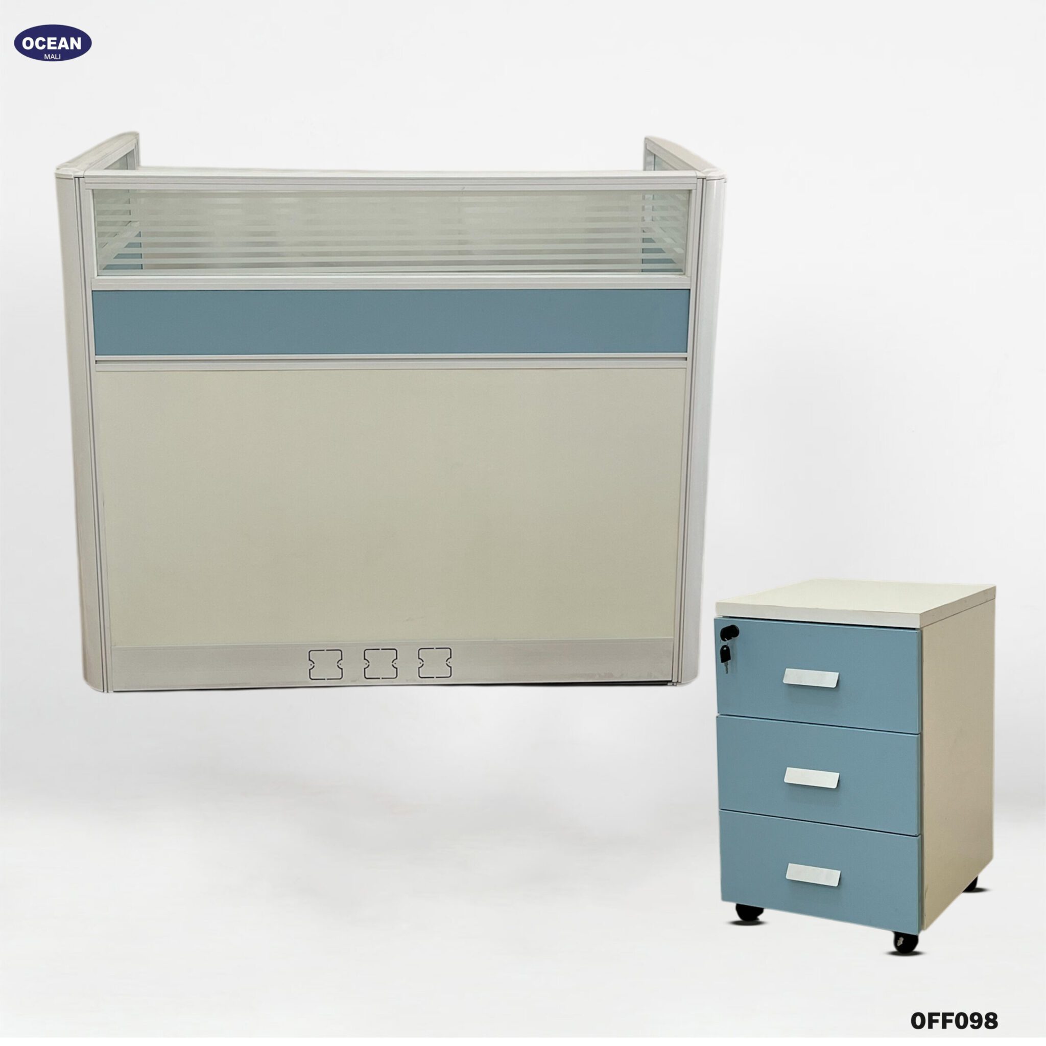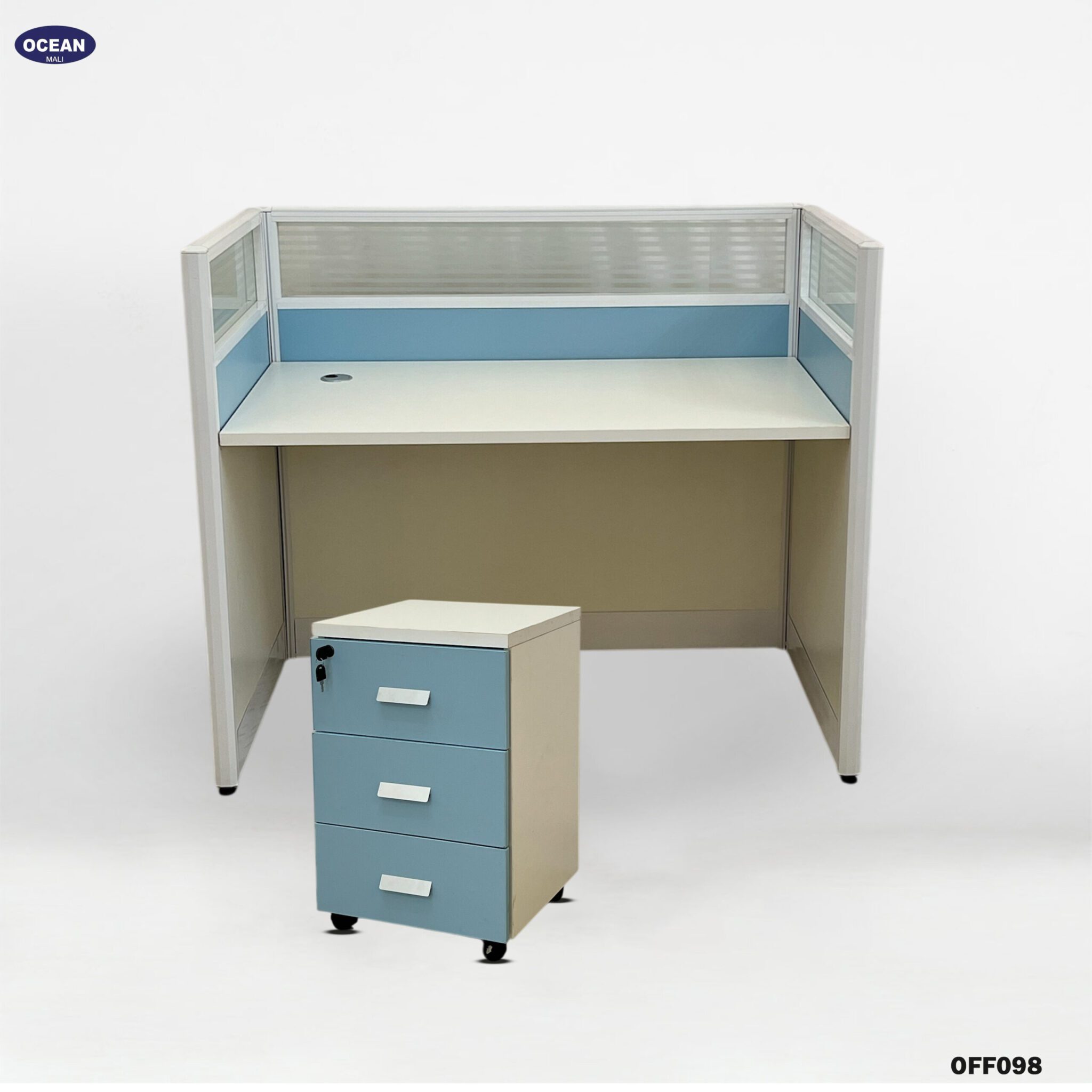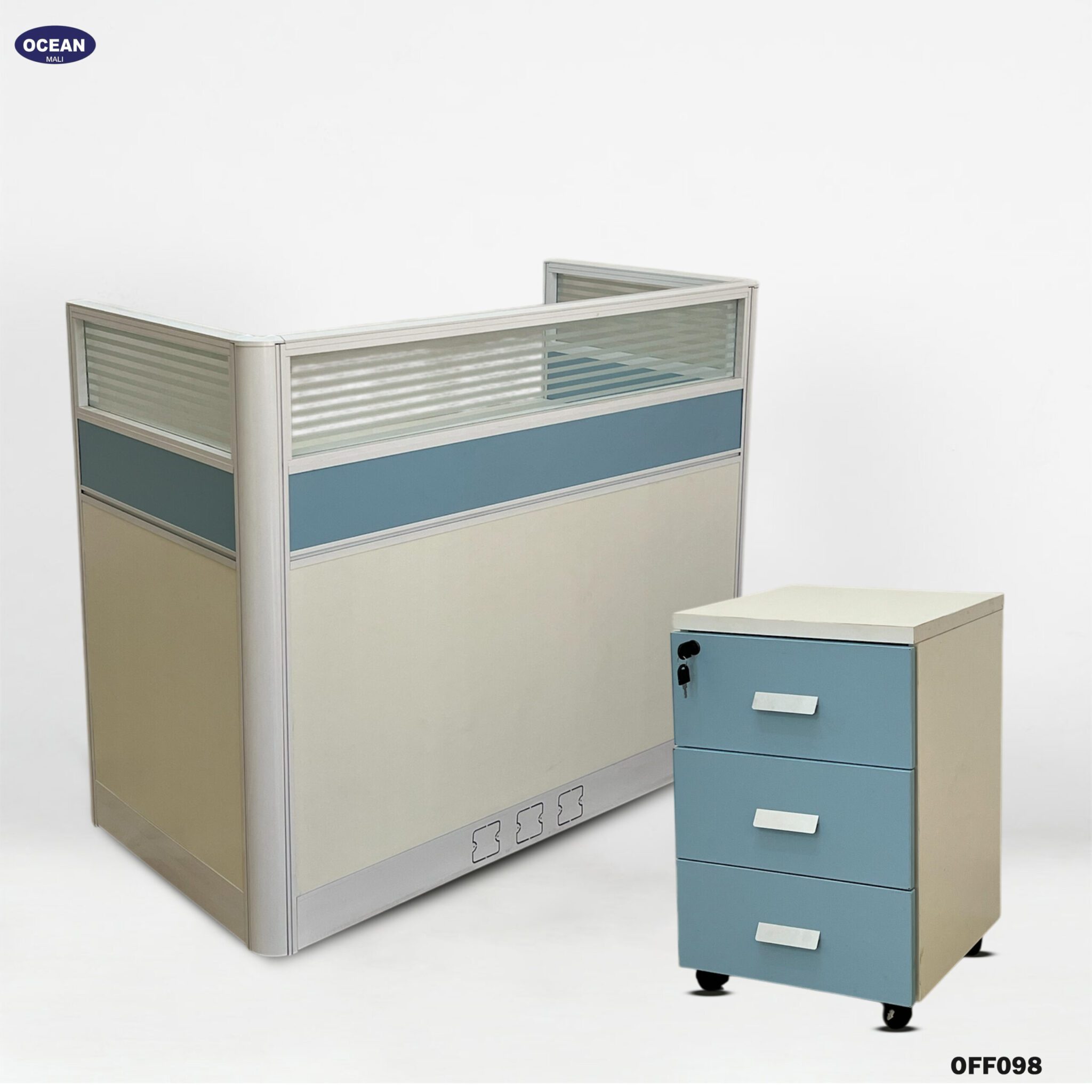 Ce bureau modulable offre un espace de travail confortable et organisé. Le plateau du bureau est fabriqué en bois de haute qualité, offrant une surface de travail spacieuse et durable. La cloison en verre dépoli permet de préserver votre intimité tout en laissant passer la lumière. Le meuble de rangement complémentaire dispose de trois tiroirs pour ranger vos documents et vos effets personnels. Les roulettes permettent de déplacer facilement le meuble. Ce bureau est un choix idéal pour les professionnels à la recherche d’un environnement de travail efficace et esthétique.