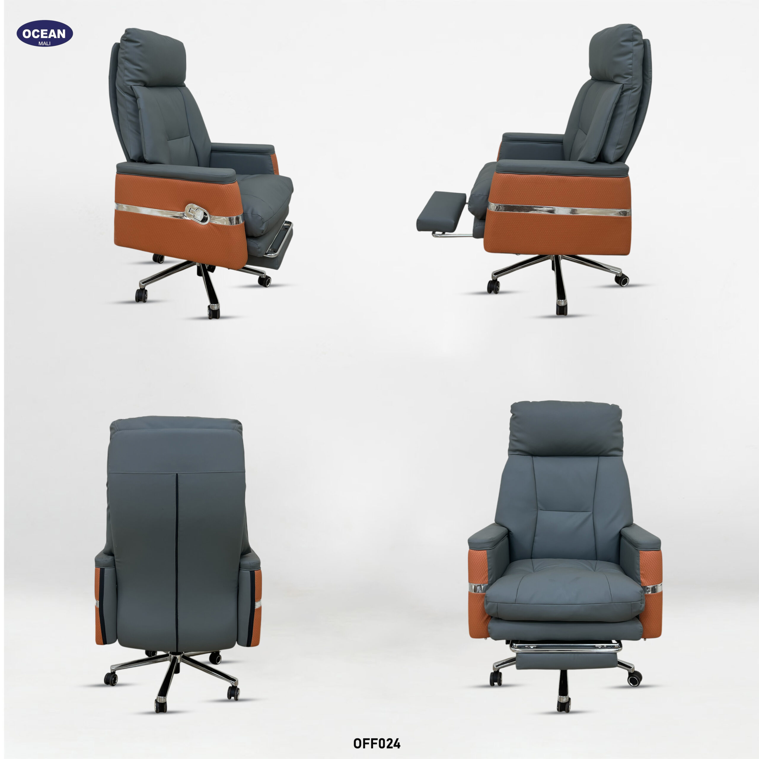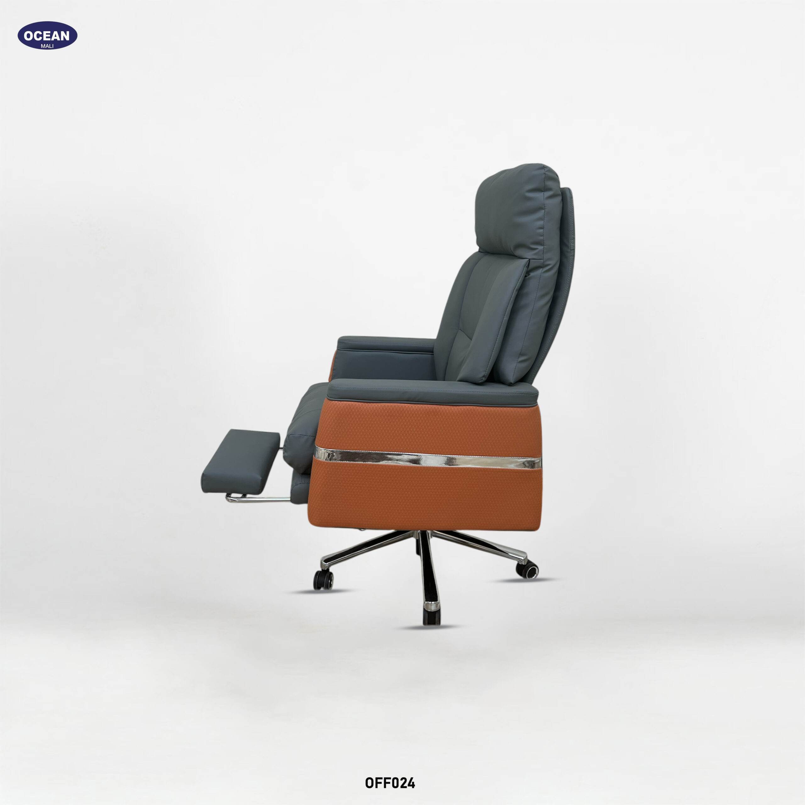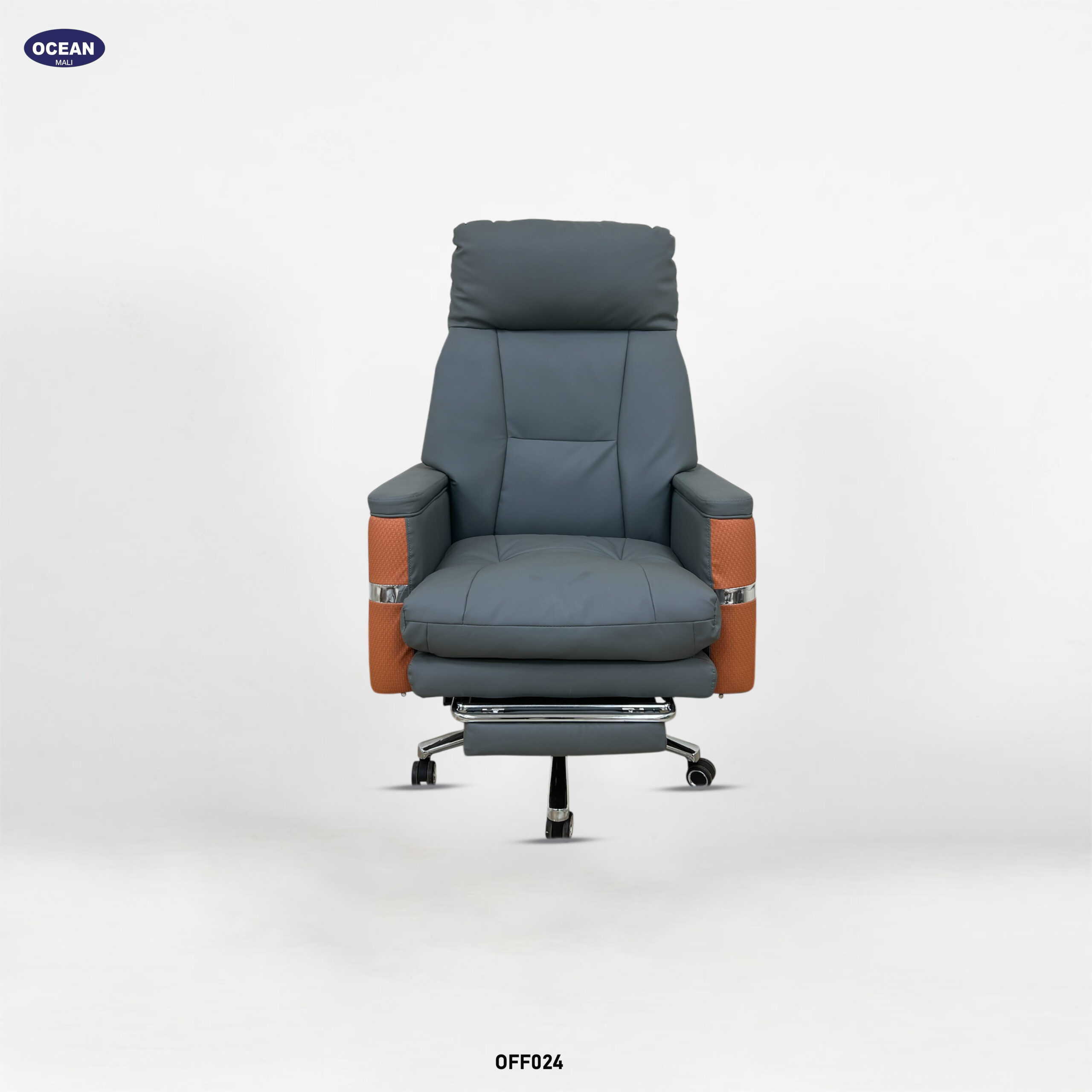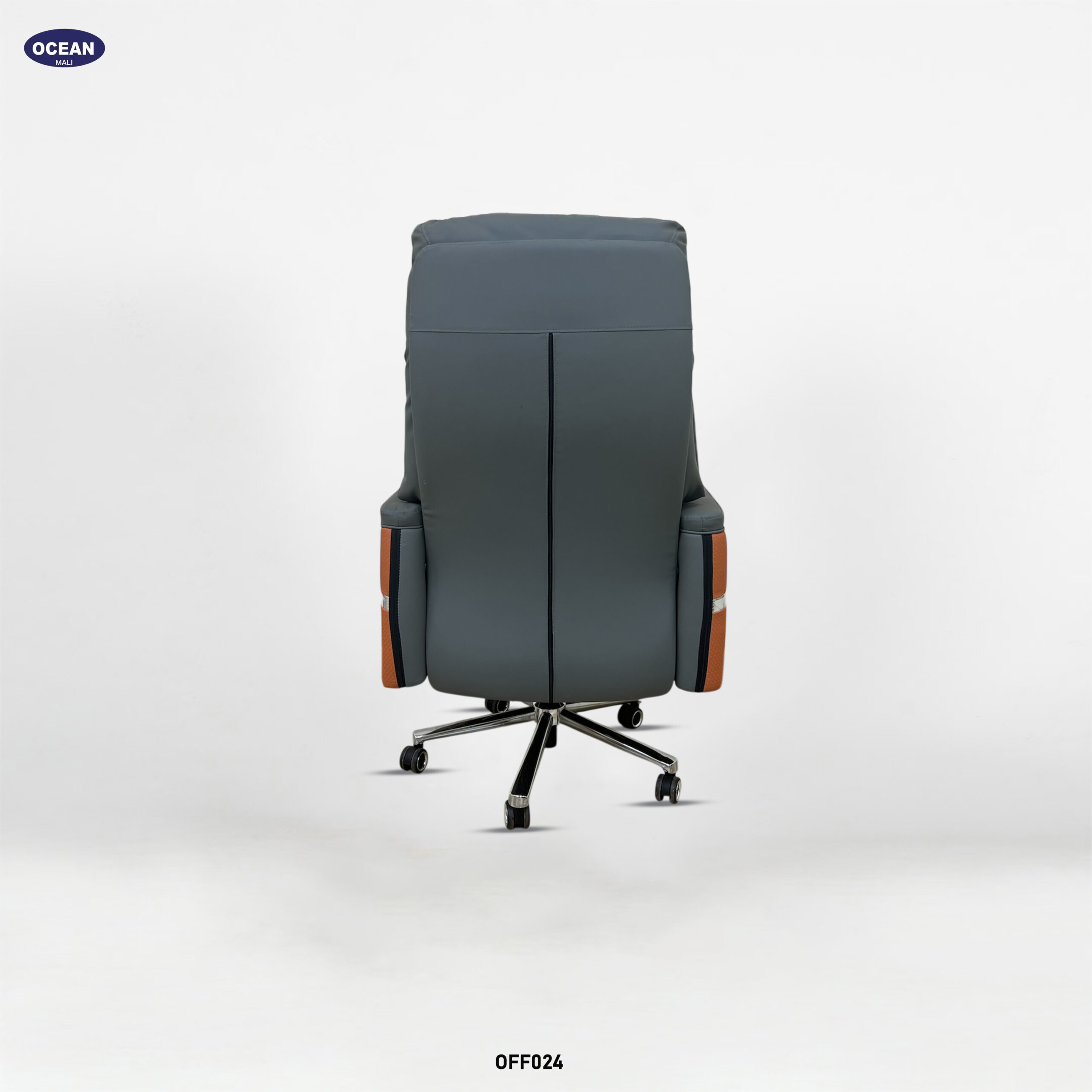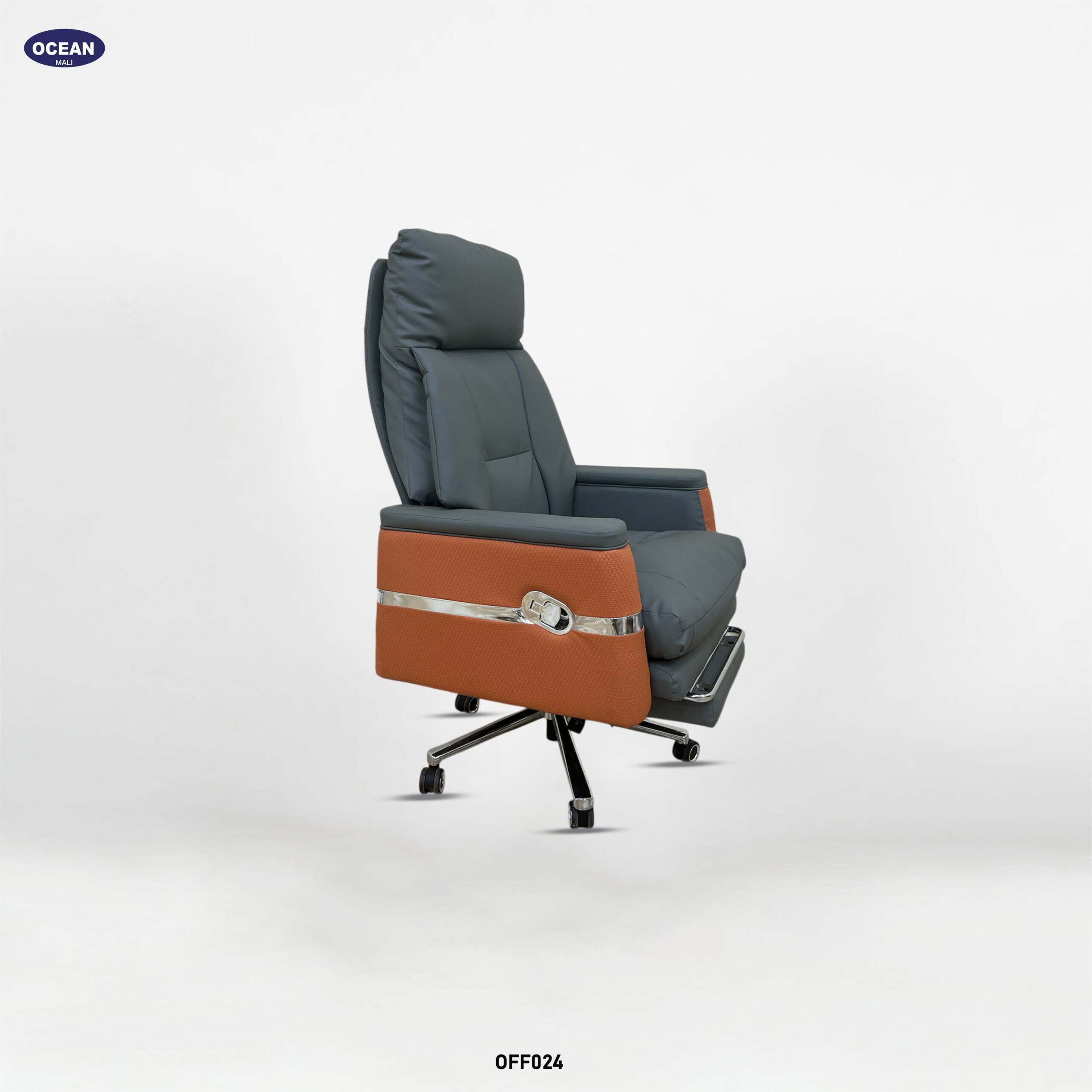 Fauteuil de bureau sophistiqué et confortable, conçu pour un usage professionnel. Il est doté d’un dossier haut segmenté, généreusement rembourré pour le soutien lombaire et lombaire, et comprend généralement un appui-tête intégré ou réglable. Le revêtement est gris et lisse , peut-être en cuir ou en synthétique de haute qualité