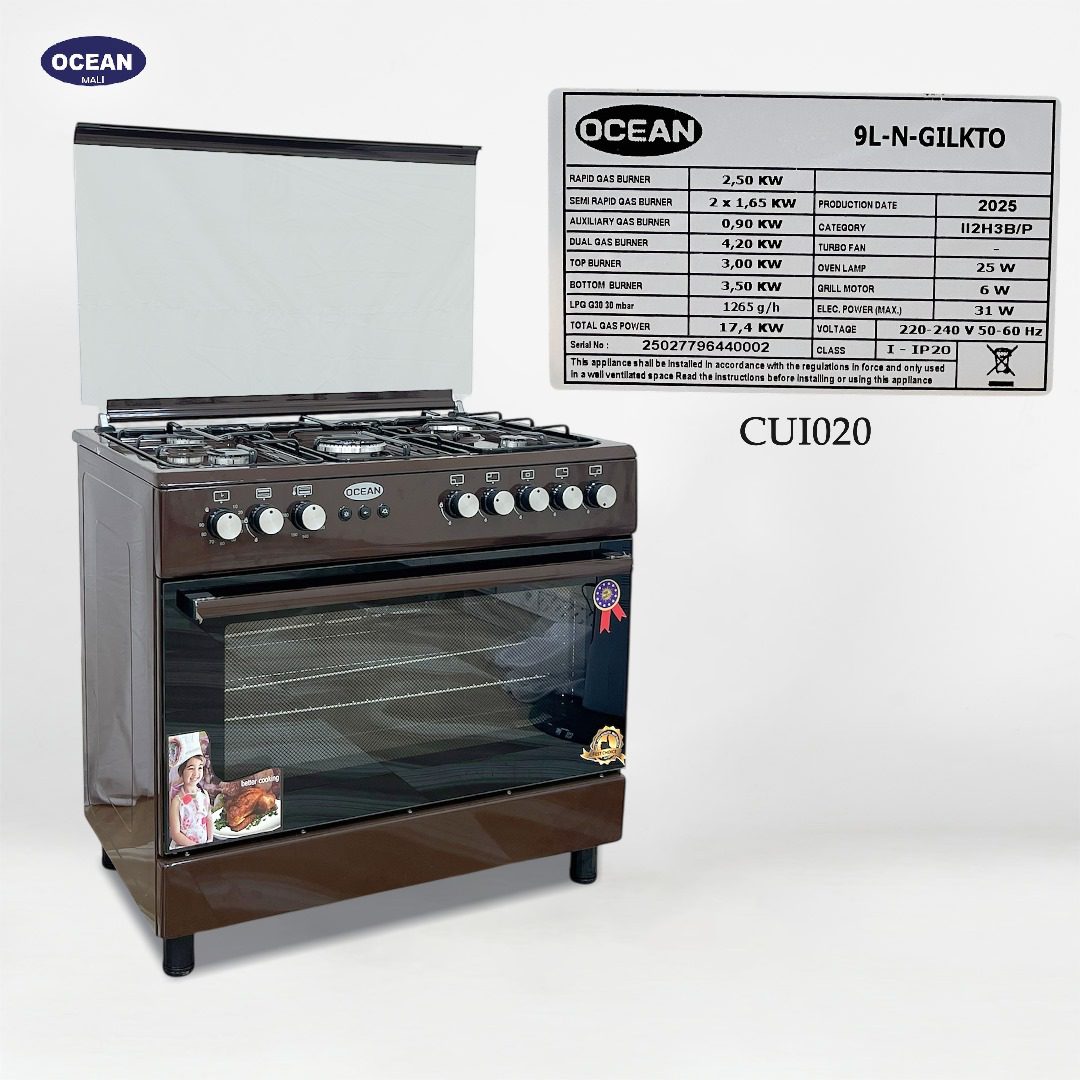 Offrez-vous performance et élégance avec la cuisinière OCEAN 5 feux couleur marron, idéale pour une cuisine pratique et moderne. Équipée de brûleurs puissants (rapide, semi-rapide, auxiliaire et double), elle garantit une cuisson rapide et homogène. Son grand four à gaz avec grill, lumière intérieure et turbo fan vous permet de cuisiner vos plats préférés avec une chaleur bien répartie. Robuste, design et fonctionnelle, elle s’adapte aussi bien aux familles qu’aux professionnels.