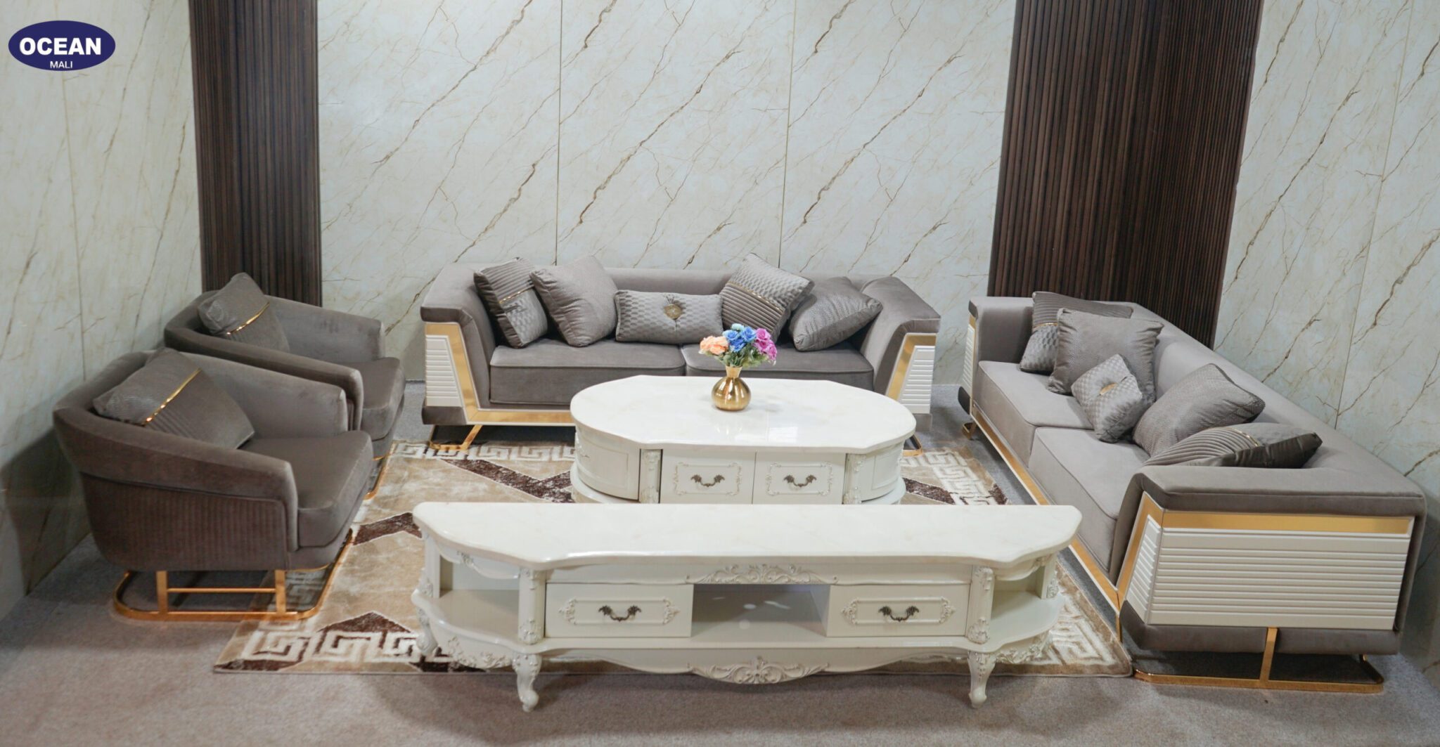 Ce salon raffiné se compose de deux canapés trois places, deux fauteuils assortis et une table basse en bois blanc laqué, ornée de sculptures délicates. Les sièges sont recouverts d’un tissu beige doux, agrémentés de coussins décoratifs texturés et d’accents dorés. La table basse, accompagnée d’une console assortie, est mise en valeur par un vase doré contenant des fleurs multicolores. Le cadre est élégant, avec des murs texturés en marbre et bois, parfait pour un intérieur moderne et chaleureux.