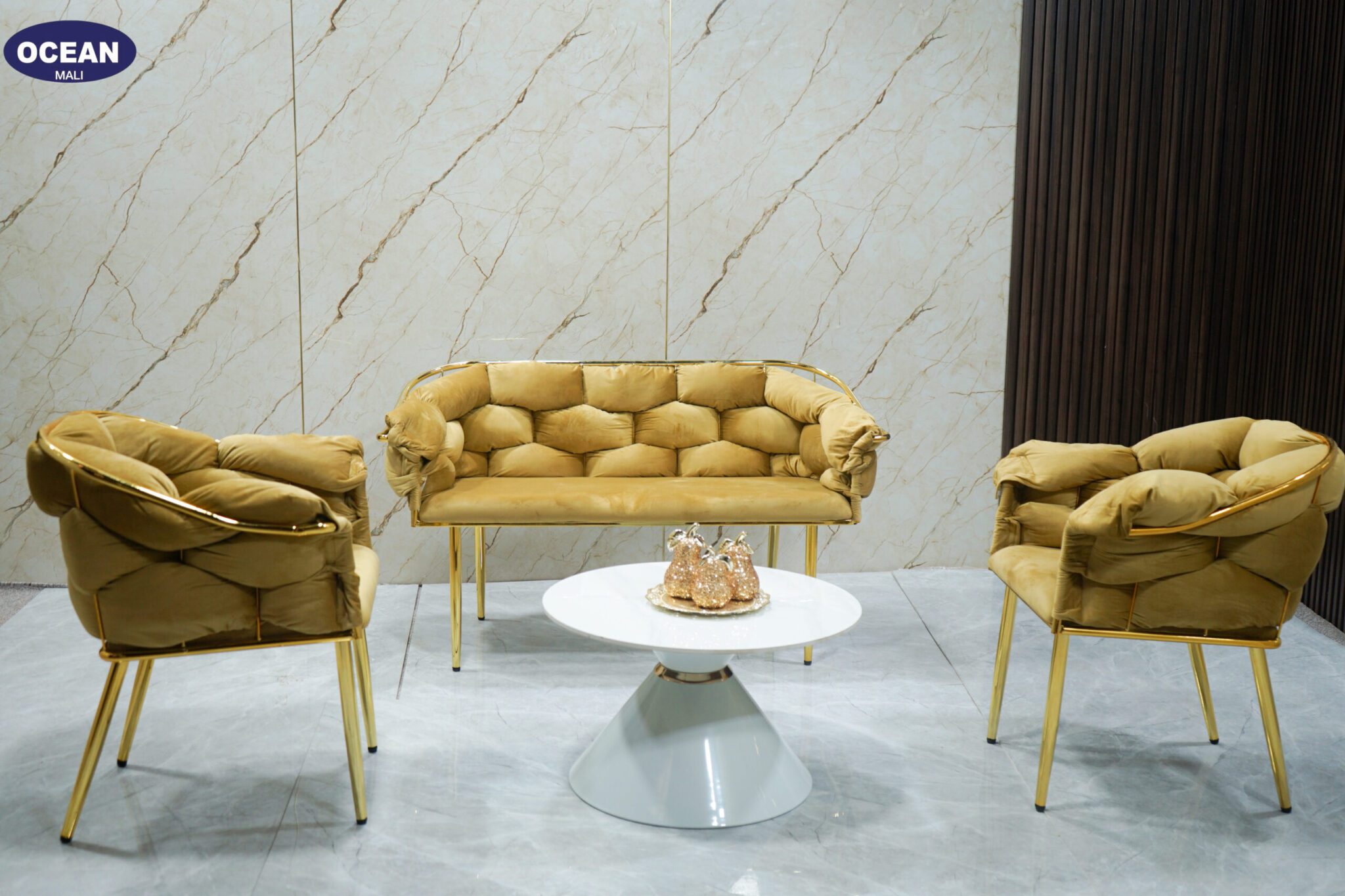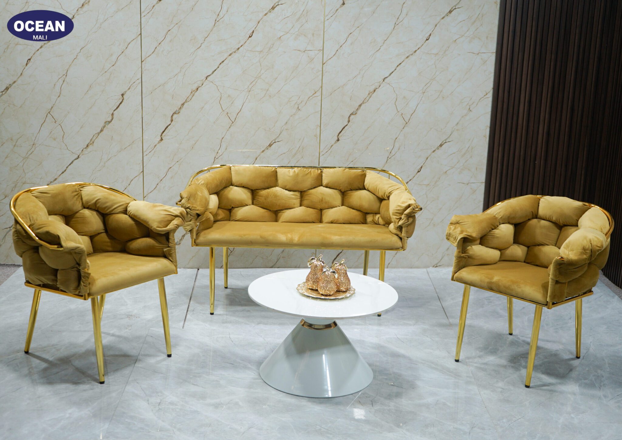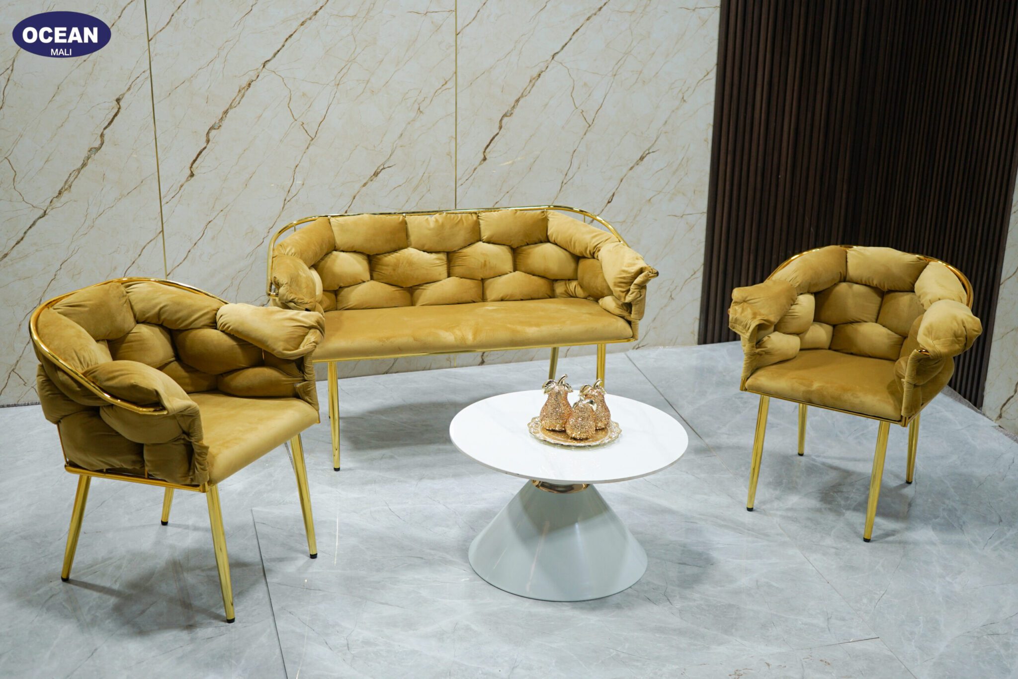 Ensemble de salon luxueux composé d’un canapé deux places et de deux fauteuils au design capitonné unique. Le velours jaune moutarde et les pieds dorés créent une ambiance à la fois élégante et chaleureuse. Parfait pour apporter une touche d’originalité à votre intérieur.