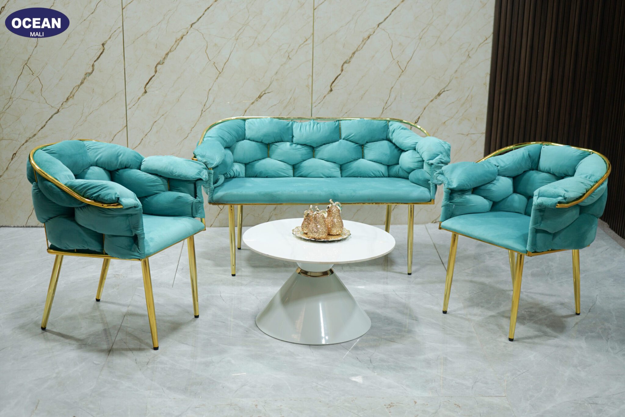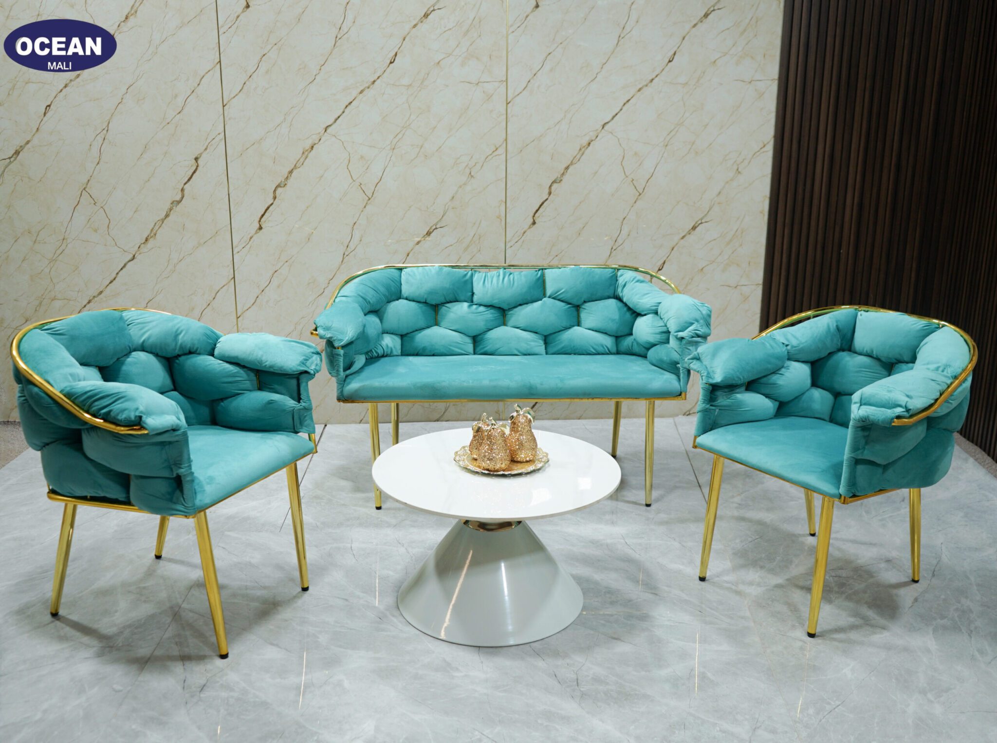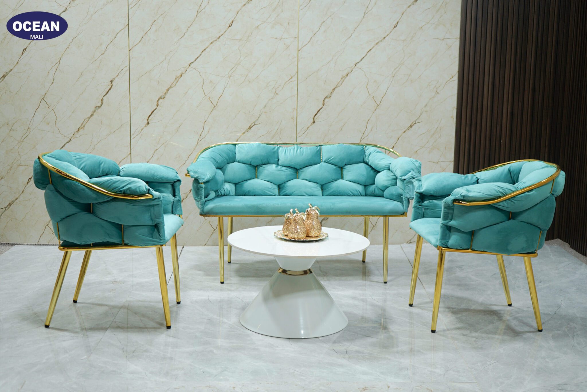 Ensemble de salon luxueux composé d’un canapé deux places et de deux fauteuils au design capitonné unique. Le velours turquoise et les pieds dorés créent une ambiance à la fois élégante et chaleureuse. Parfait pour apporter une touche d’originalité à votre intérieur.