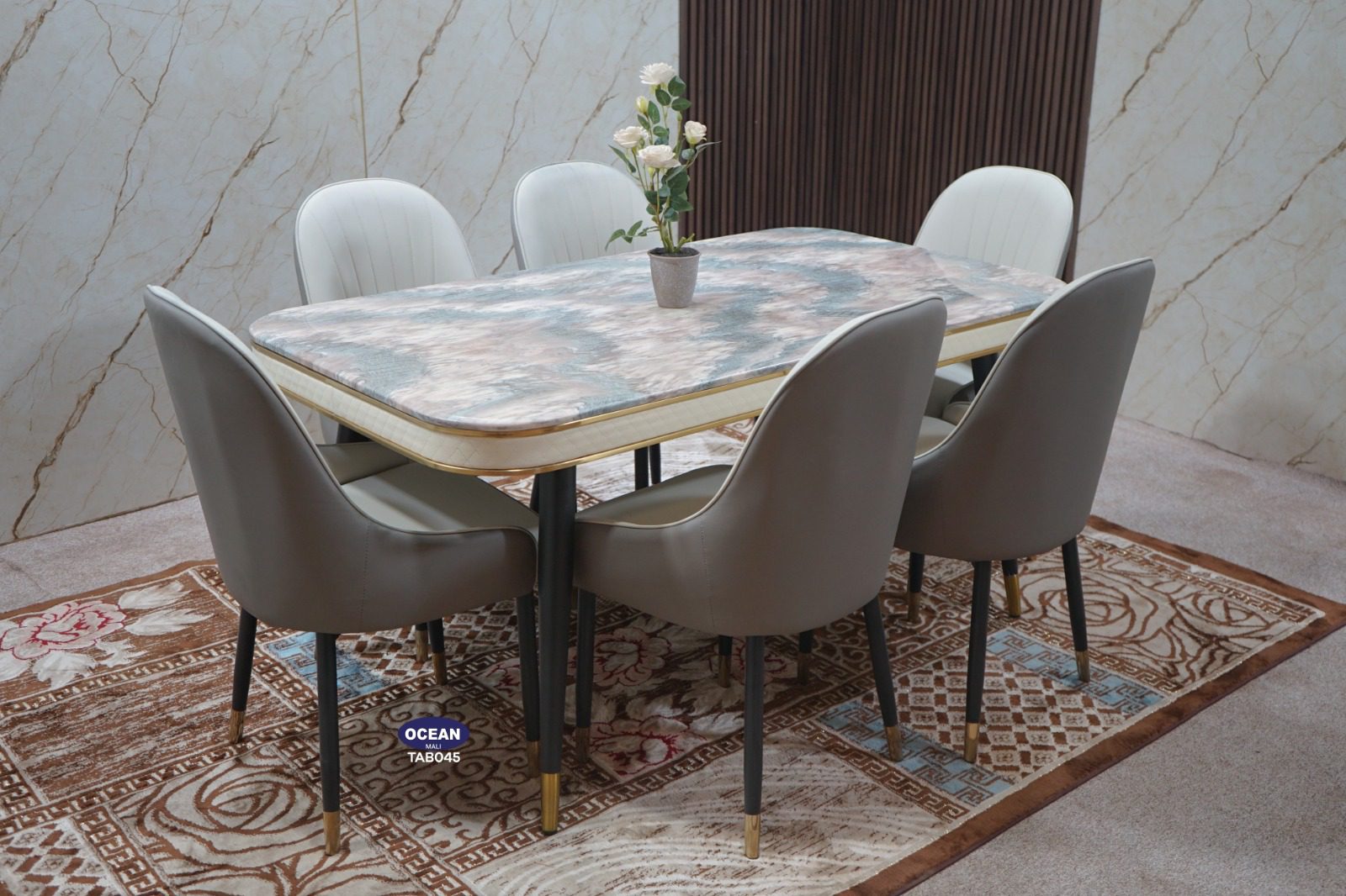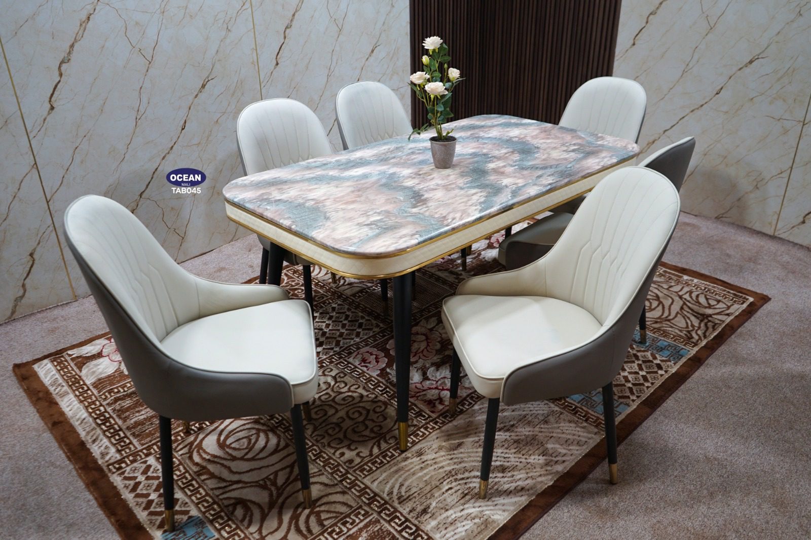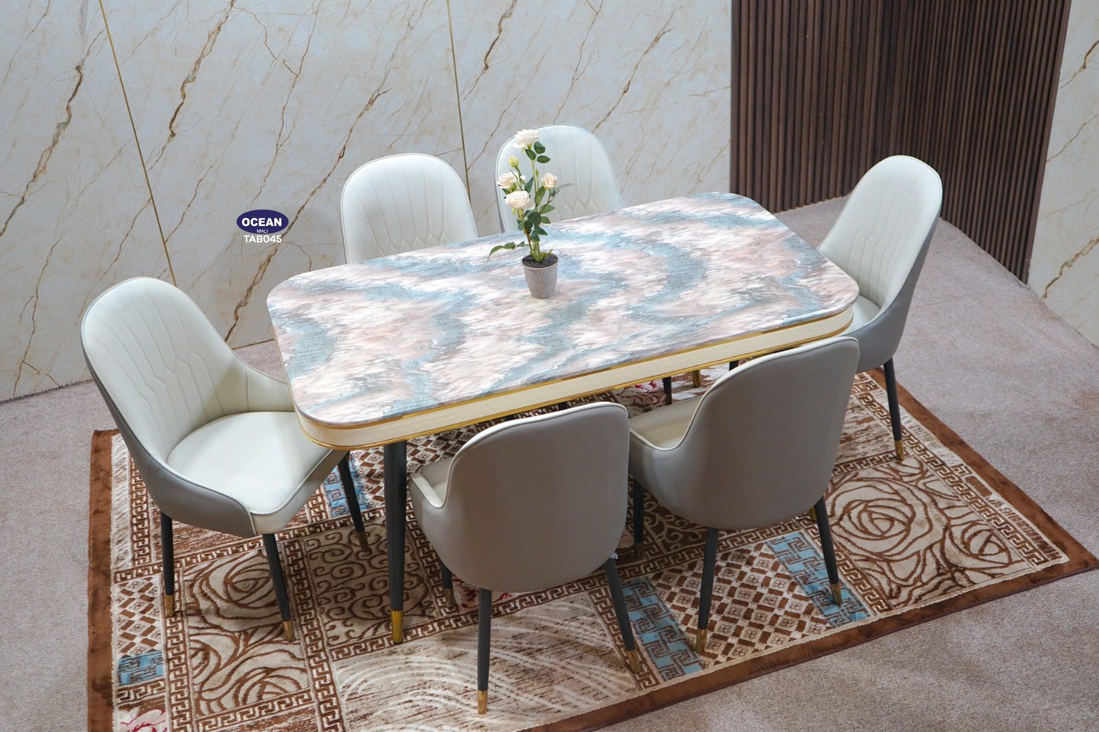 Laissez-vous séduire par l’originalité de l’ensemble Océan de Quartz, une pièce de mobilier qui transforme chaque repas en une expérience visuelle unique. Ce modèle se distingue par son plateau audacieux qui semble capturer le mouvement des vagues et des minéraux.