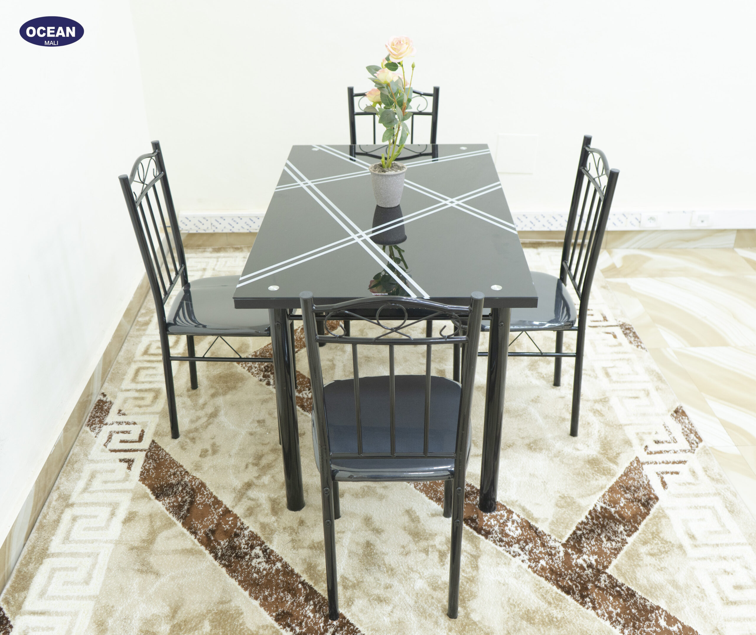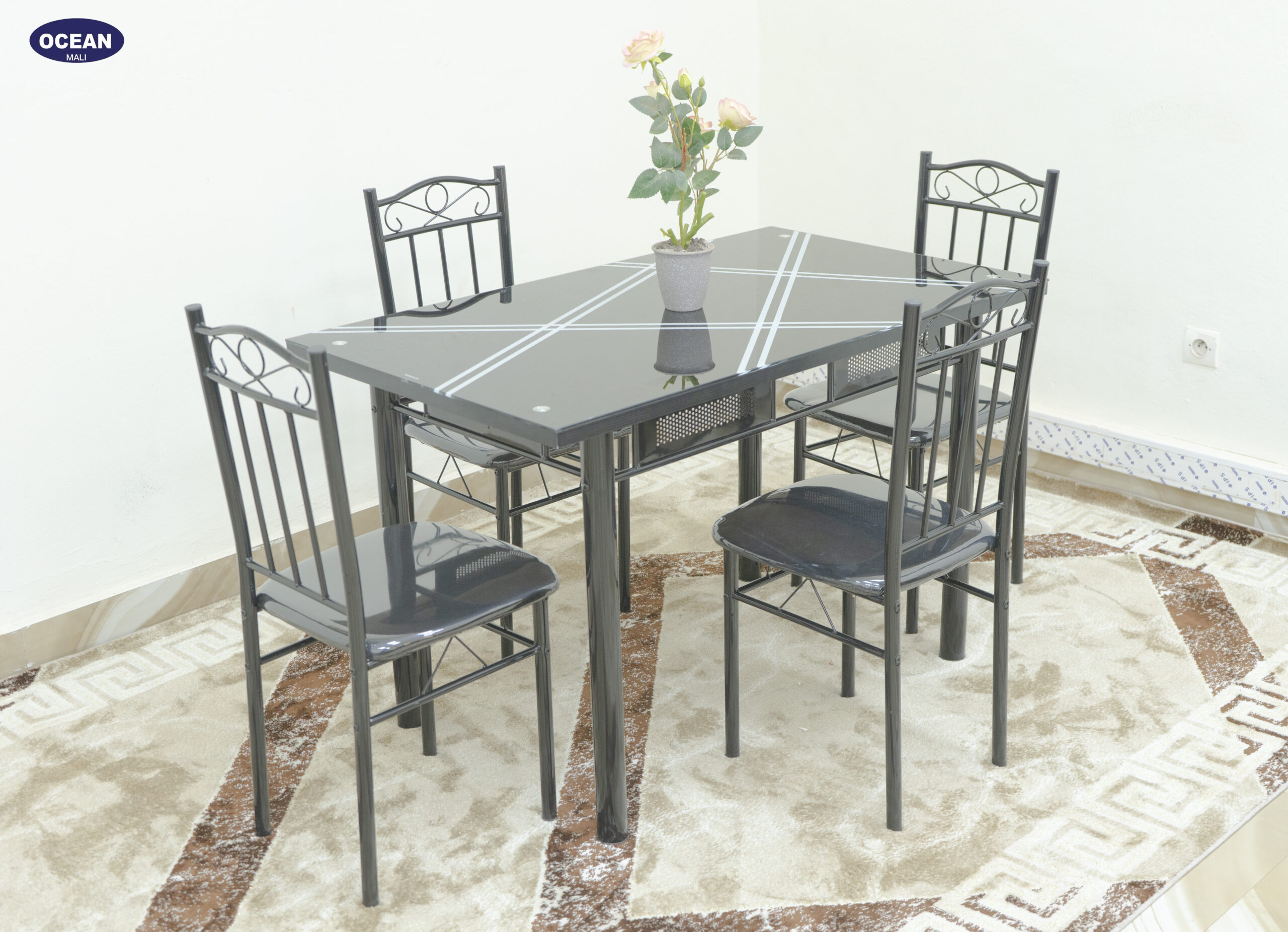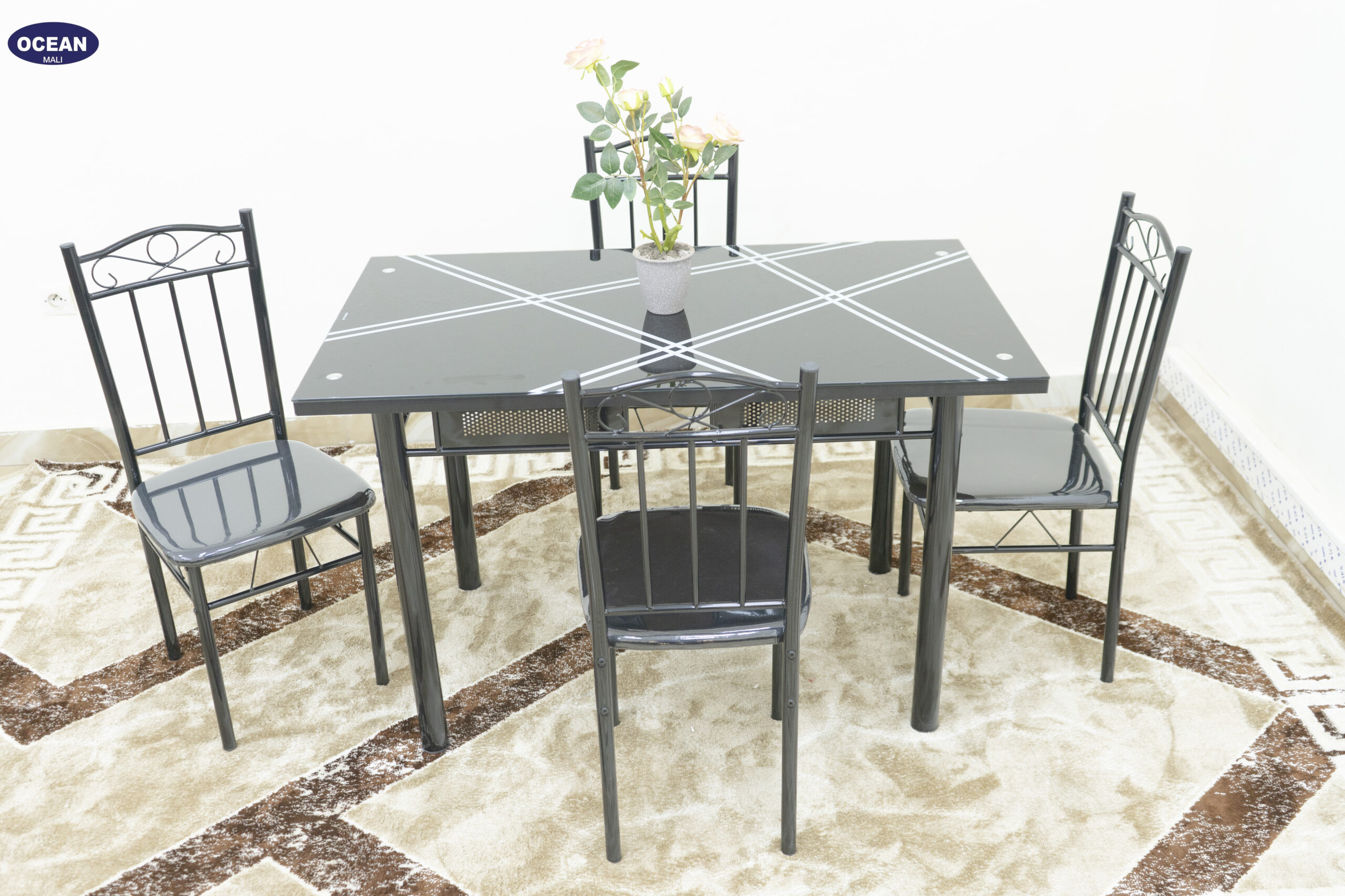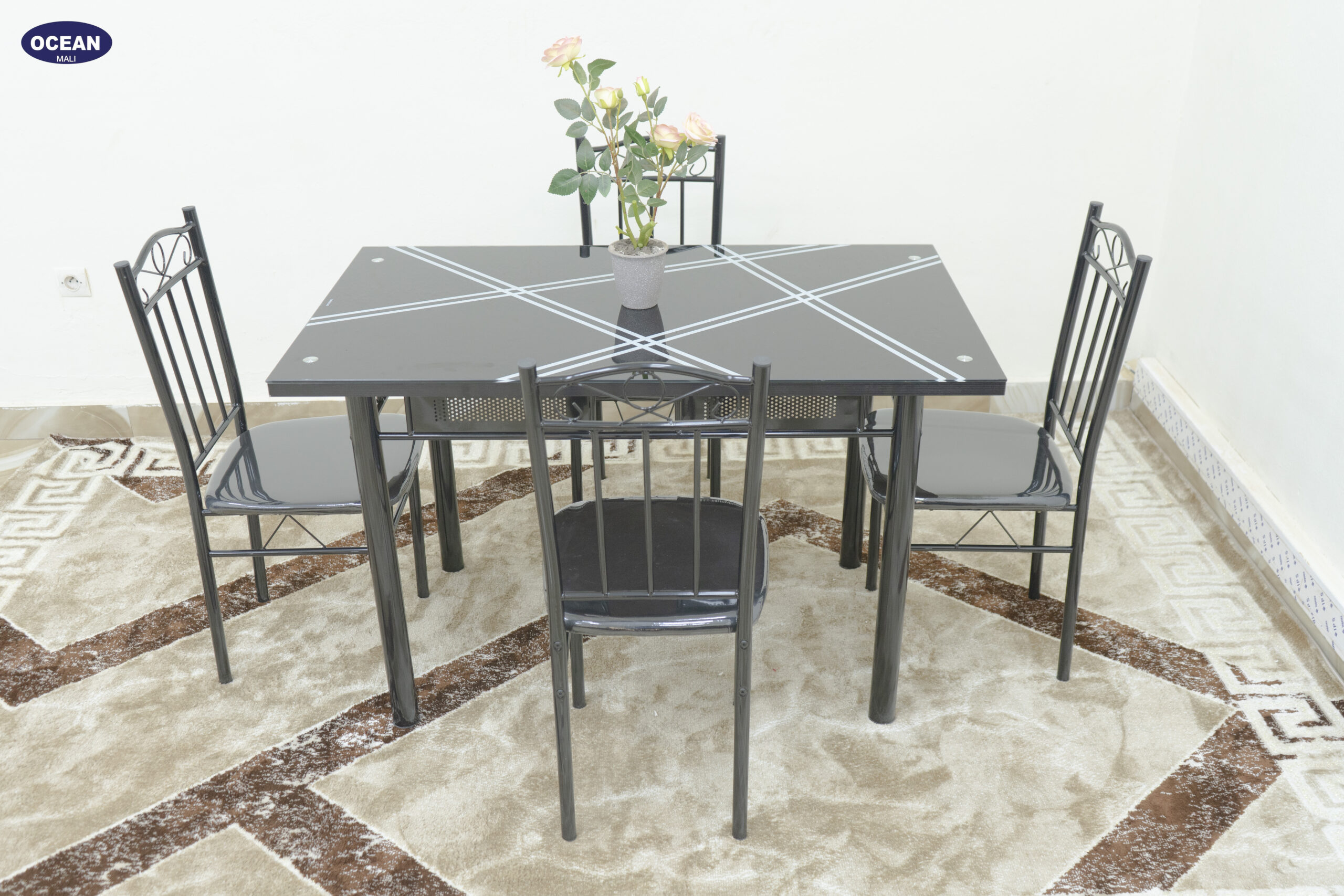 L’ensemble repas “Lignes Noires” est une solution moderne et élégante pour votre salle à manger. Il se compose d’une table carrée au plateau noir orné de lignes graphiques claires, apportant une touche d’originalité à votre intérieur. La structure en métal noir assure stabilité et durabilité, tout en conservant une esthétique épurée.