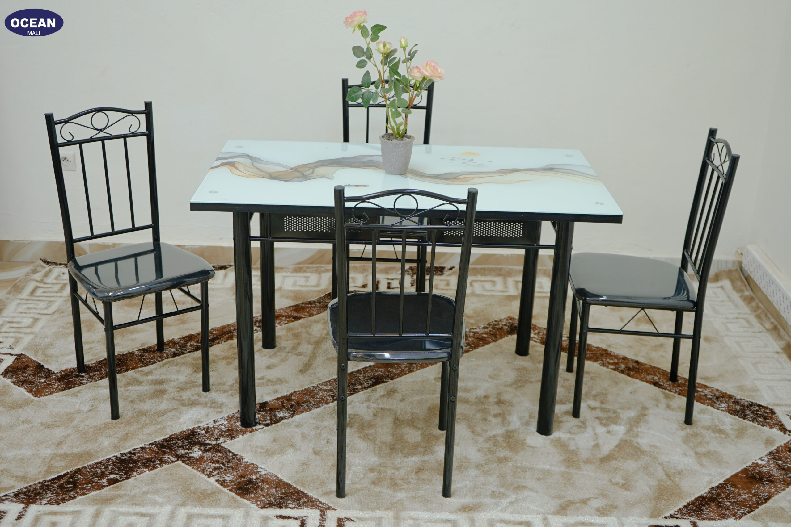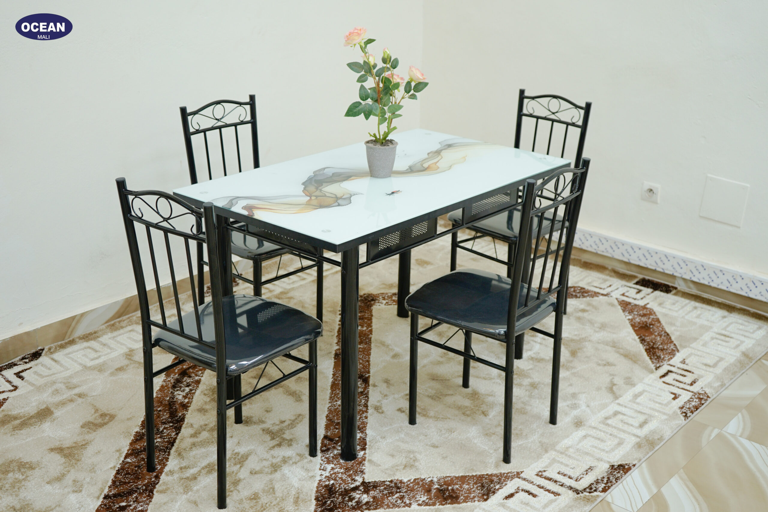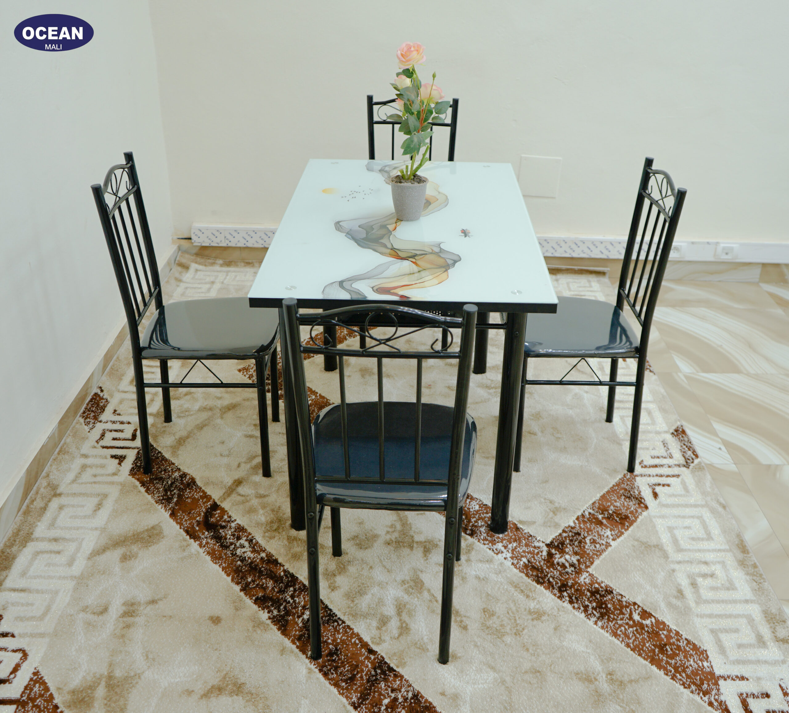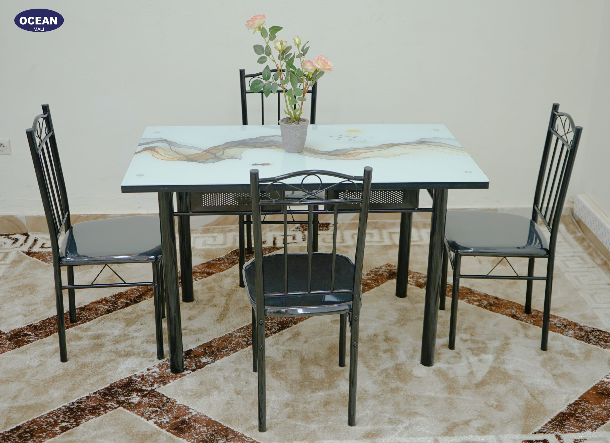 L’ensemble repas “Nébuleuse Moderne” apporte une touche d’originalité et de sophistication à votre salle à manger. Il se compose d’une table carrée au plateau unique, orné d’un motif abstrait évoquant une nébuleuse aux teintes douces et contrastées. La structure en métal noir assure une stabilité solide tout en conservant une esthétique épurée et contemporaine.