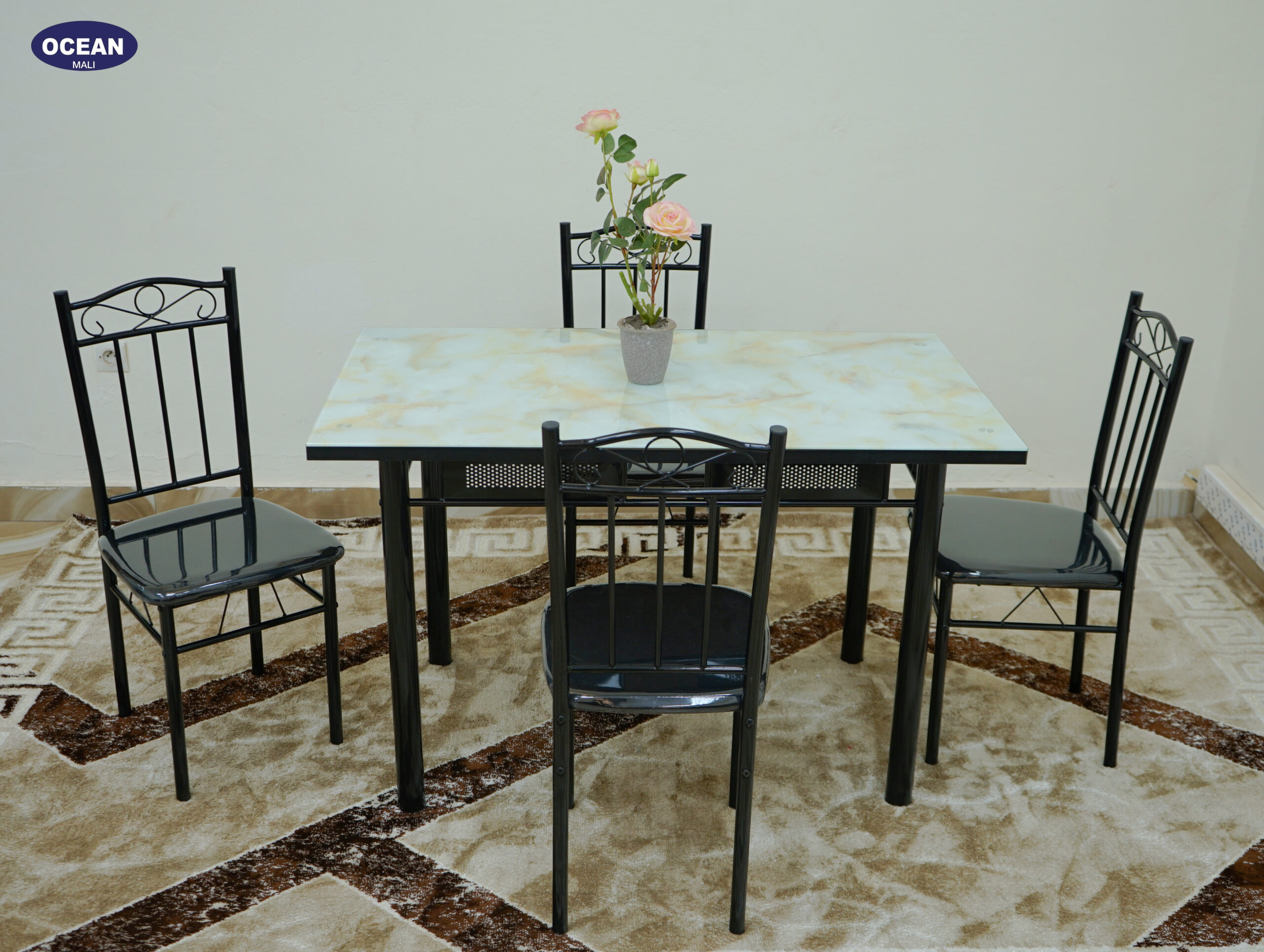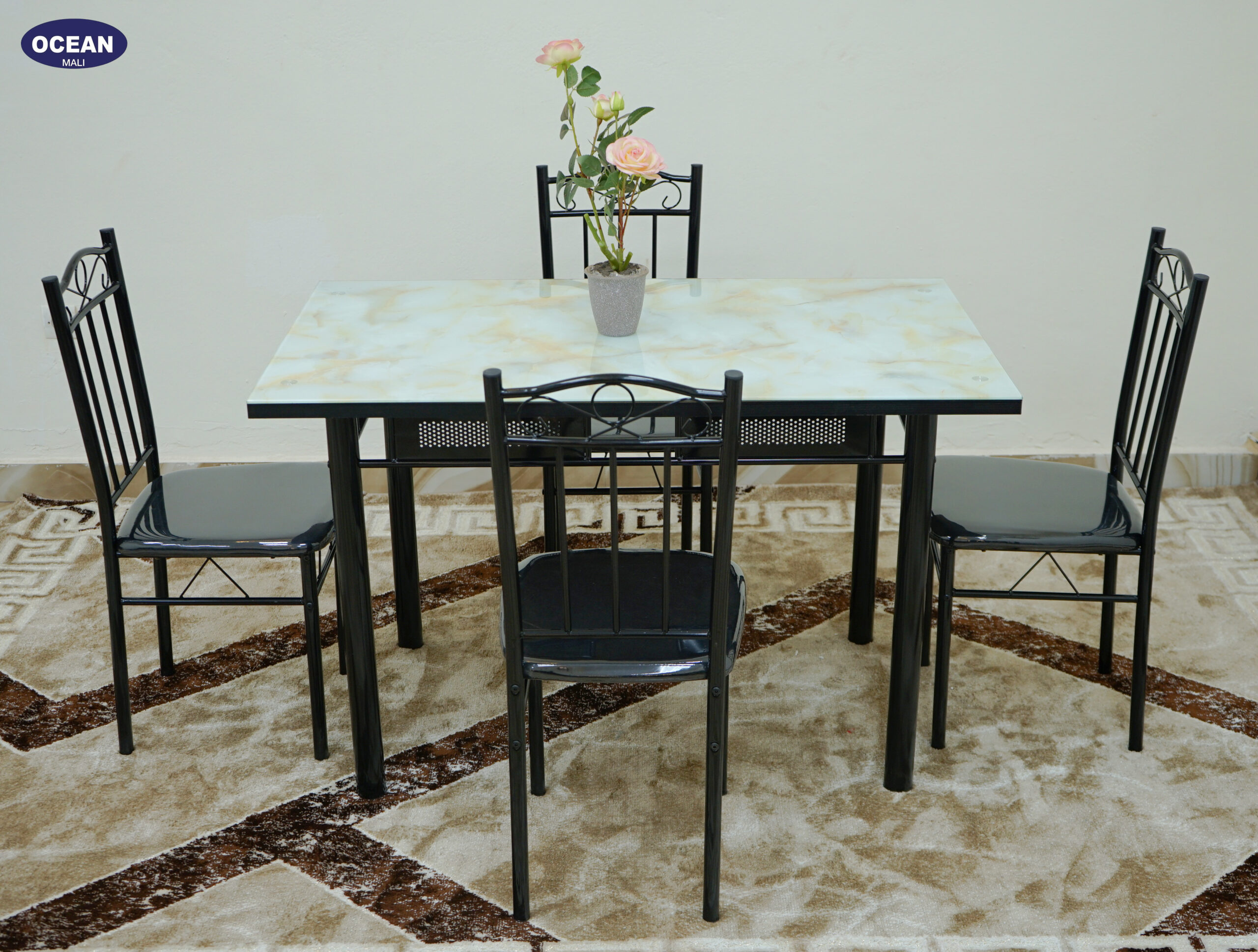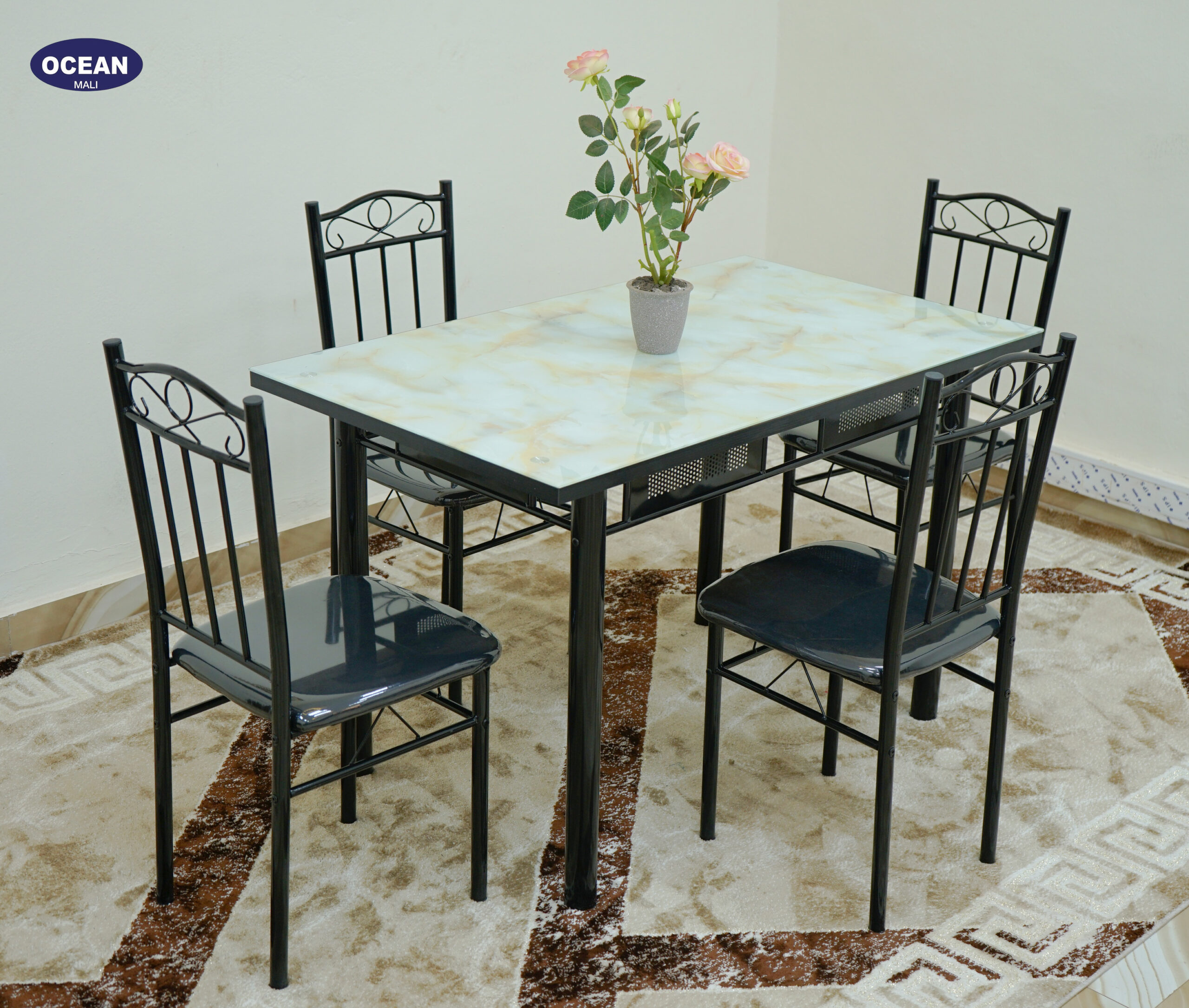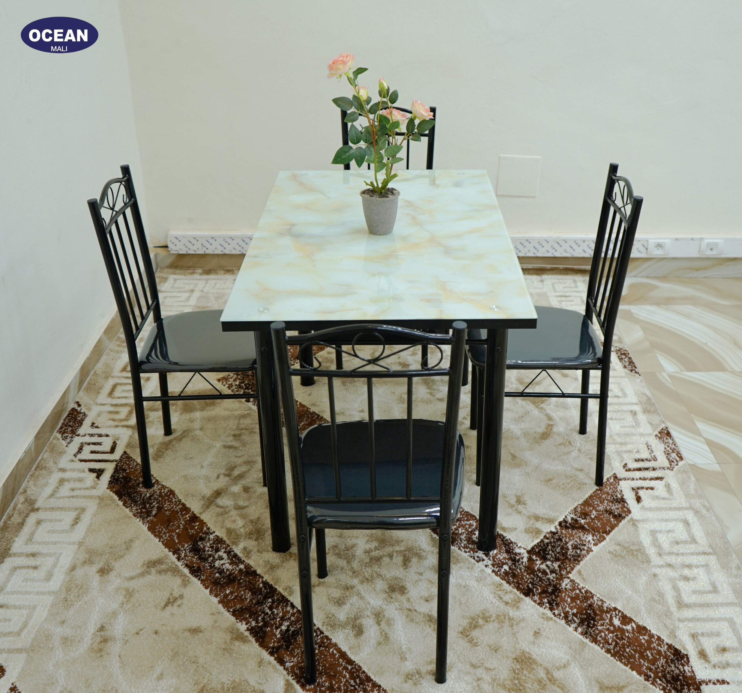 L’ensemble repas “Pierre Claire” apporte une touche de luminosité et d’élégance à votre salle à manger. Il se compose d’une table carrée au plateau effet pierre claire, avec des nuances douces et subtiles qui apportent une touche naturelle à votre intérieur. La structure en métal noir assure une stabilité solide tout en conservant une esthétique épurée et contemporaine.