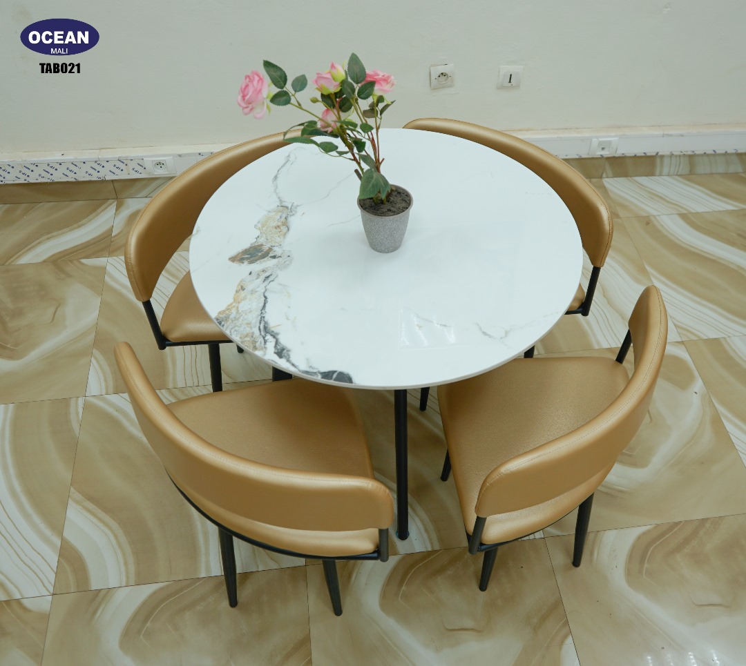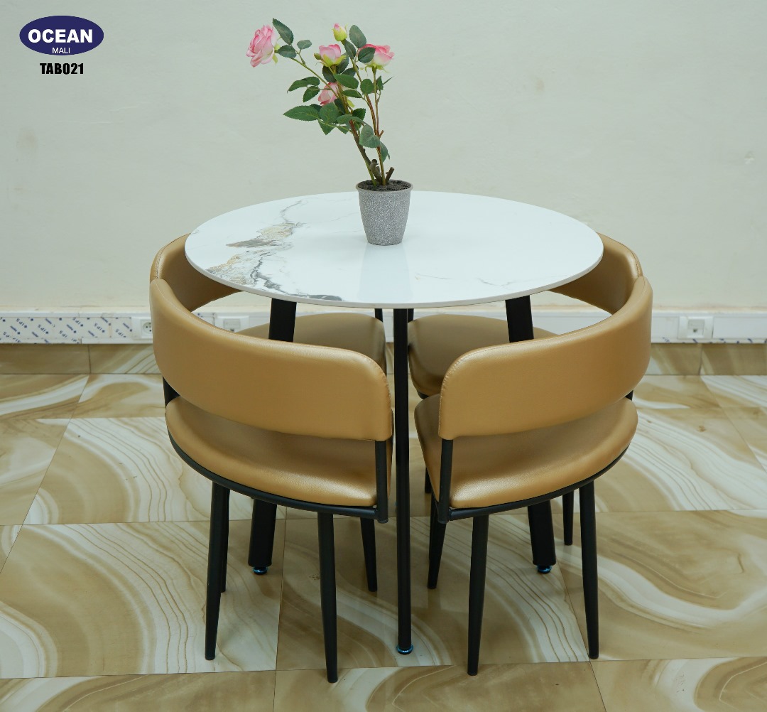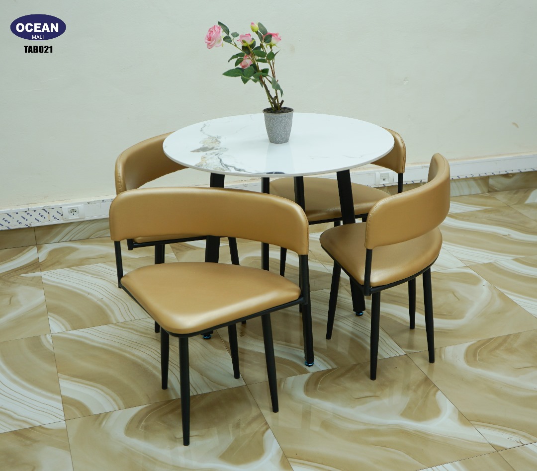 Cet ensemble se compose d’une charmante table ronde au plateau en marbre blanc veiné, reposant sur un piètement robuste noir, alliant ainsi durabilité et raffinement. Elle est accompagnée de quatre chaises confortables au design épuré, dotées d’une assise et d’un dossier recouverts d’un similicuir couleur caramel doré, offrant un contraste chaleureux et un confort optimal. Les pieds fins et solides en métal noir des chaises complètent l’esthétique contemporaine de l’ensemble.