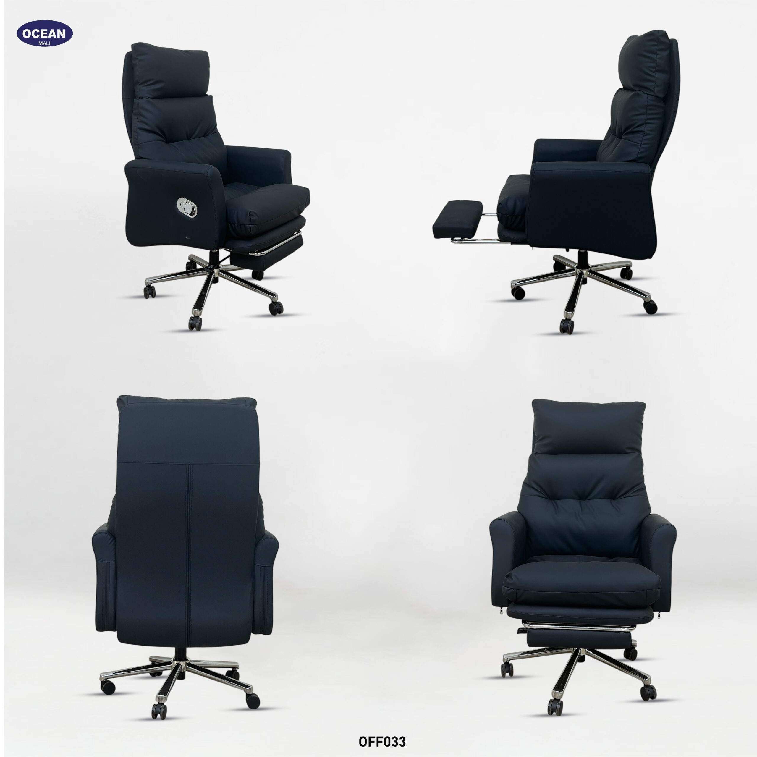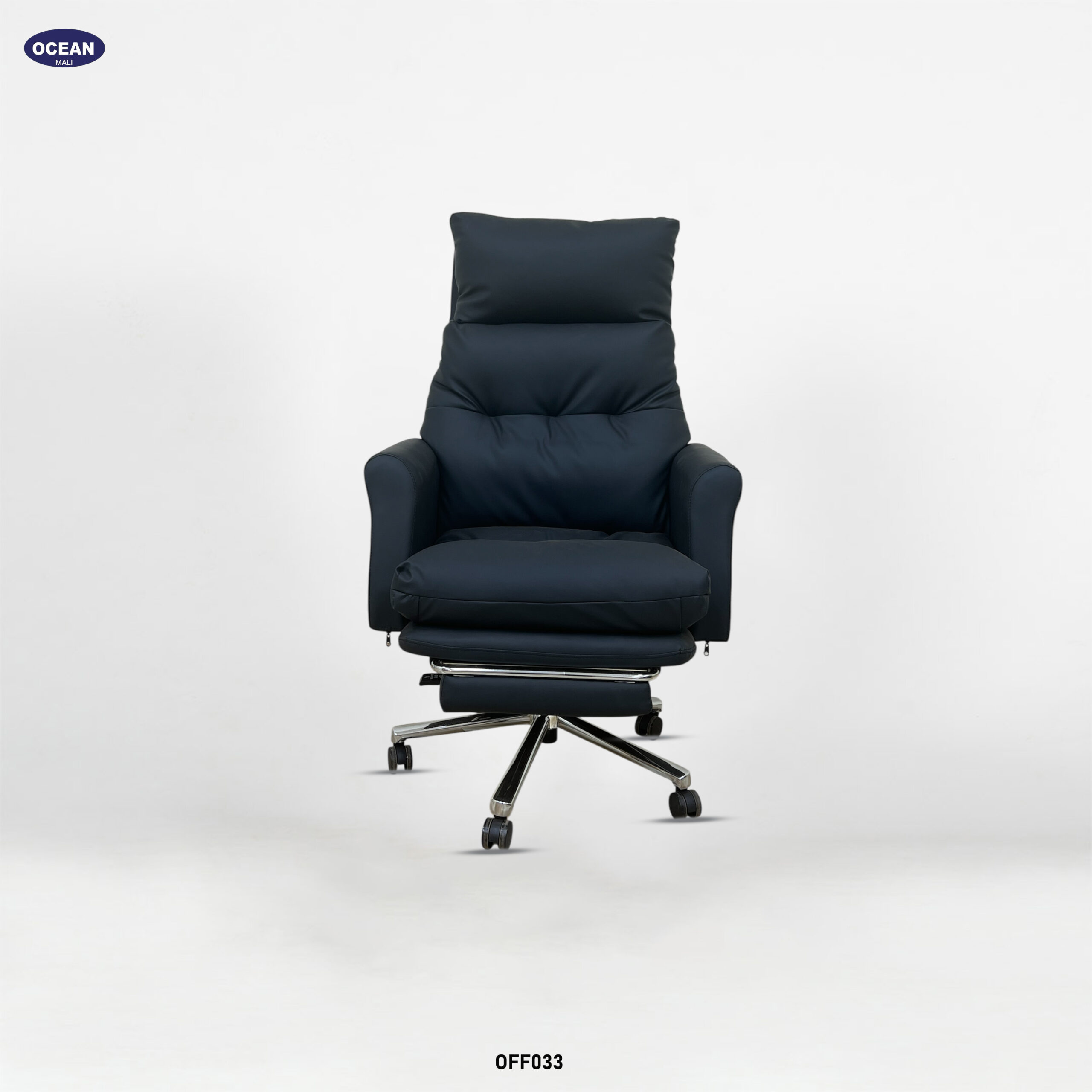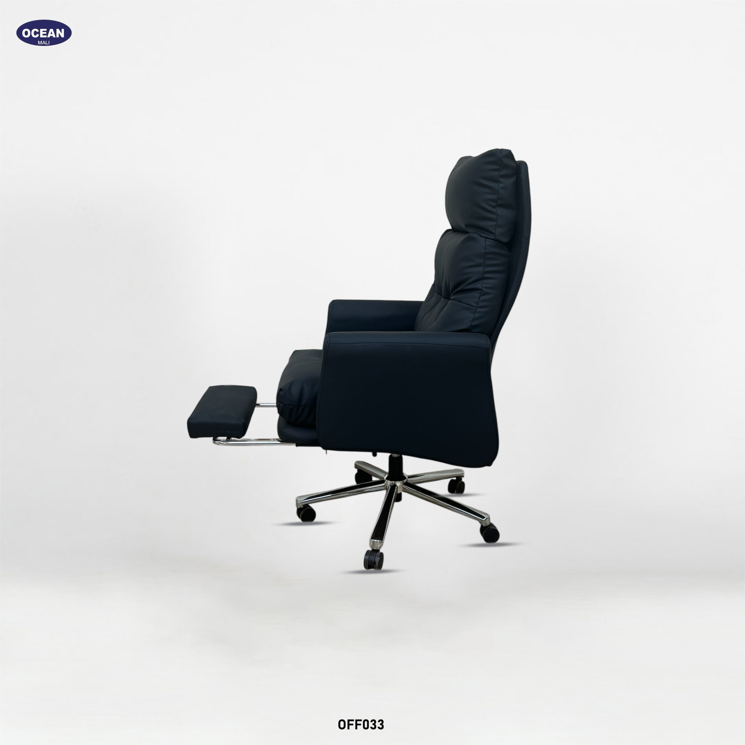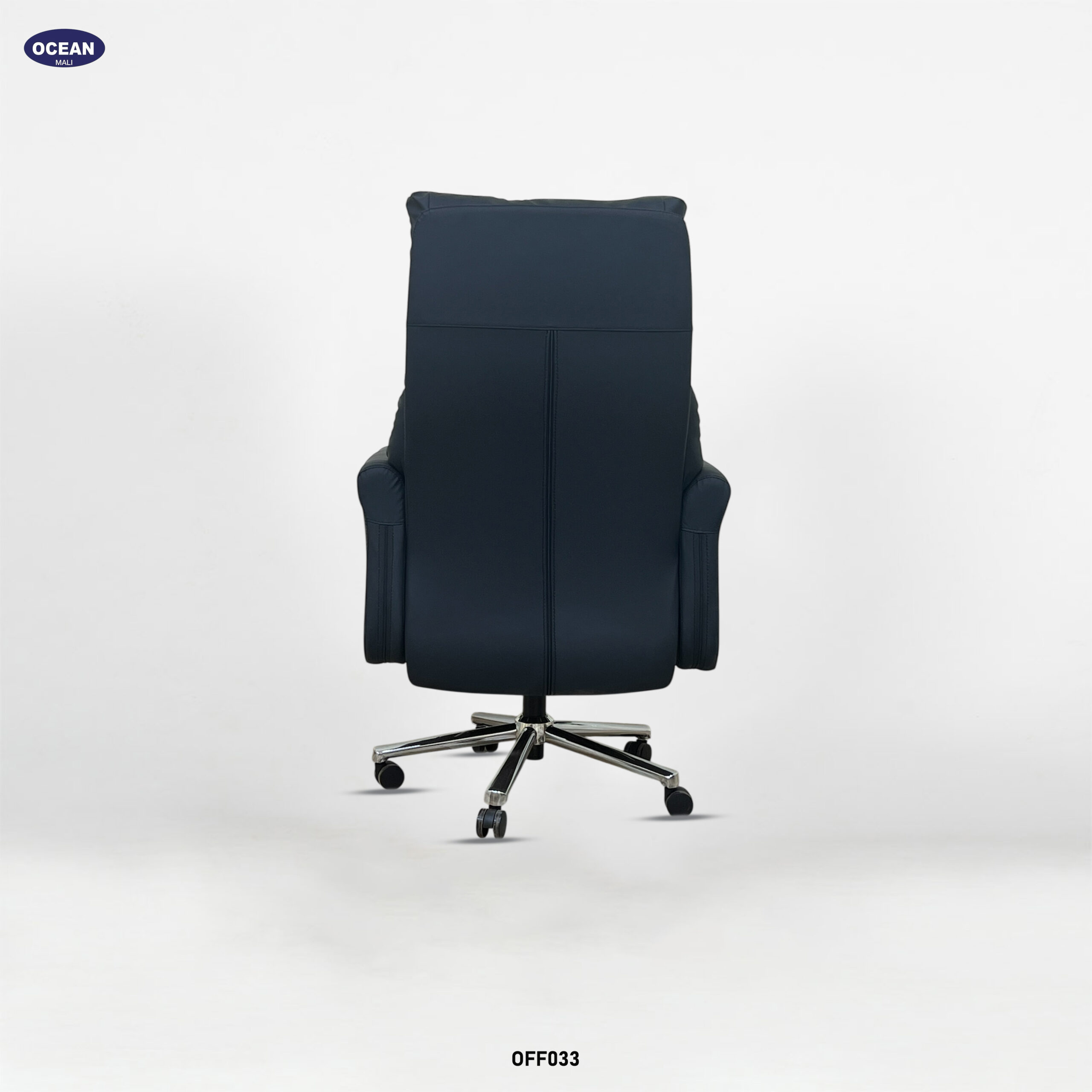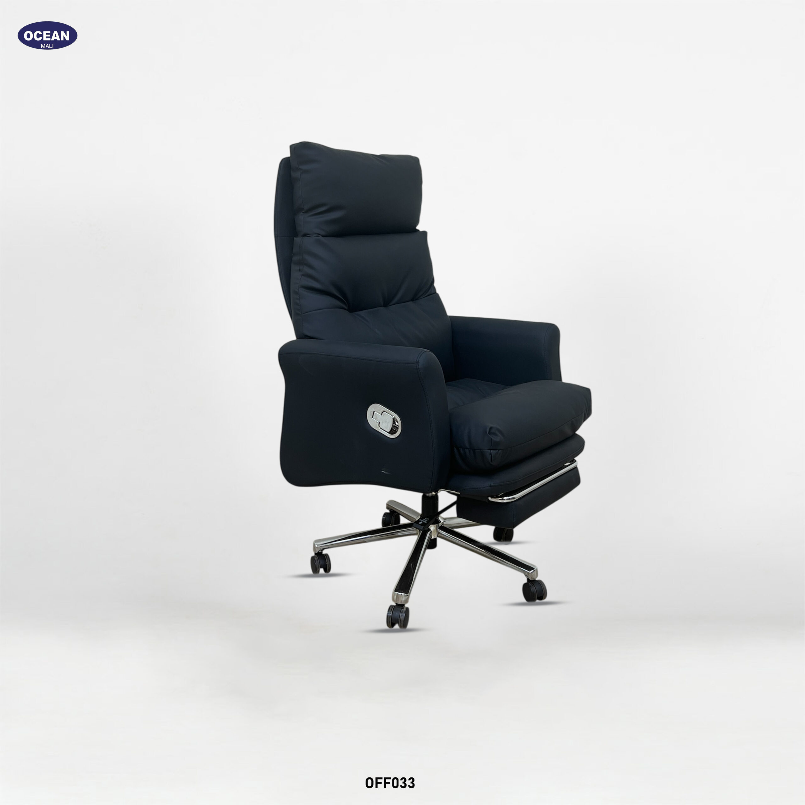 Ce fauteuil de bureau luxueux et généreusement rembourré est conçu pour un confort optimal. Son dossier haut et profondément rembourré, avec des segments horizontaux proéminents, offre un excellent soutien du dos et de la nuque. Revêtu d’un tissu noir profond , généralement du cuir ou un synthétique de haute qualité, il lui confère une allure élégante et imposante.