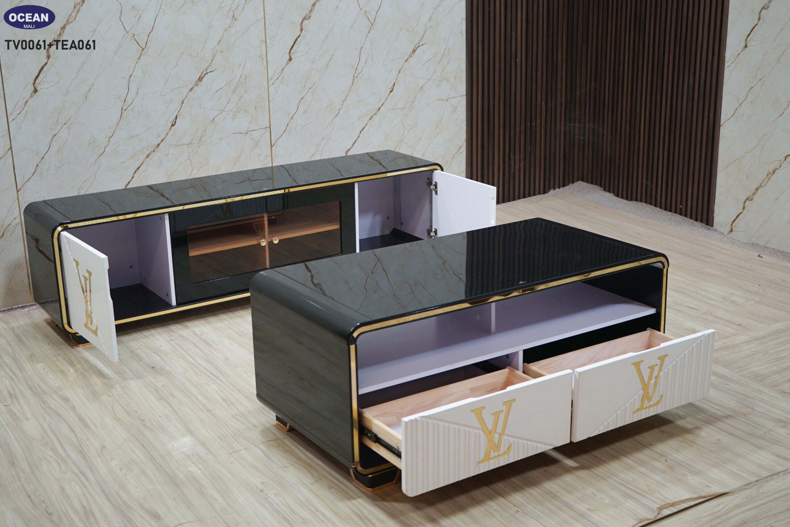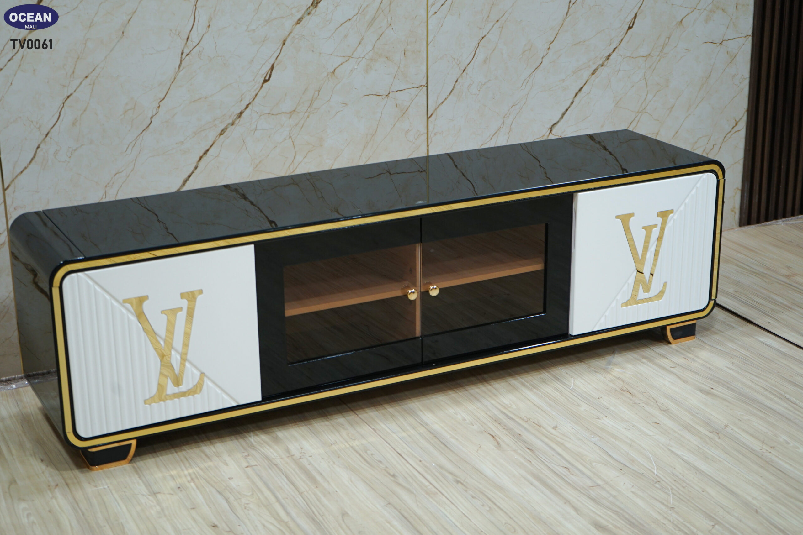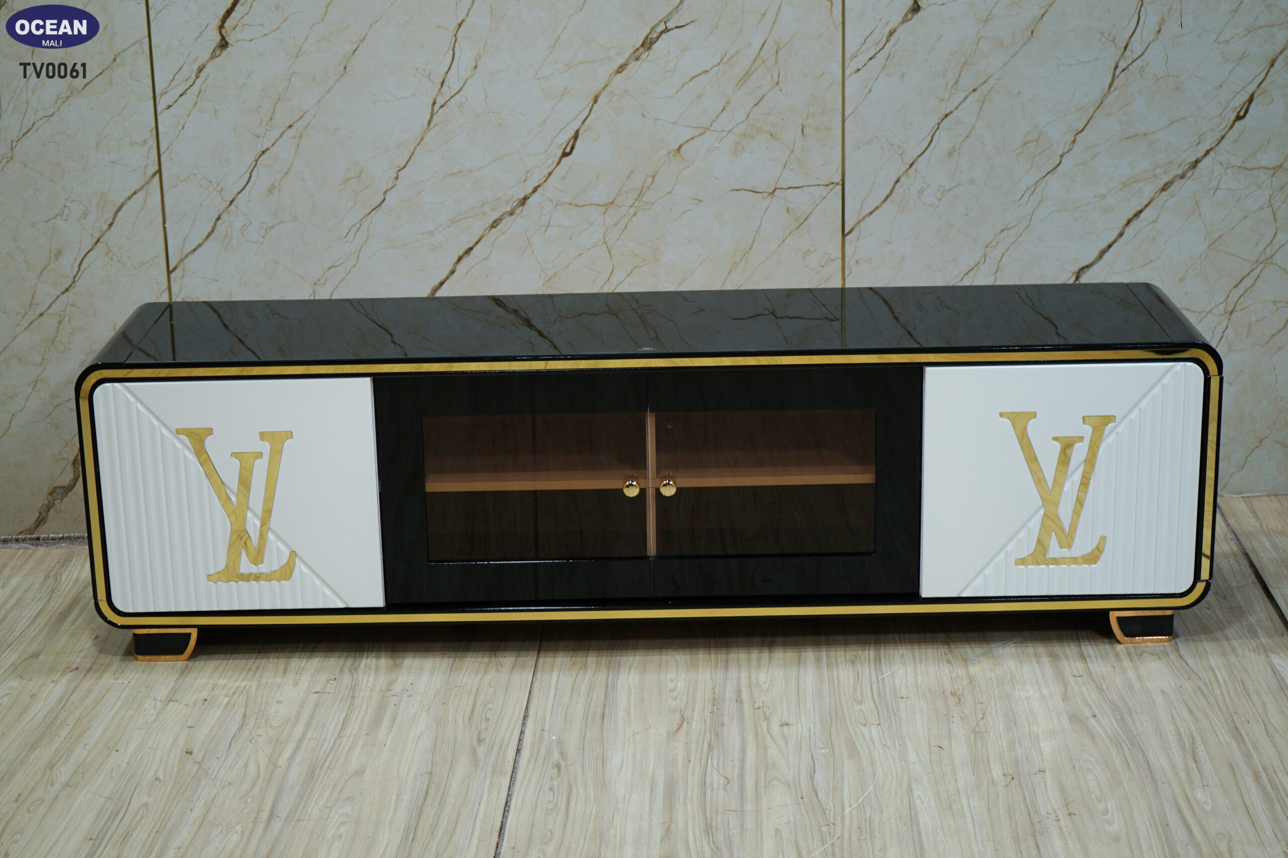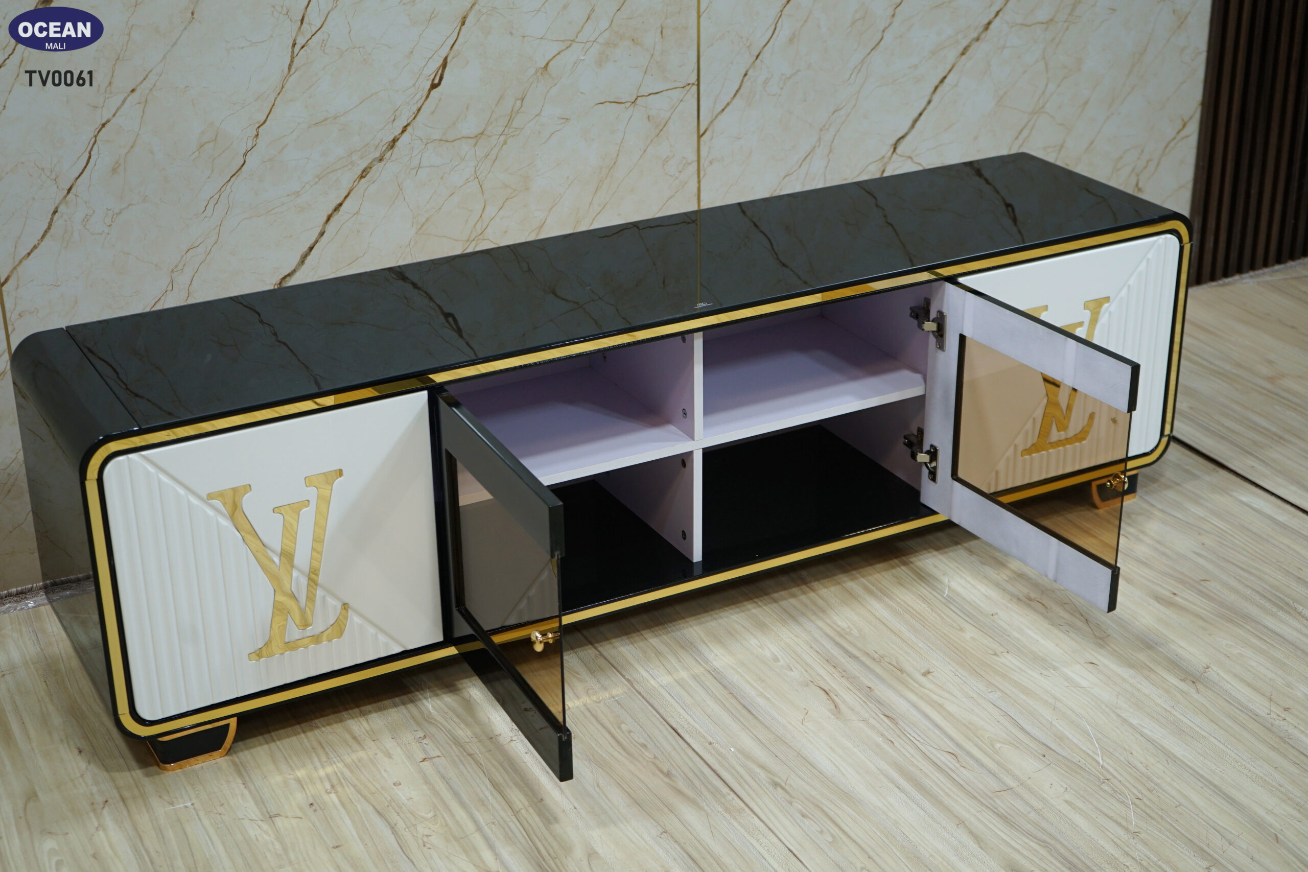 Ce meuble TV, modèle OCEAN TV0061, est une pièce de mobilier luxueuse et audacieuse, conçue pour les intérieurs modernes qui recherchent un point focal distinctif. Sa finition en laque noire brillante apporte une profondeur et une élégance indéniables, tandis que les détails dorés, tels que les pieds, les bordures et le logo “V” stylisé, créent un contraste saisissant et soulignent le caractère unique du meuble.