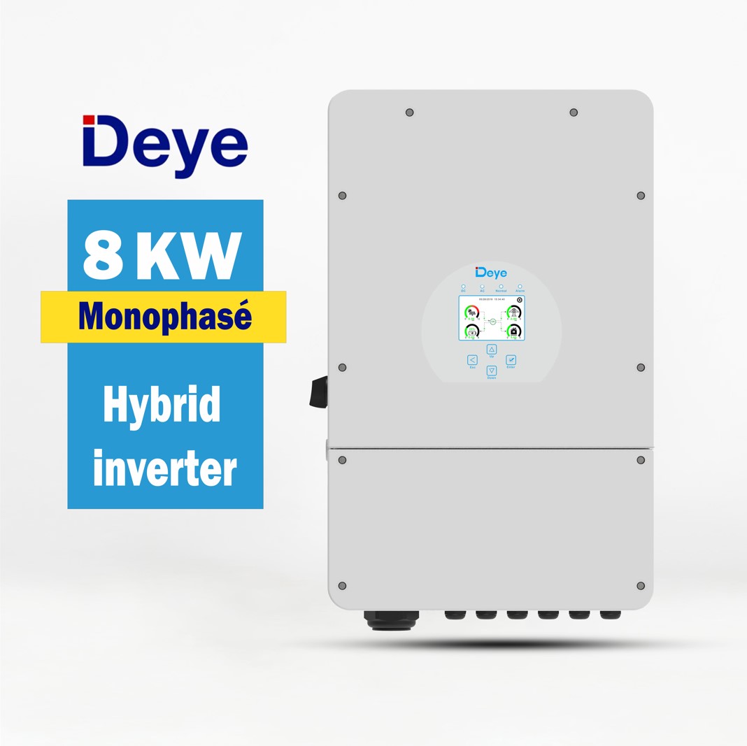 Onduleur hybride de la marque Deye, d’une puissance de 8 kW, conçu pour les installations solaires photovoltaïques résidentielles. Il s’agit d’un modèle monophasé, ce qui signifie qu’il est adapté pour être connecté à un réseau électrique domestique standard.