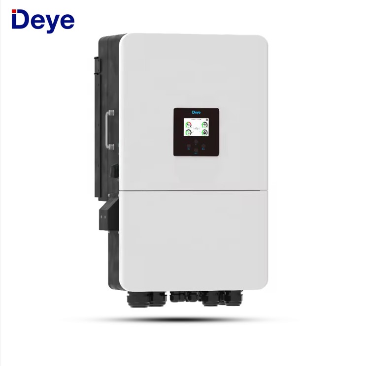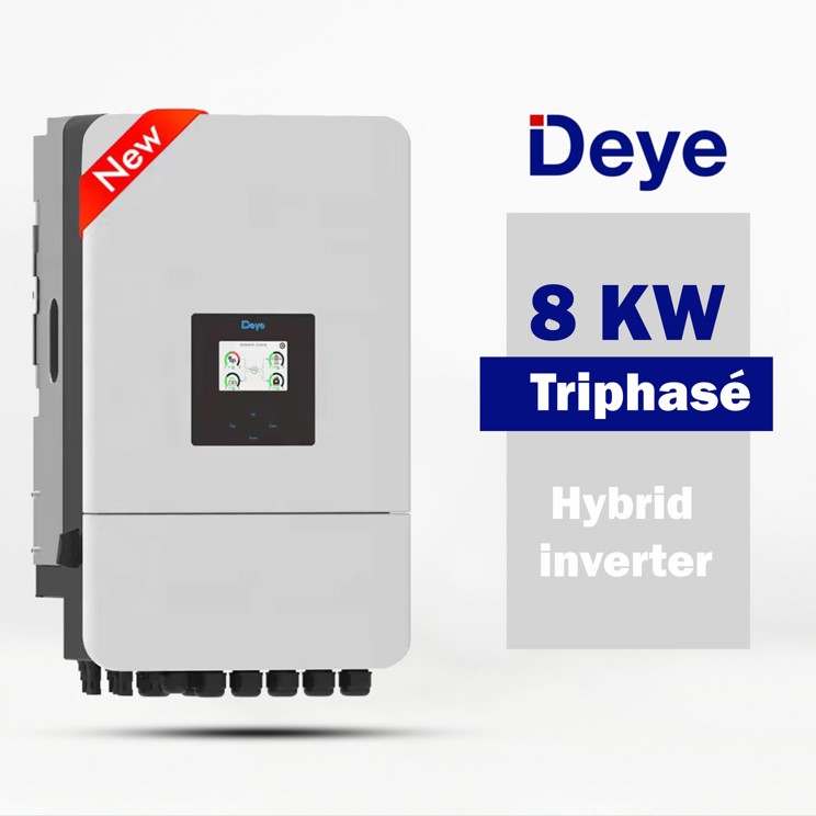 Onduleur hybride de la marque Deye, d’une puissance de 8 kW, conçu pour les installations solaires photovoltaïques résidentielles ou commerciales. Il s’agit d’un modèle triphasé, ce qui signifie qu’il est adapté pour être connecté à un réseau électrique triphasé, plus courant dans les bâtiments nécessitant une puissance électrique plus importante.