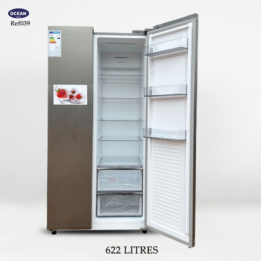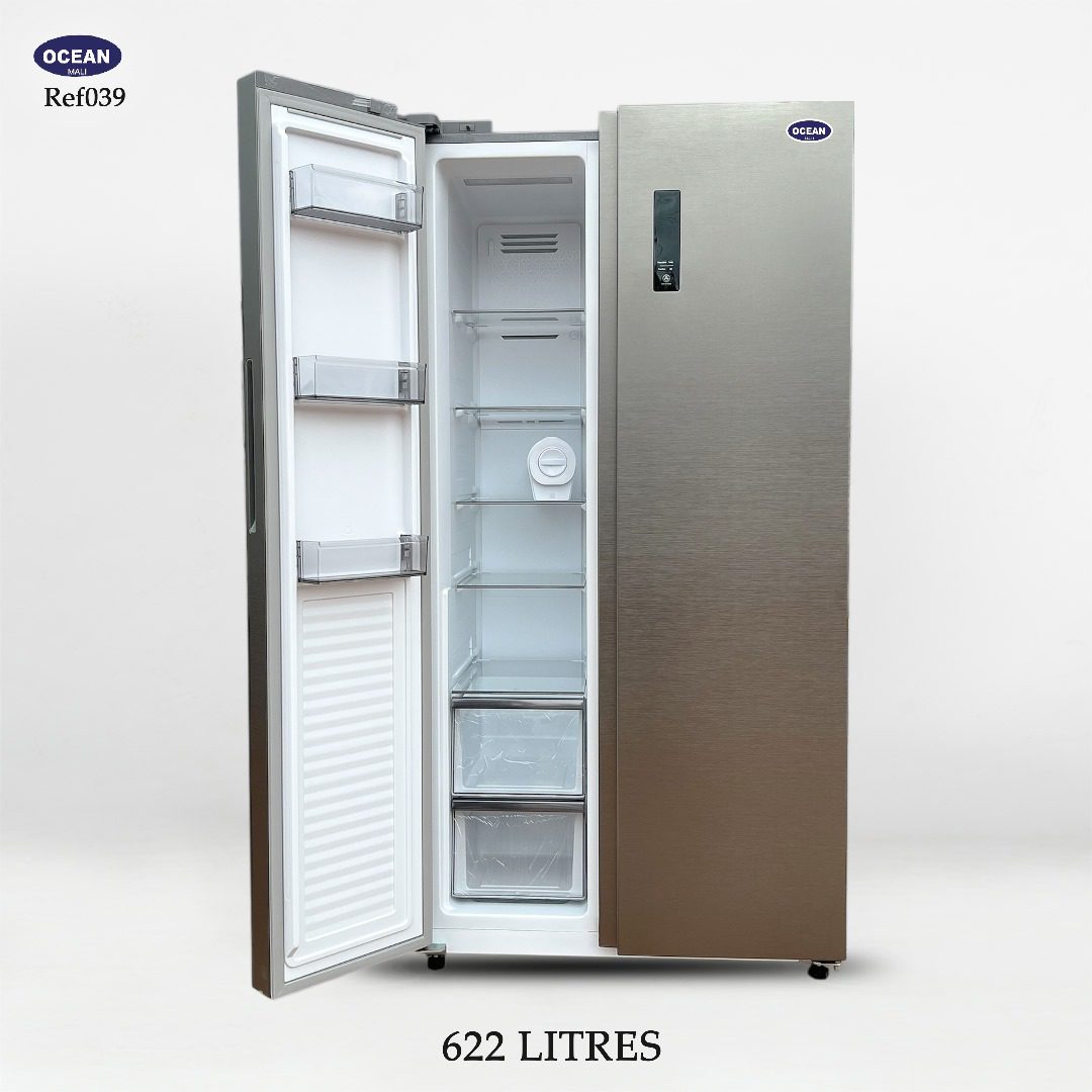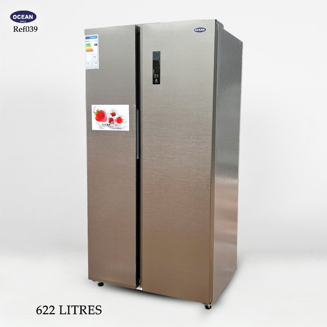 Ce réfrigérateur américain (Side-by-Side) de marque OCEAN se distingue par son design moderne en acier inoxydable (inox) et son grand volume. C’est un appareil spacieux, idéal pour les grandes familles ou pour ceux qui ont besoin d’une grande capacité de stockage.