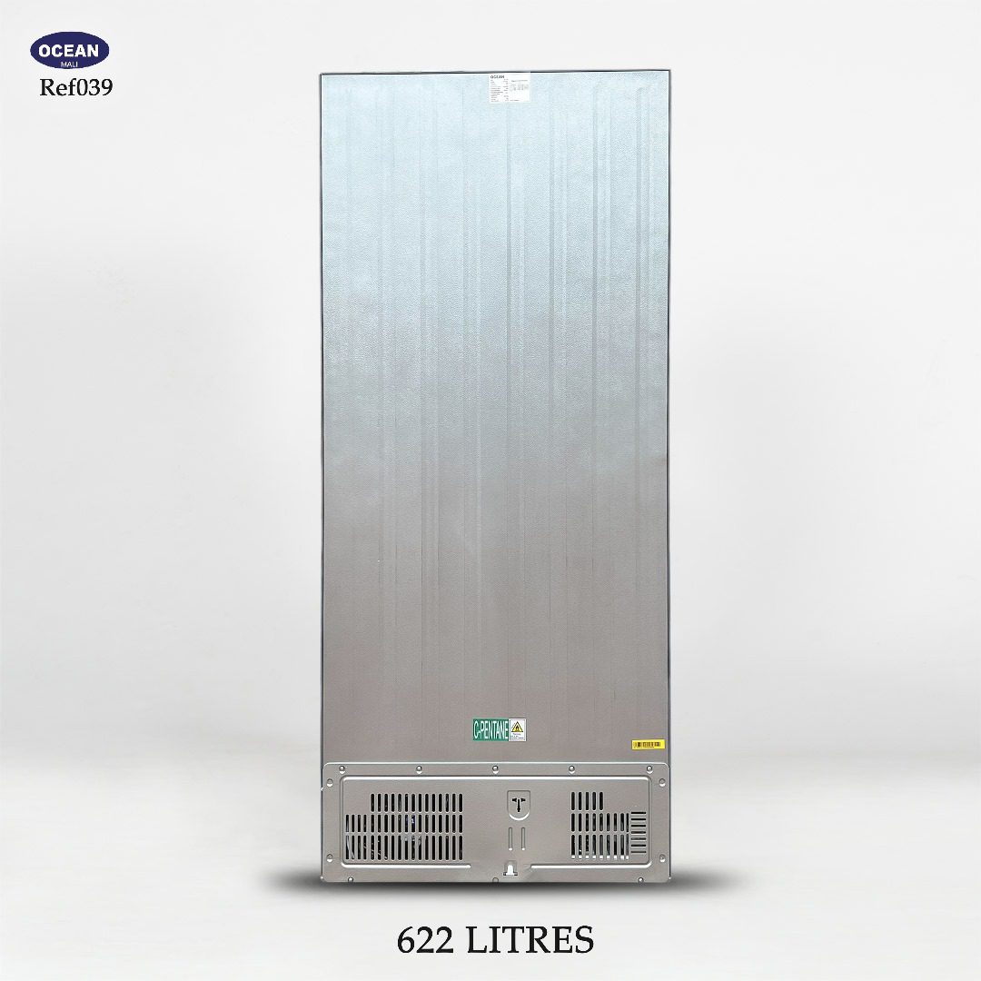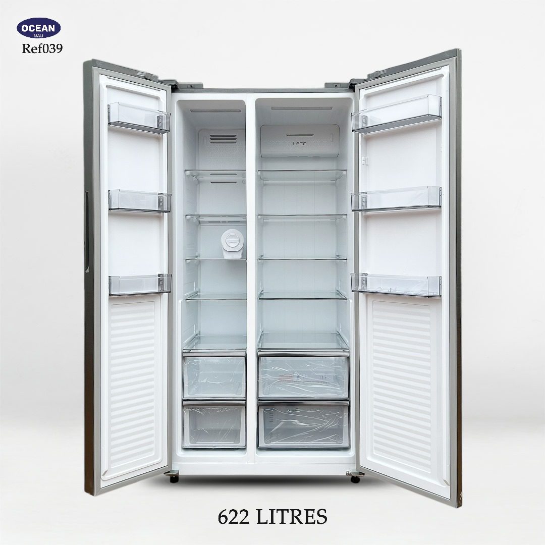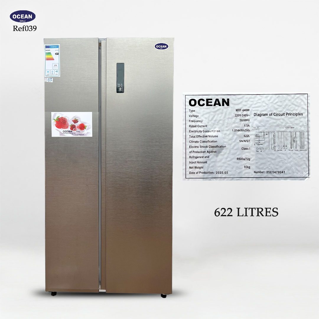 Ce réfrigérateur américain (Side-by-Side) de marque OCEAN se distingue par son design moderne en acier inoxydable (inox) et son grand volume. C’est un appareil spacieux, idéal pour les grandes familles ou pour ceux qui ont besoin d’une grande capacité de stockage.