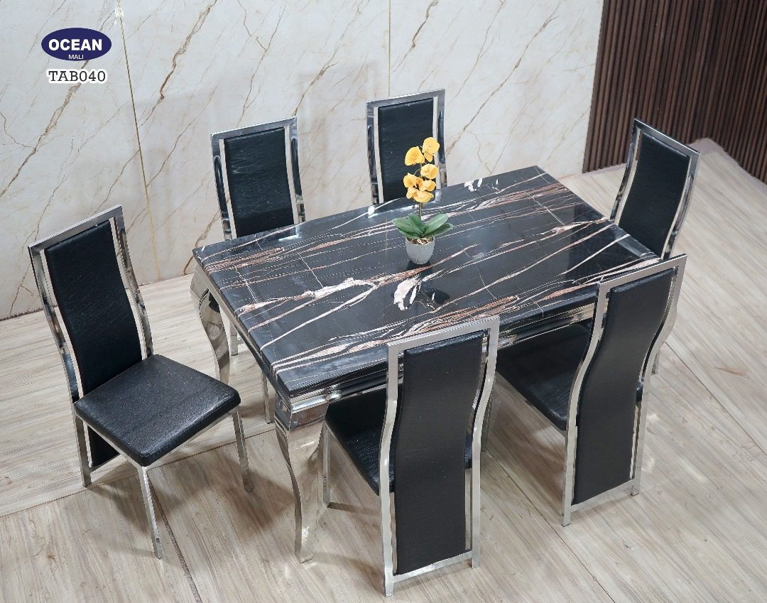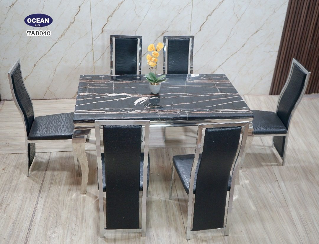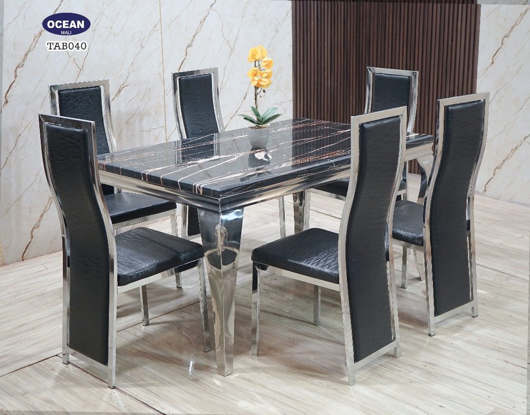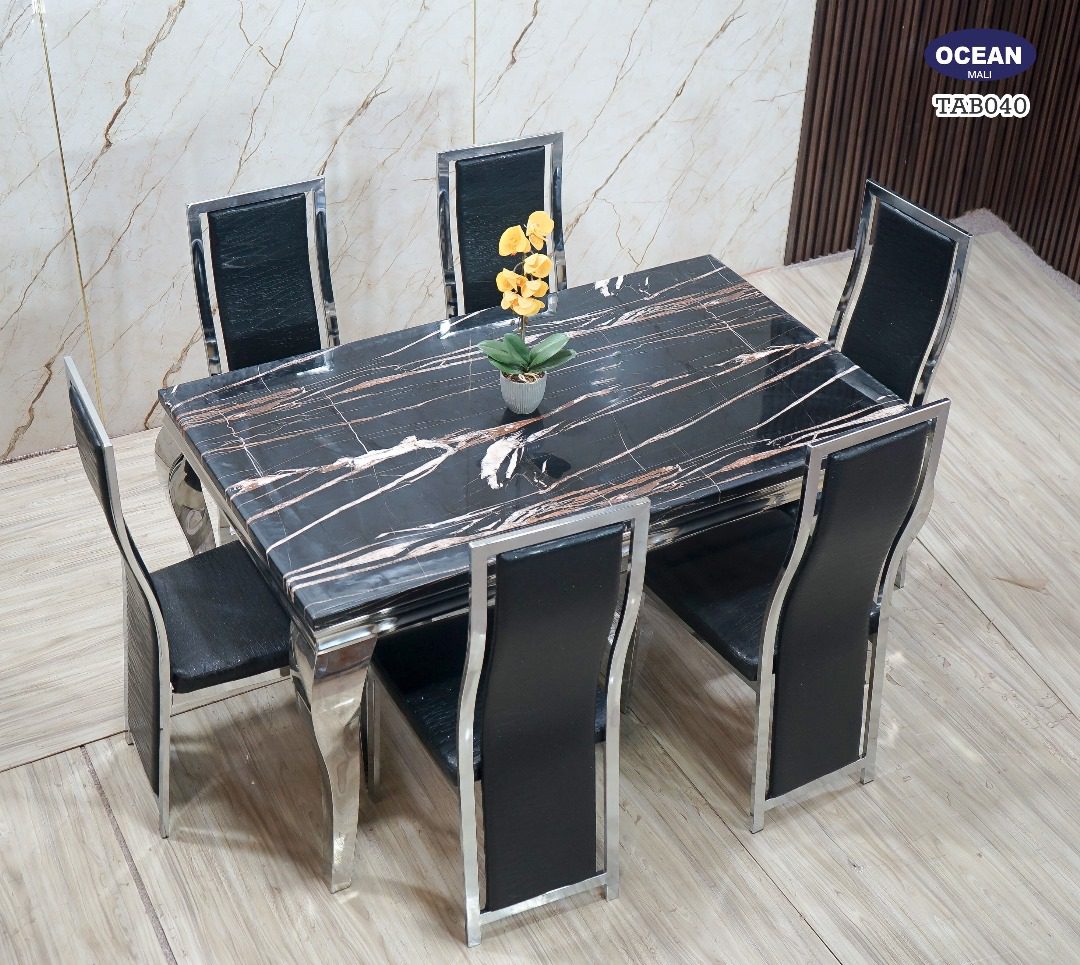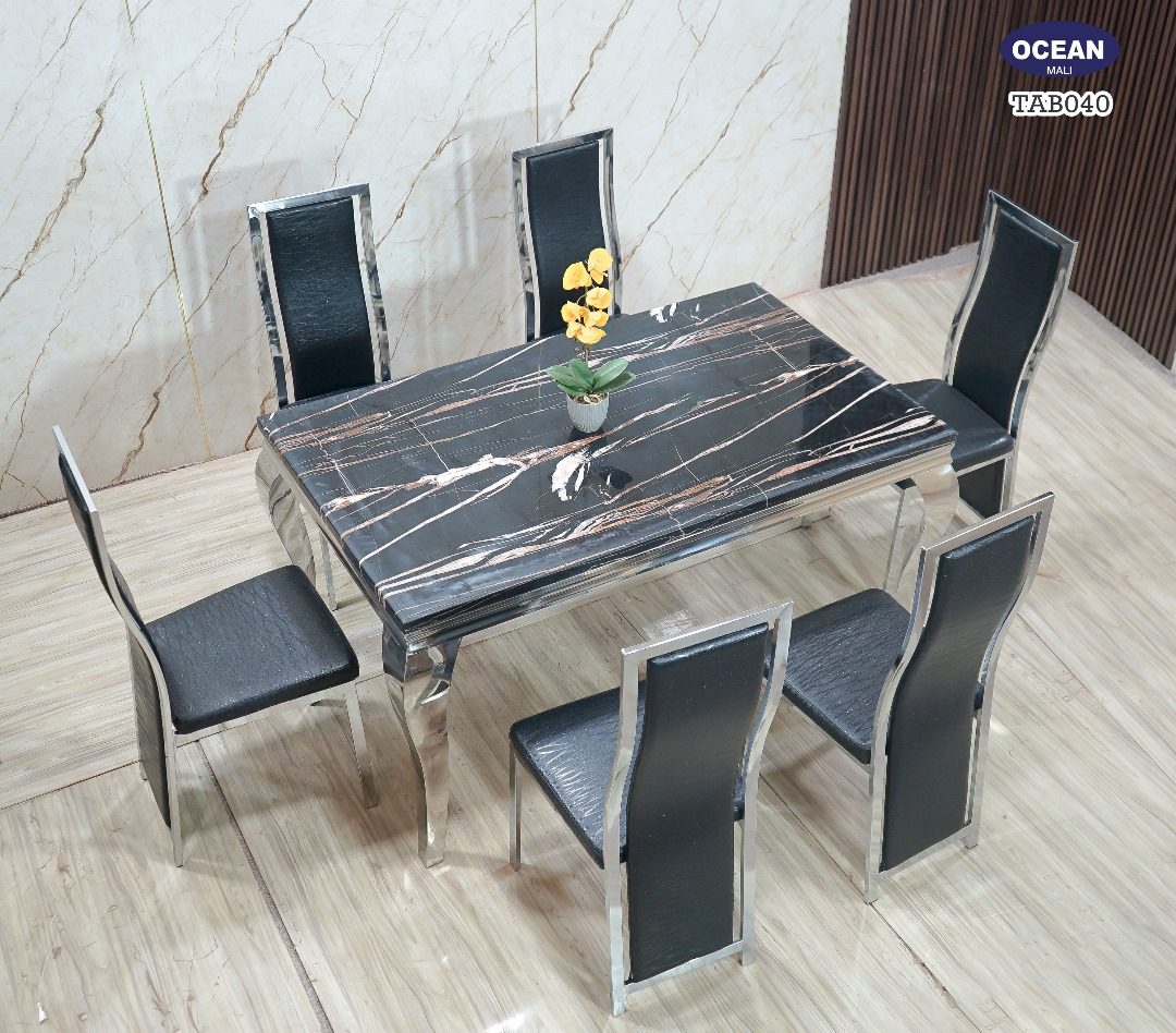 Ce modèle TAB040 de la collection “Océan” est un ensemble de salle à manger au design audacieux et contemporain. Le plateau rectangulaire est en faux marbre noir, sillonné de veines blanches et orangées, créant un contraste saisissant qui attire immédiatement le regard. La structure de la table, avec ses pieds galbés et les contours du plateau, est en métal chromé brillant, ajoutant une touche de modernité et de légèreté. Les six chaises assorties sont dotées de sièges et de dossiers en similicuir noir, encadrés par la même finition chromée. Cet ensemble est parfait pour un intérieur moderne et sophistiqué.
