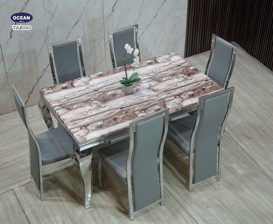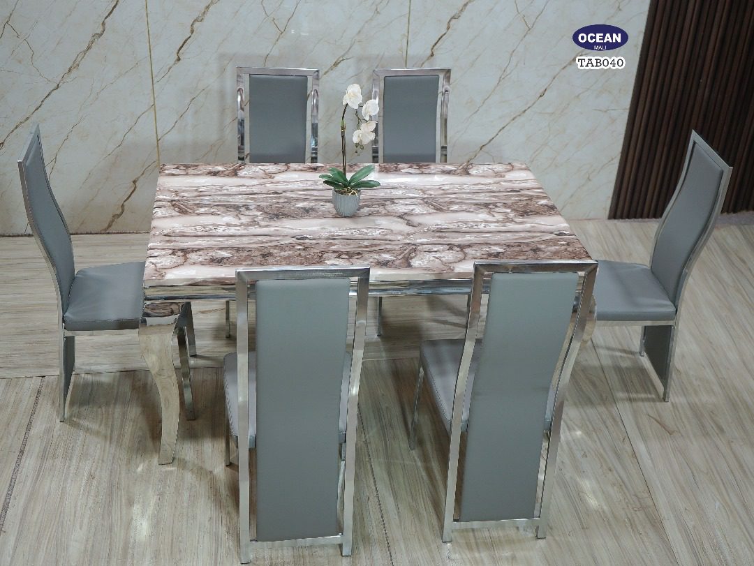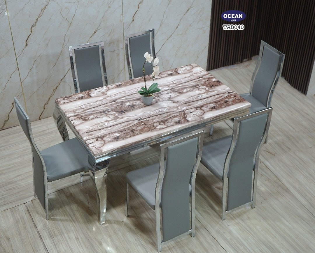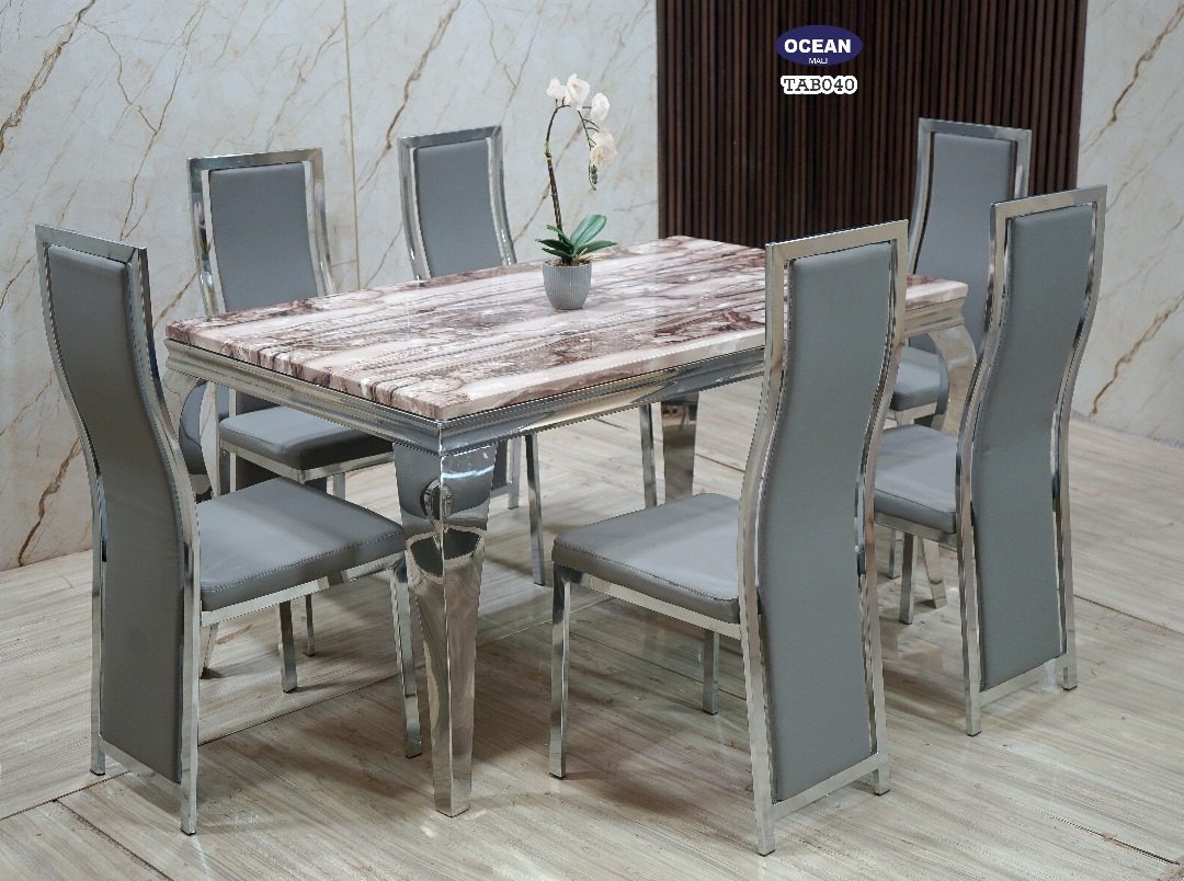 Ce modèle TAB040 de la collection “Océan” est une table à manger qui dégage une aura de sophistication moderne. Son plateau rectangulaire est orné d’un motif de marbre blanc et gris, offrant un contraste visuel captivant. La structure de la table, incluant les pieds et les bordures du plateau, est en métal chromé brillant, reflétant la lumière et accentuant son allure contemporaine. Les six chaises assorties sont tapissées d’un revêtement en cuir gris doux au toucher, avec des contours en métal chromé pour s’harmoniser parfaitement avec la table. L’ensemble est idéal pour ceux qui recherchent un mobilier à la fois chic et fonctionnel.