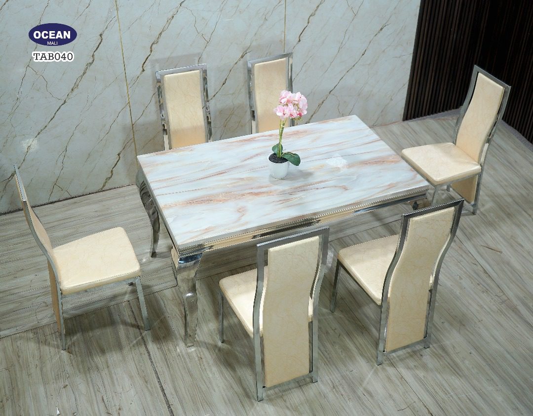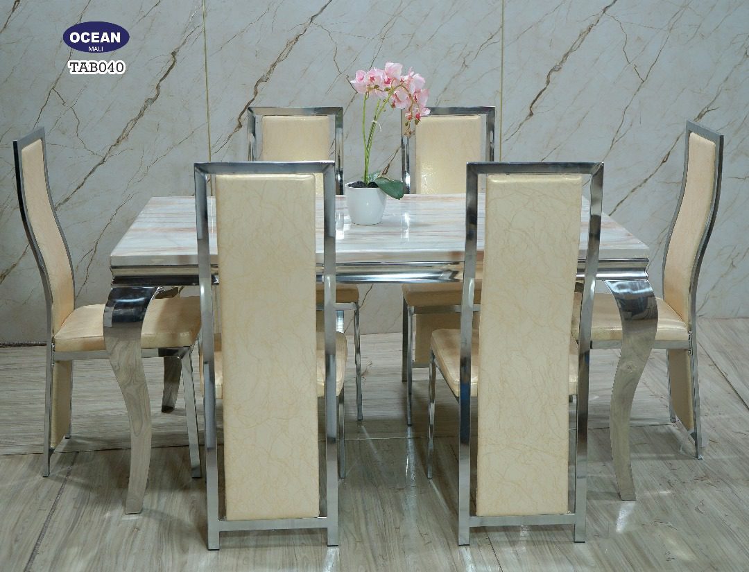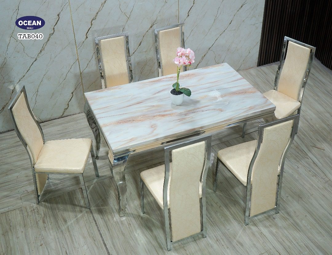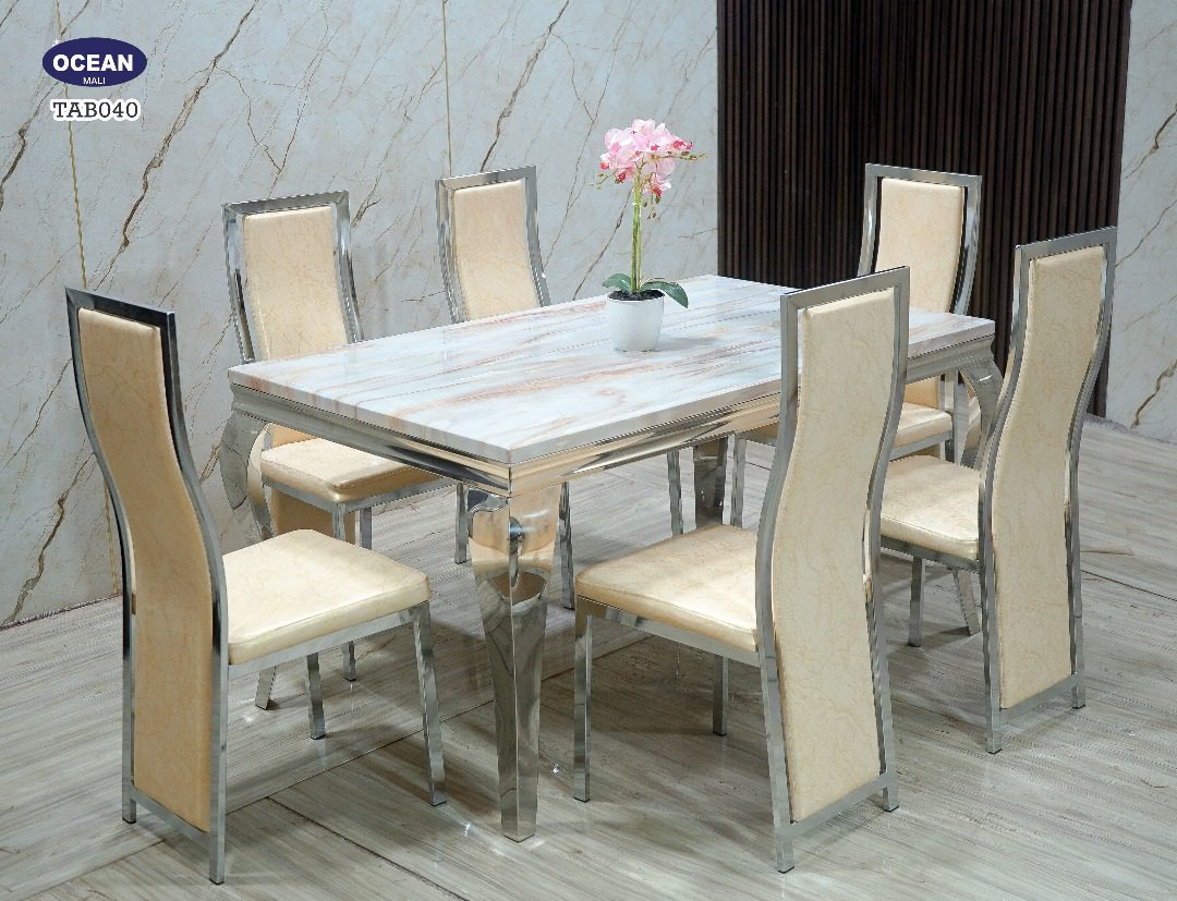 Superbe table à manger en marbre blanc veiné aux reflets dorés, accompagnée de six chaises élégantes au revêtement beige et structure argentée. Un ensemble raffiné qui allie modernité et élégance pour sublimer votre intérieur.
