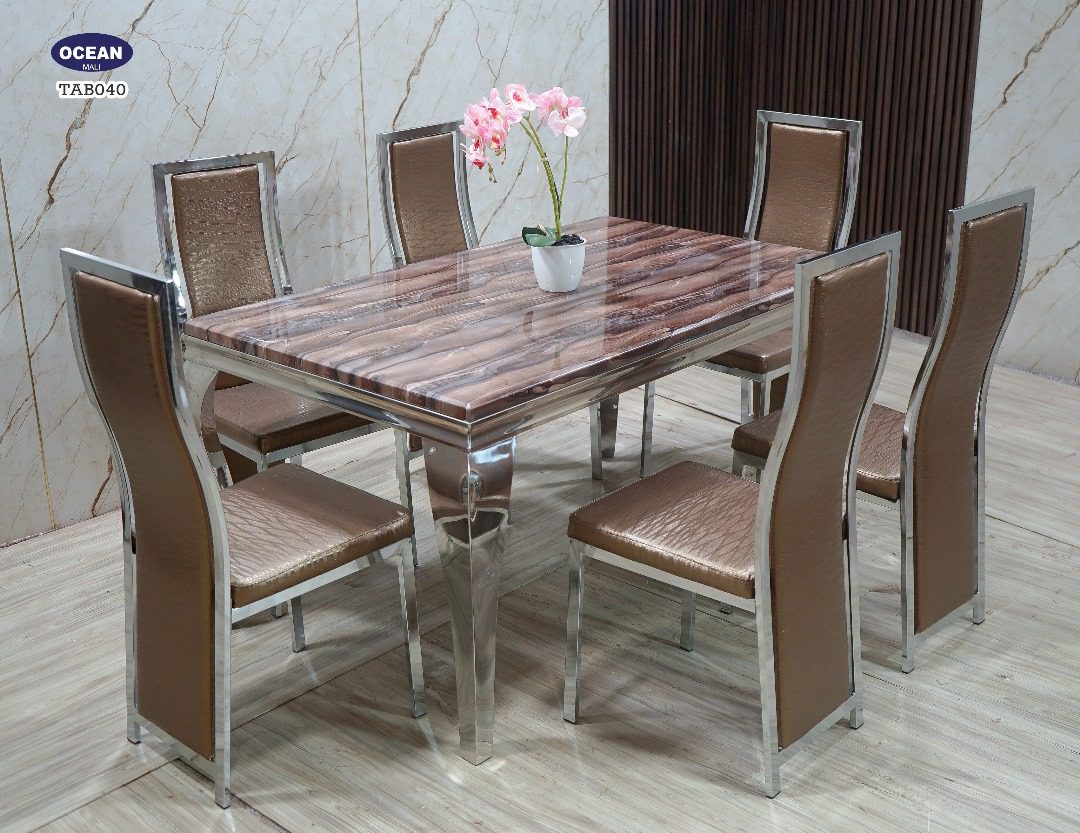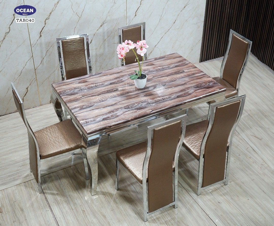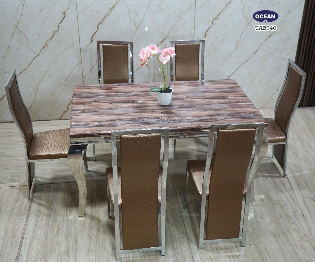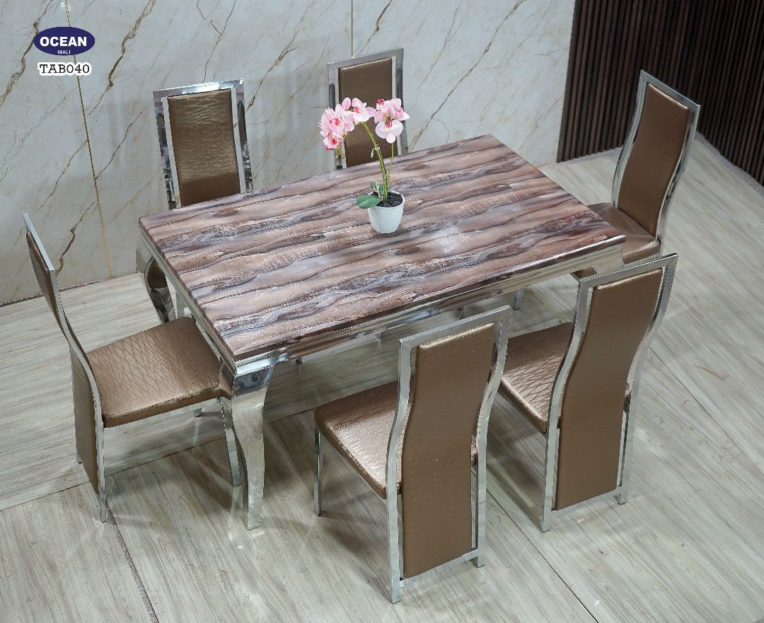 Ce modèle TAB040 de la collection “Océan” est un ensemble de salle à manger sophistiqué et chaleureux. Le plateau de la table rectangulaire présente un motif de marbre avec des tons de brun et de blanc, créant un effet visuel texturé et naturel. La structure de la table et des chaises est en métal chromé brillant, ce qui apporte une touche de modernité et met en valeur la chaleur du bois. Les six chaises assorties sont tapissées d’un revêtement matelassé dans une teinte dorée ou bronze, offrant un confort optimal et une esthétique luxueuse. Cet ensemble est idéal pour créer une ambiance élégante et accueillante dans votre salle à manger.