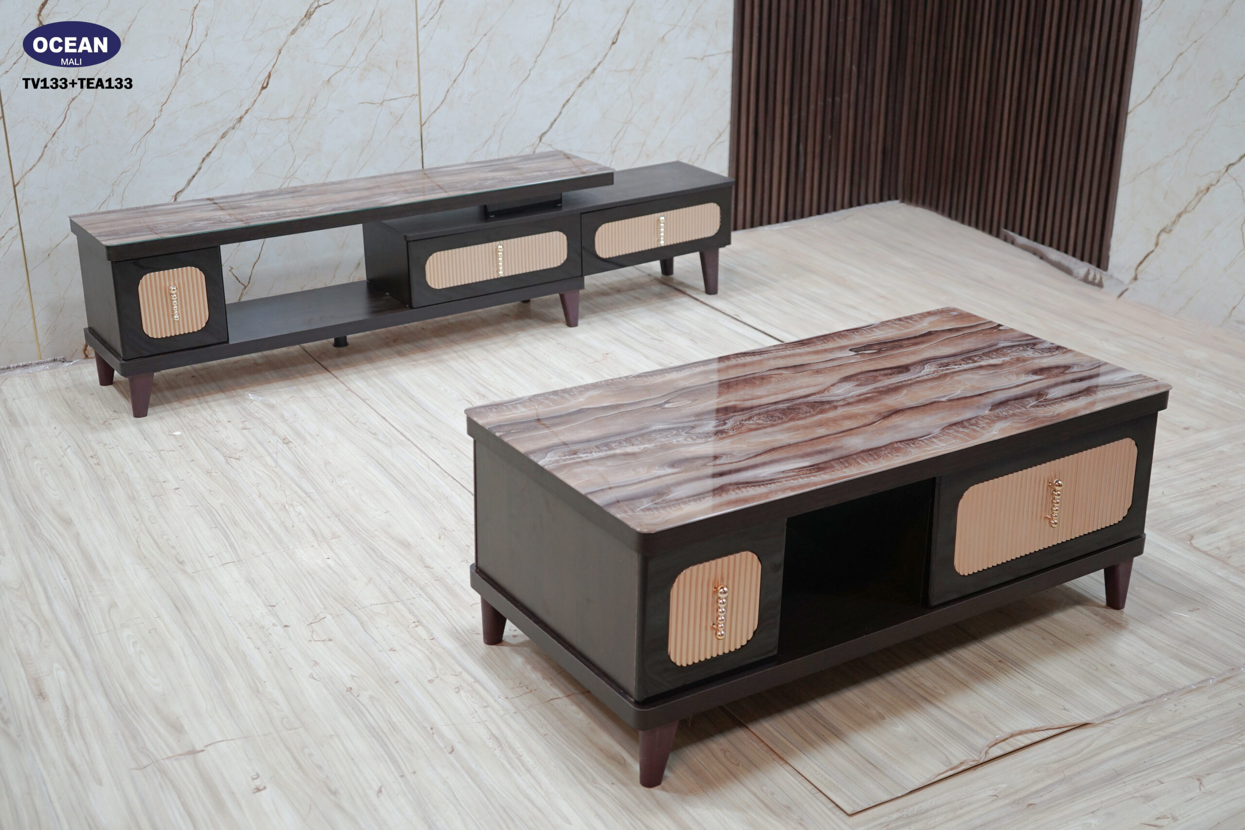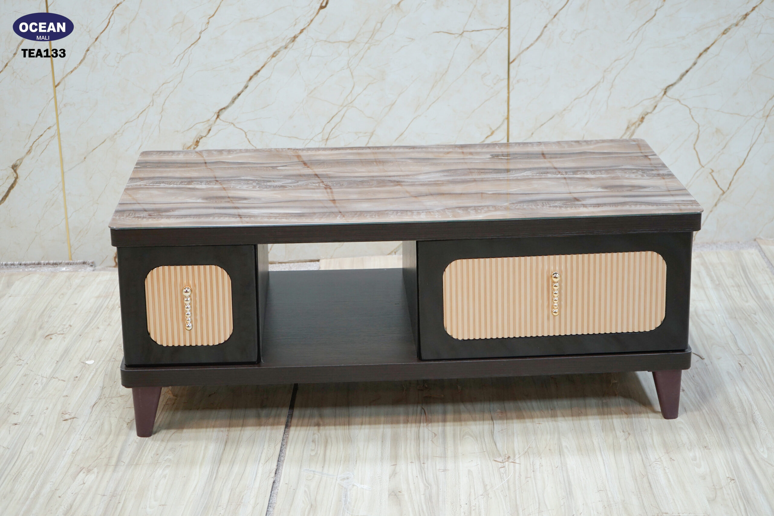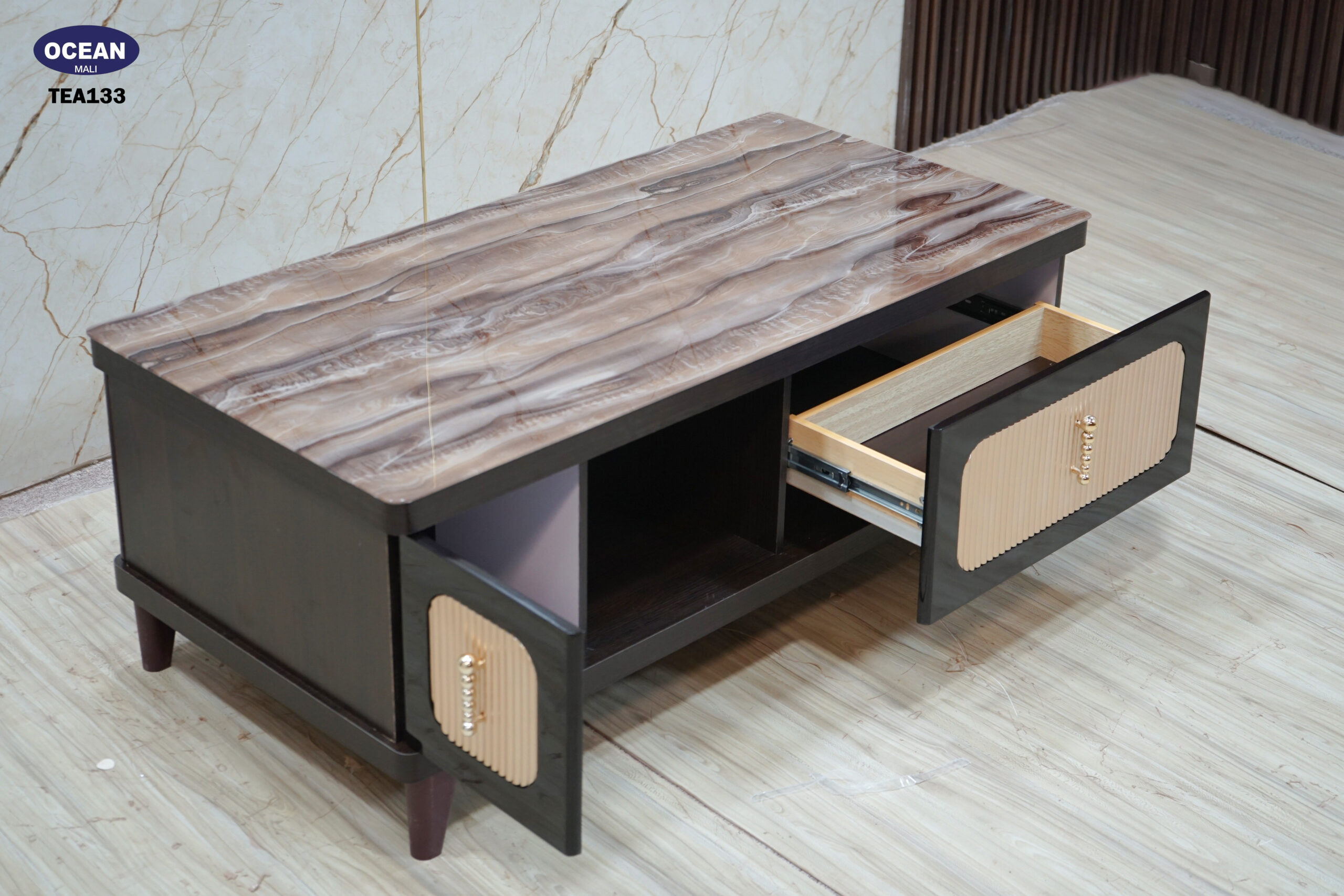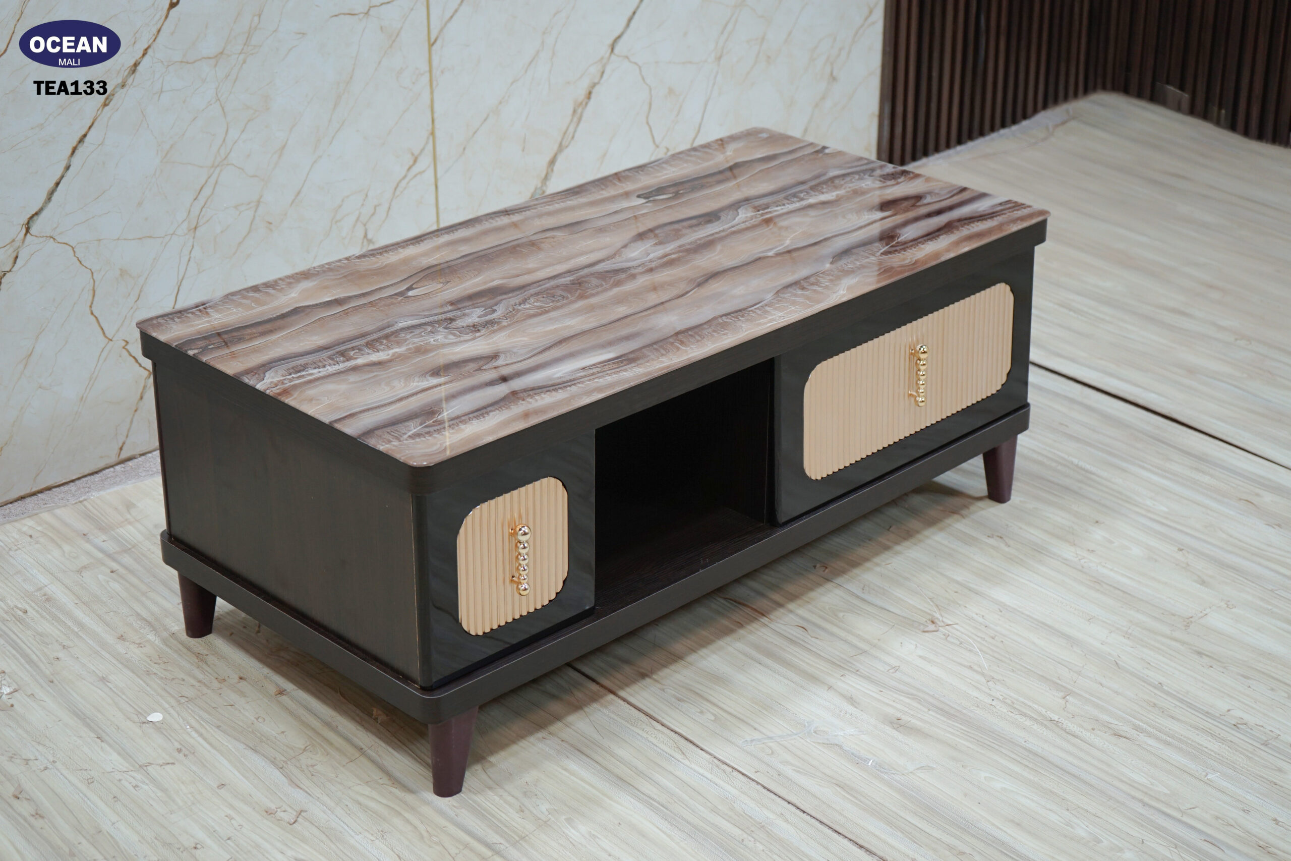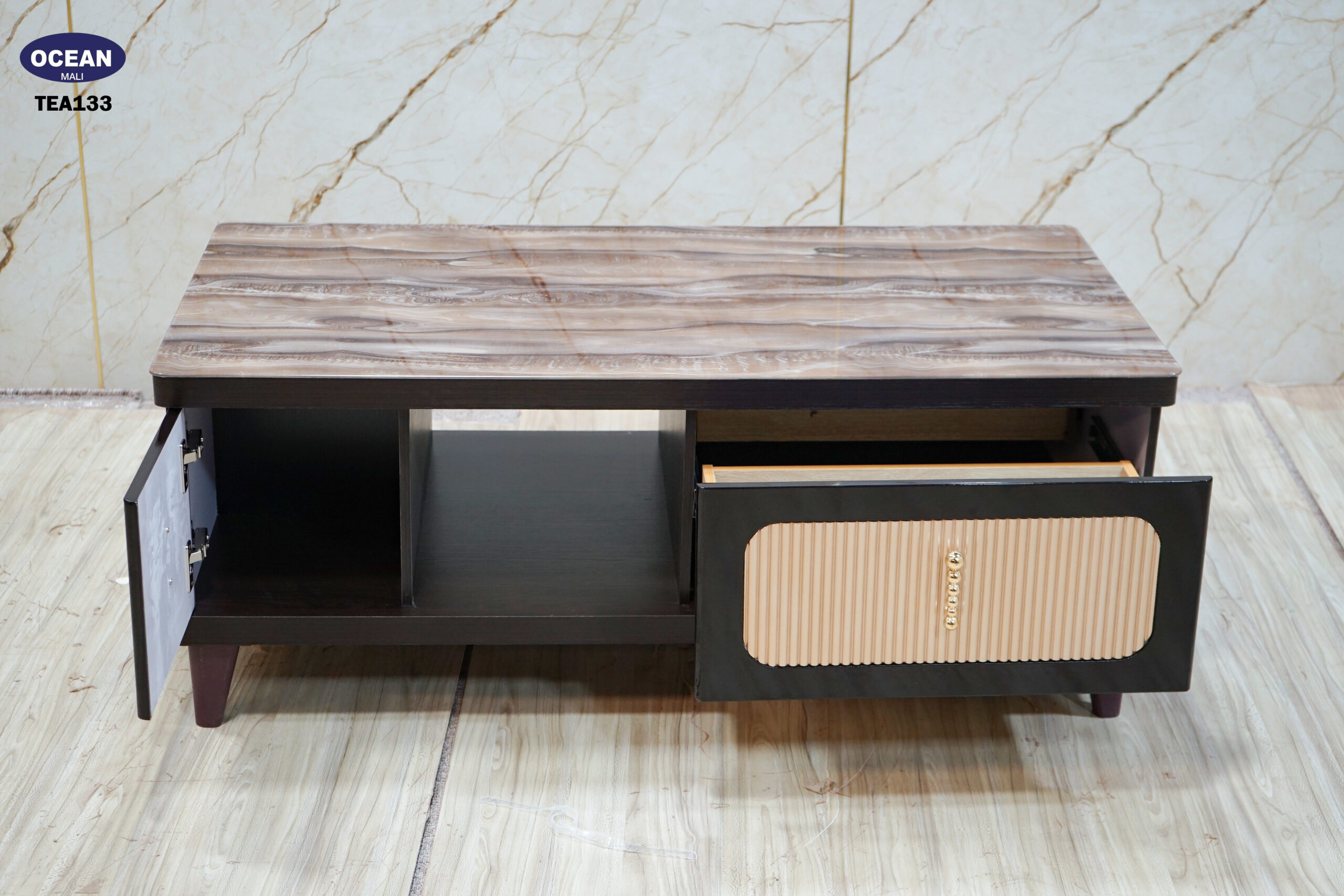 Cette table basse au design moderne et chaleureux est idéale pour votre salon. Son plateau en imitation bois marbré aux tons chauds apporte une touche naturelle et élégante. La structure sombre est complétée par des façades claires texturées et des poignées discrètes. Elle offre un espace de rangement pratique avec un compartiment ouvert et deux espaces fermés par des portes. Les lignes épurées et les matériaux choisis font de cette table basse un meuble à la fois fonctionnel et esthétique.