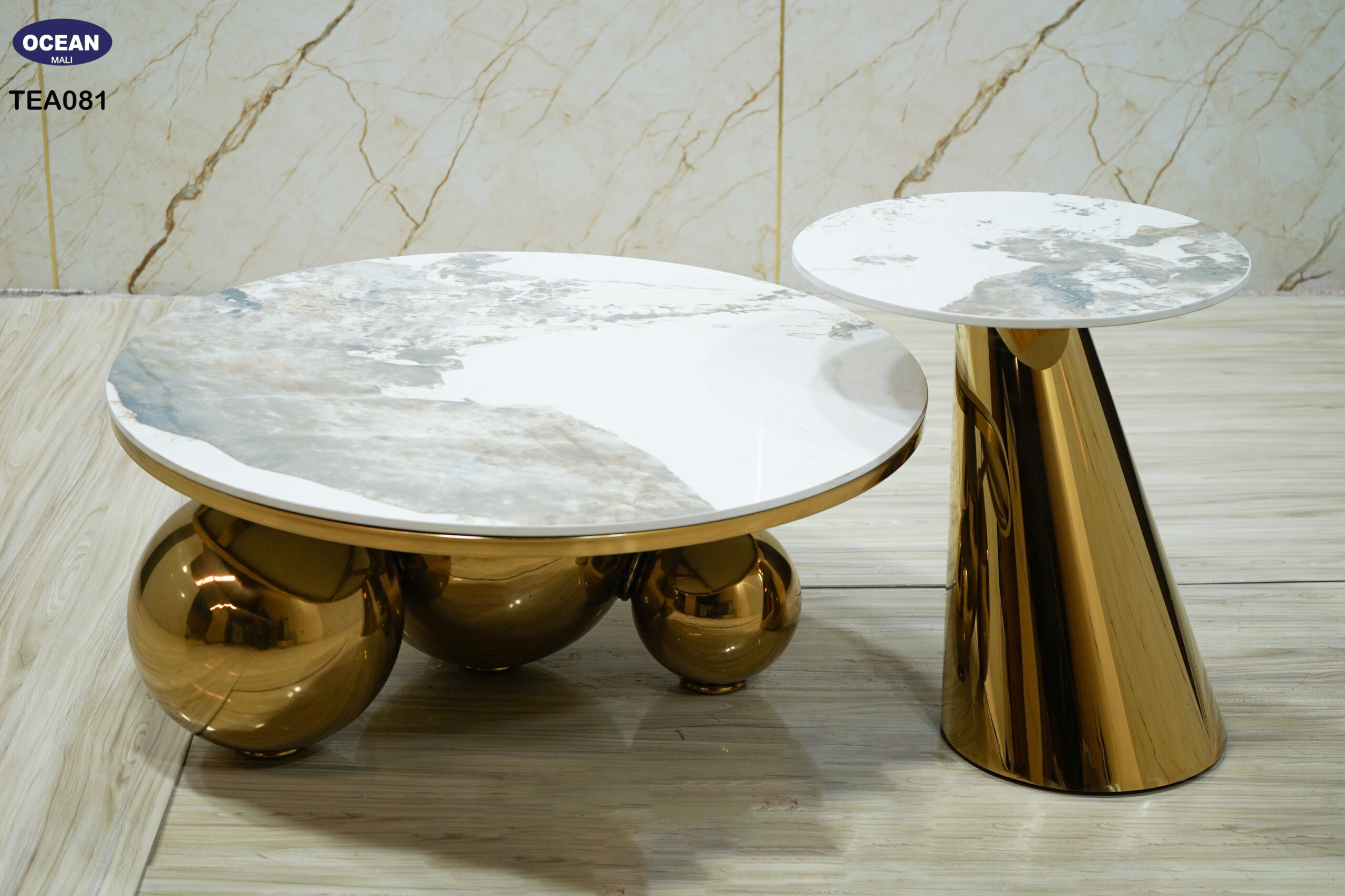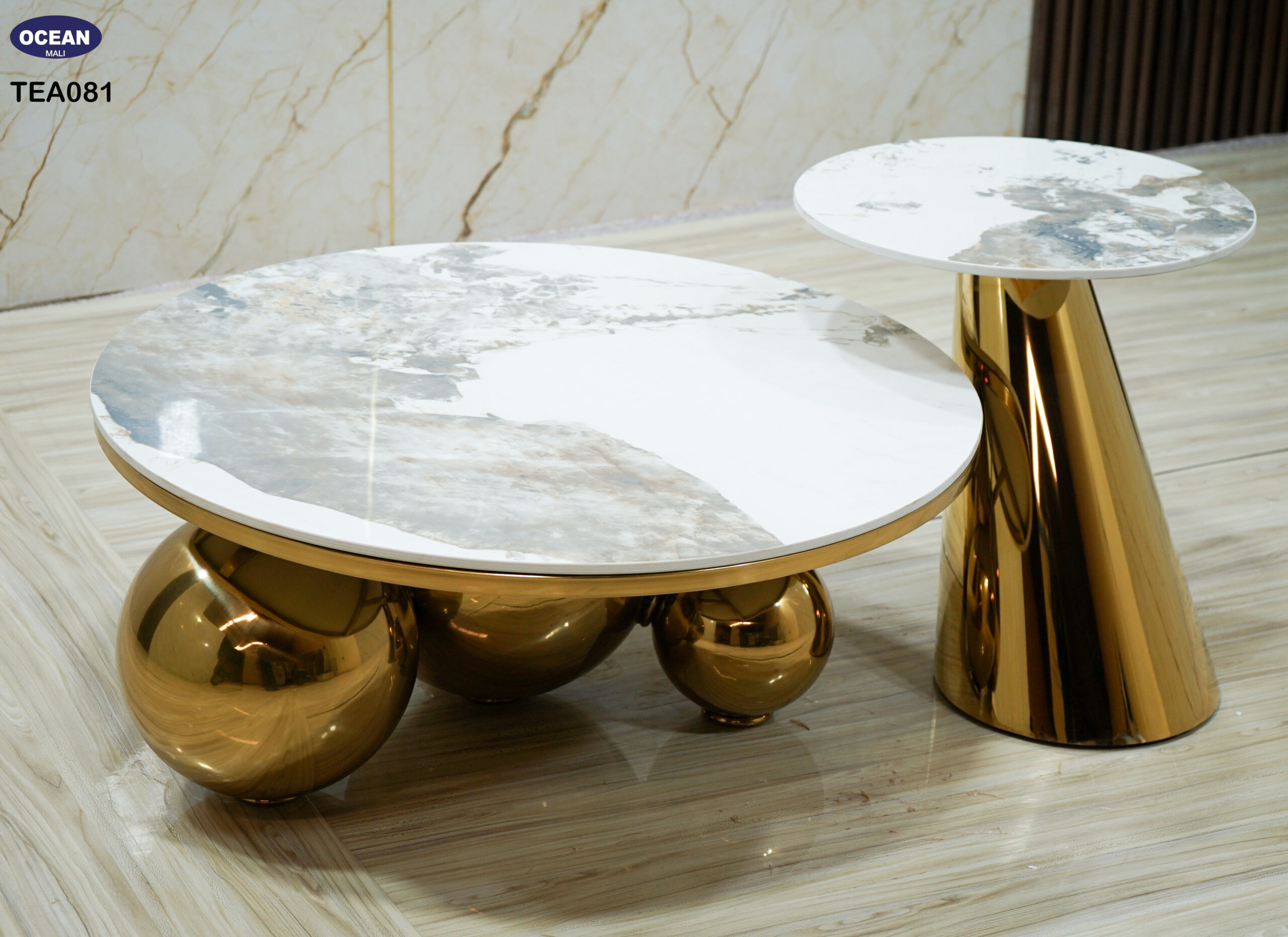 L’Élégance Cosmique est une table basse qui repousse les limites du design. Son plateau en marbre blanc, aux veines naturelles, contraste élégamment avec ses pieds en acier inoxydable doré, façonnés en sphères parfaites. Un véritable objet d’art pour votre salon.