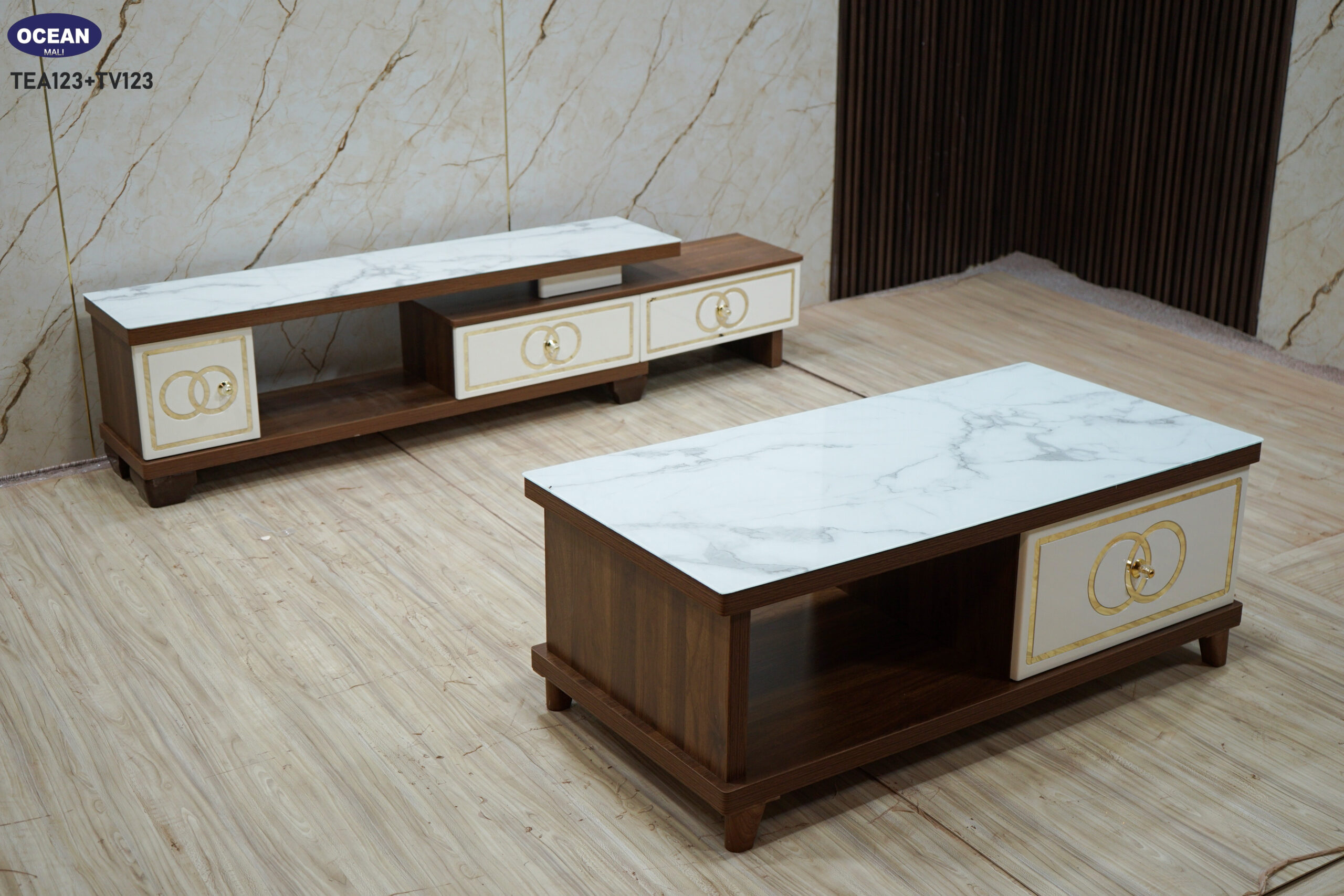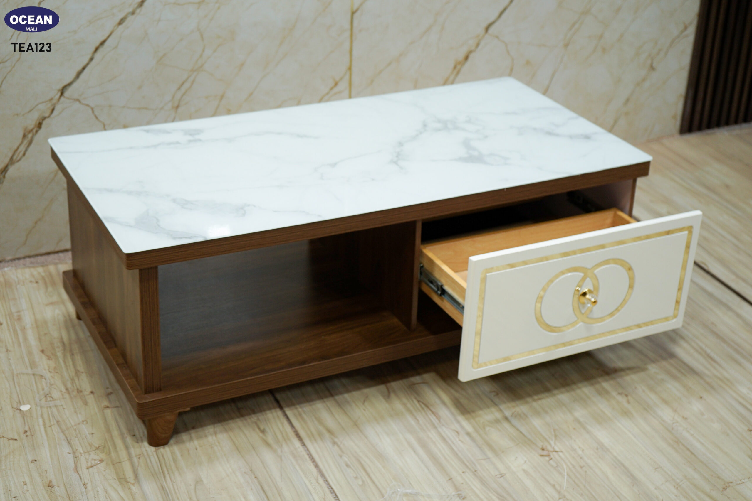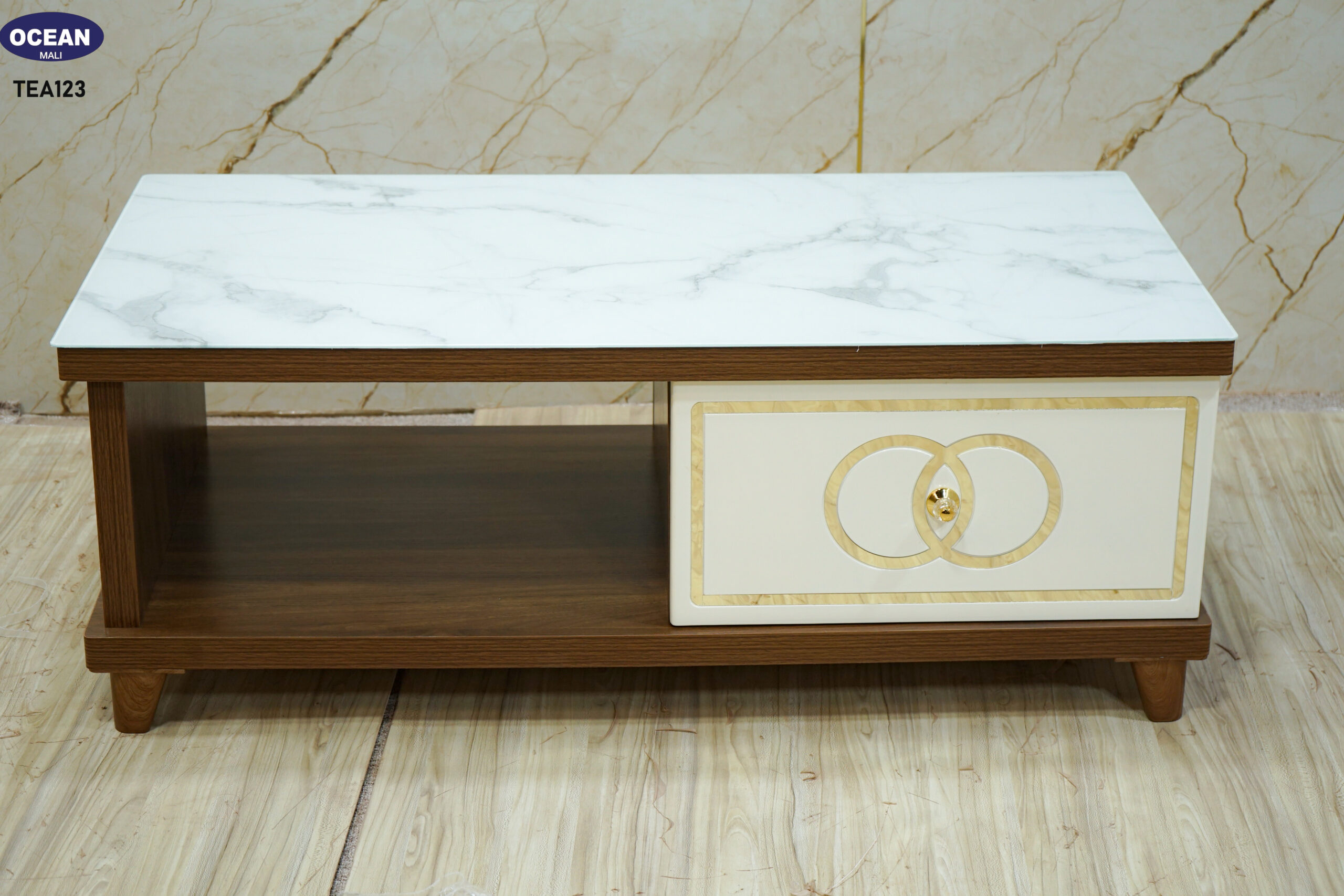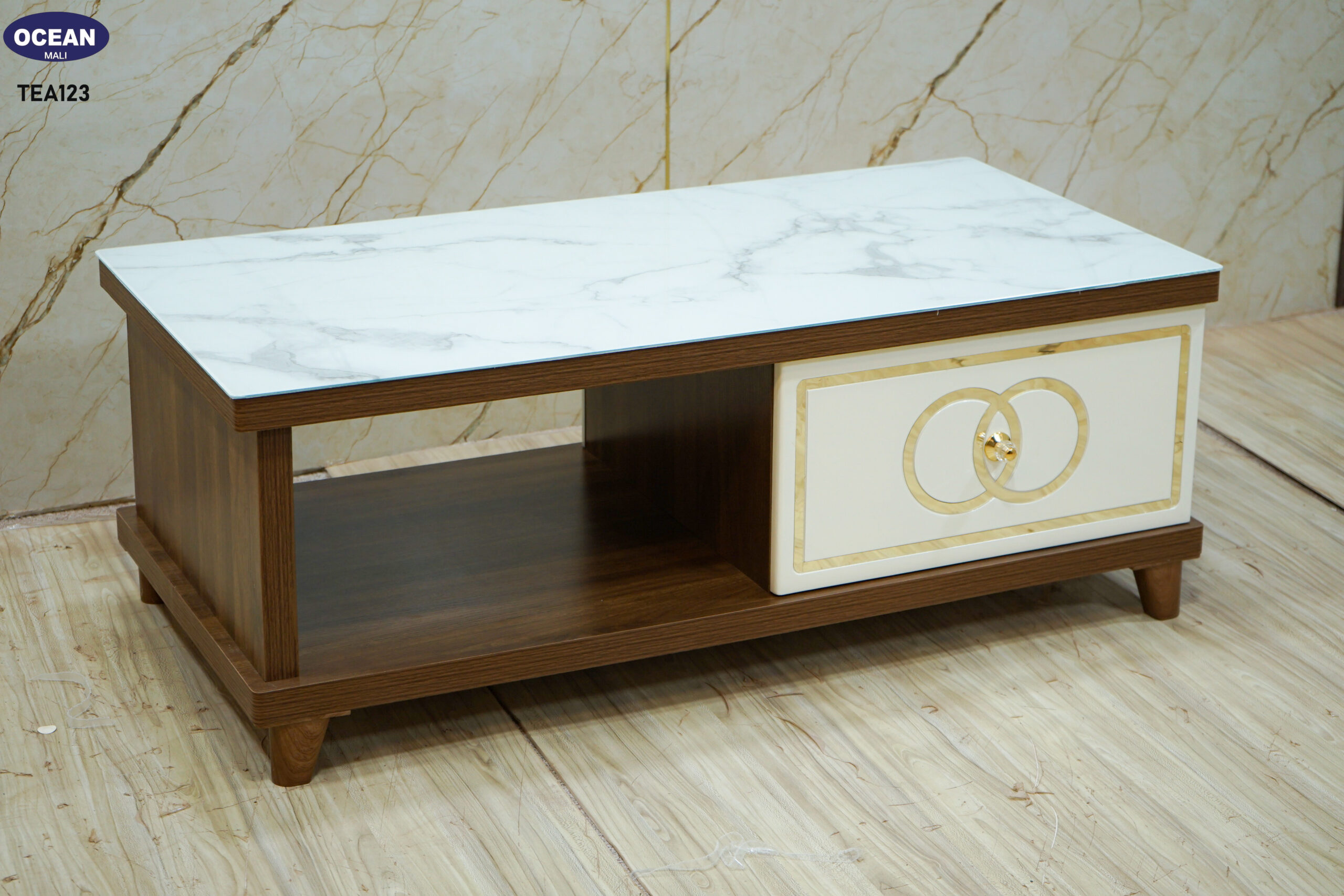 Cette table basse allie harmonieusement le style contemporain et une touche de raffinement. Son plateau en imitation marbre blanc veiné apporte une sensation de luxe et de luminosité. La structure en bois foncé est complétée par un tiroir à façade crème orné de motifs dorés, ajoutant une note d’élégance. Elle offre un espace de rangement pratique avec un tiroir et un compartiment ouvert, idéal pour organiser votre salon avec style. Les lignes épurées et les matériaux choisis font de cette table basse un meuble à la fois fonctionnel et esthétique.