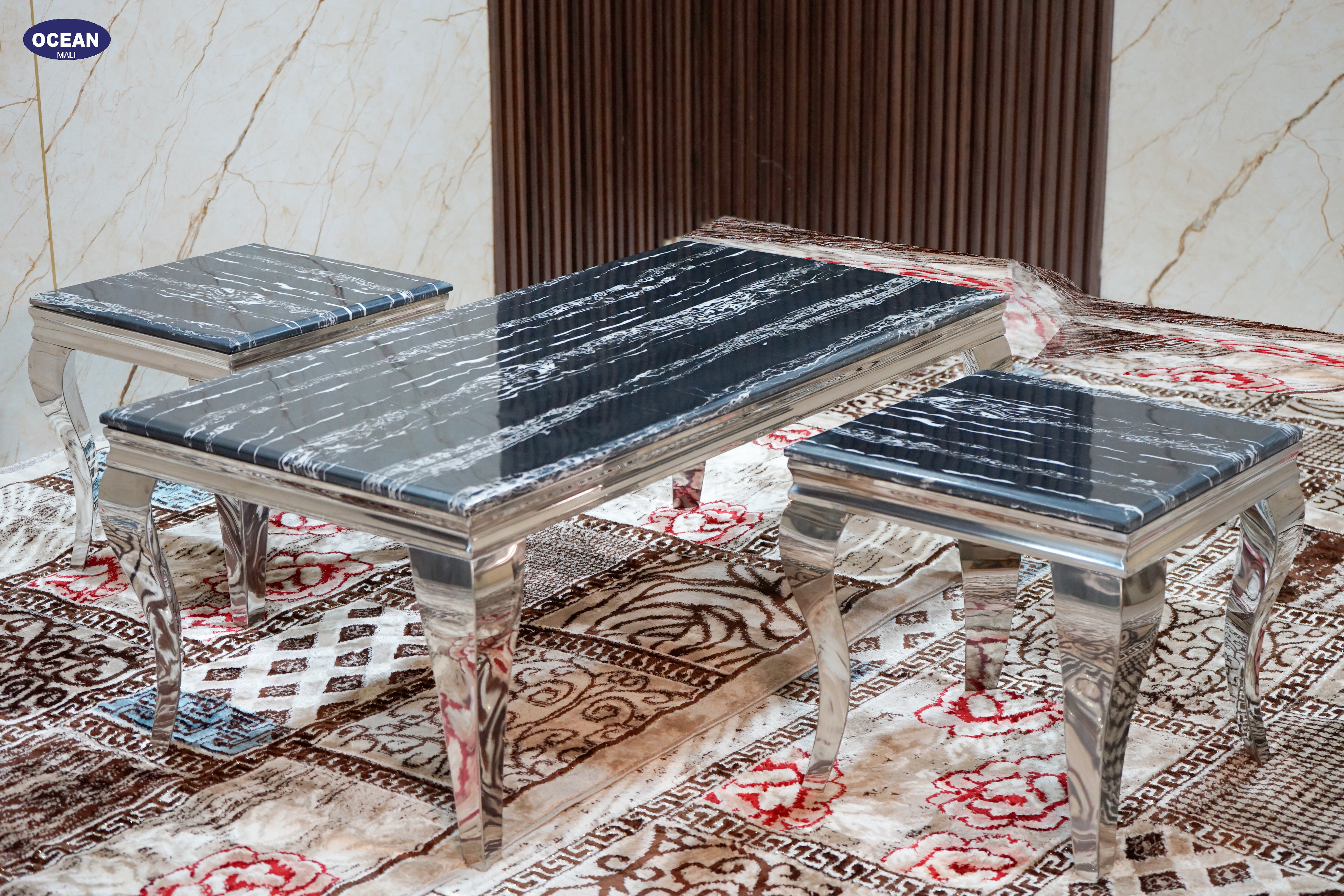 Le piétement est en acier inoxydable, un matériau résistant et brillant qui contraste joliment avec la matité du marbre. Les pieds sont souvent fins et élancés, donnant à la table un aspect léger et aérien. Leur forme peut varier, mais on retrouve souvent des pieds compas, qui rappellent le style Art Déco.