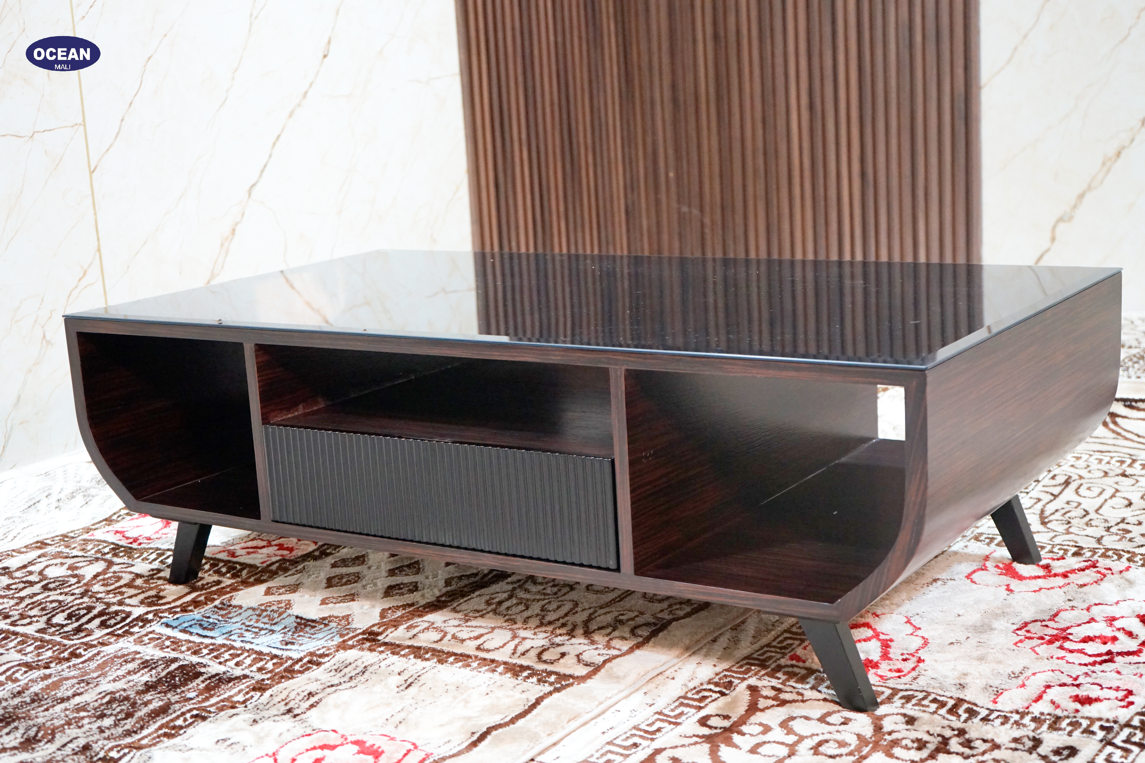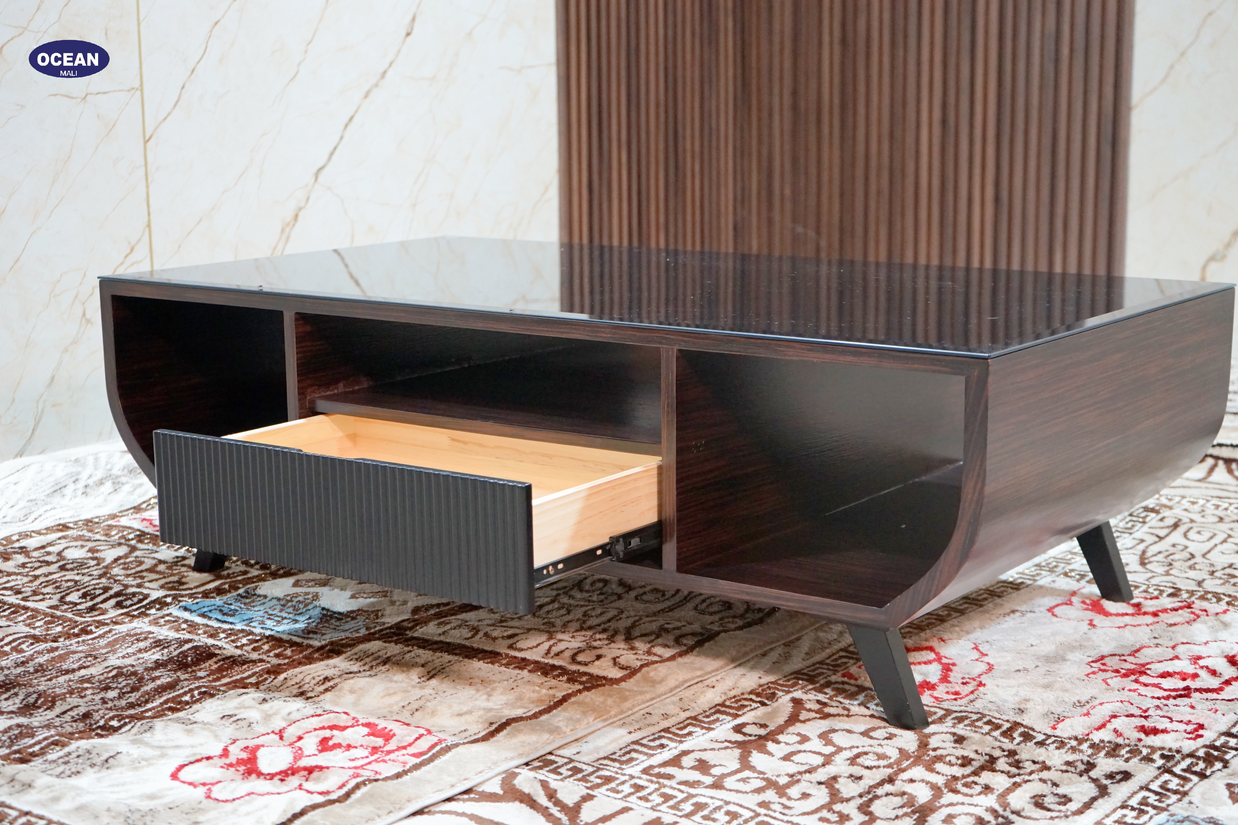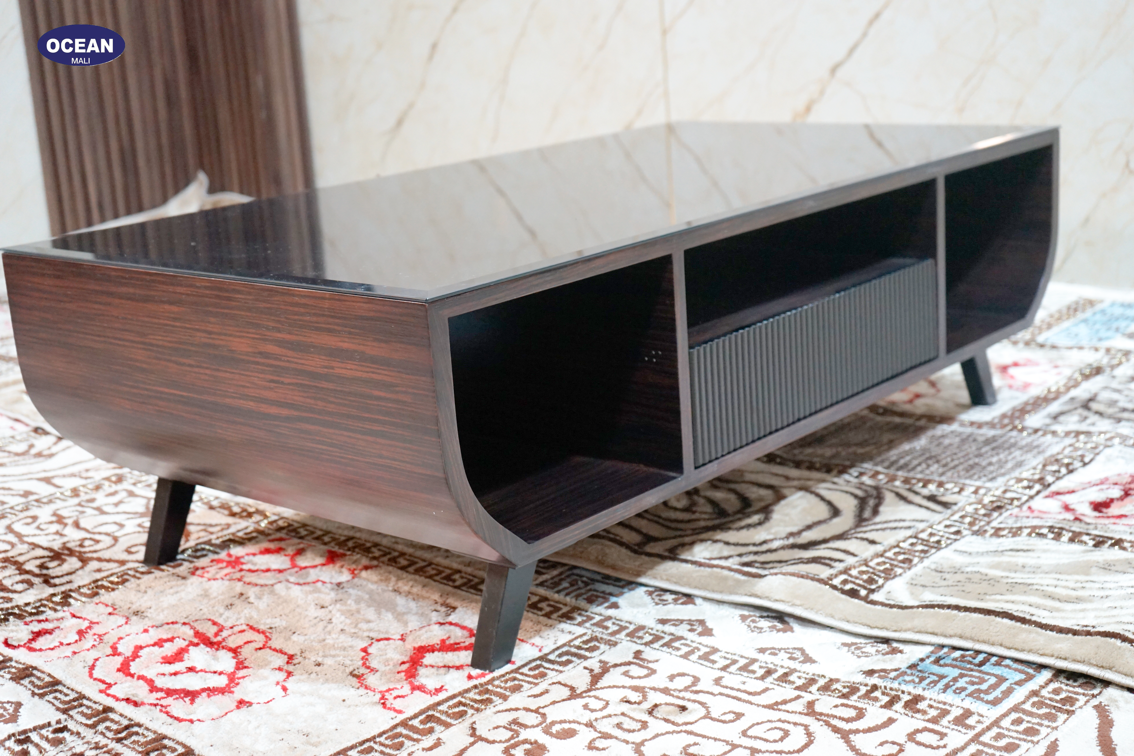 La table est un meuble de salon au design contemporain et élégant. Sa forme incurvée lui confère un aspect doux et arrondi, tout en offrant un espace de rangement généreux grâce à ses étagères ouvertes et son tiroir.