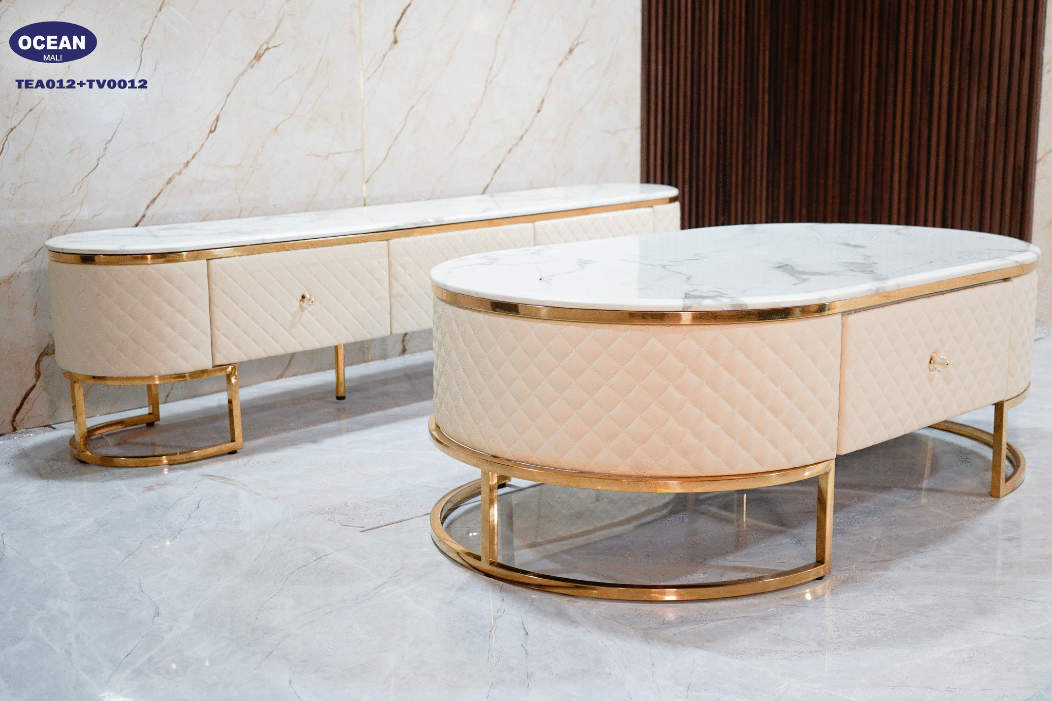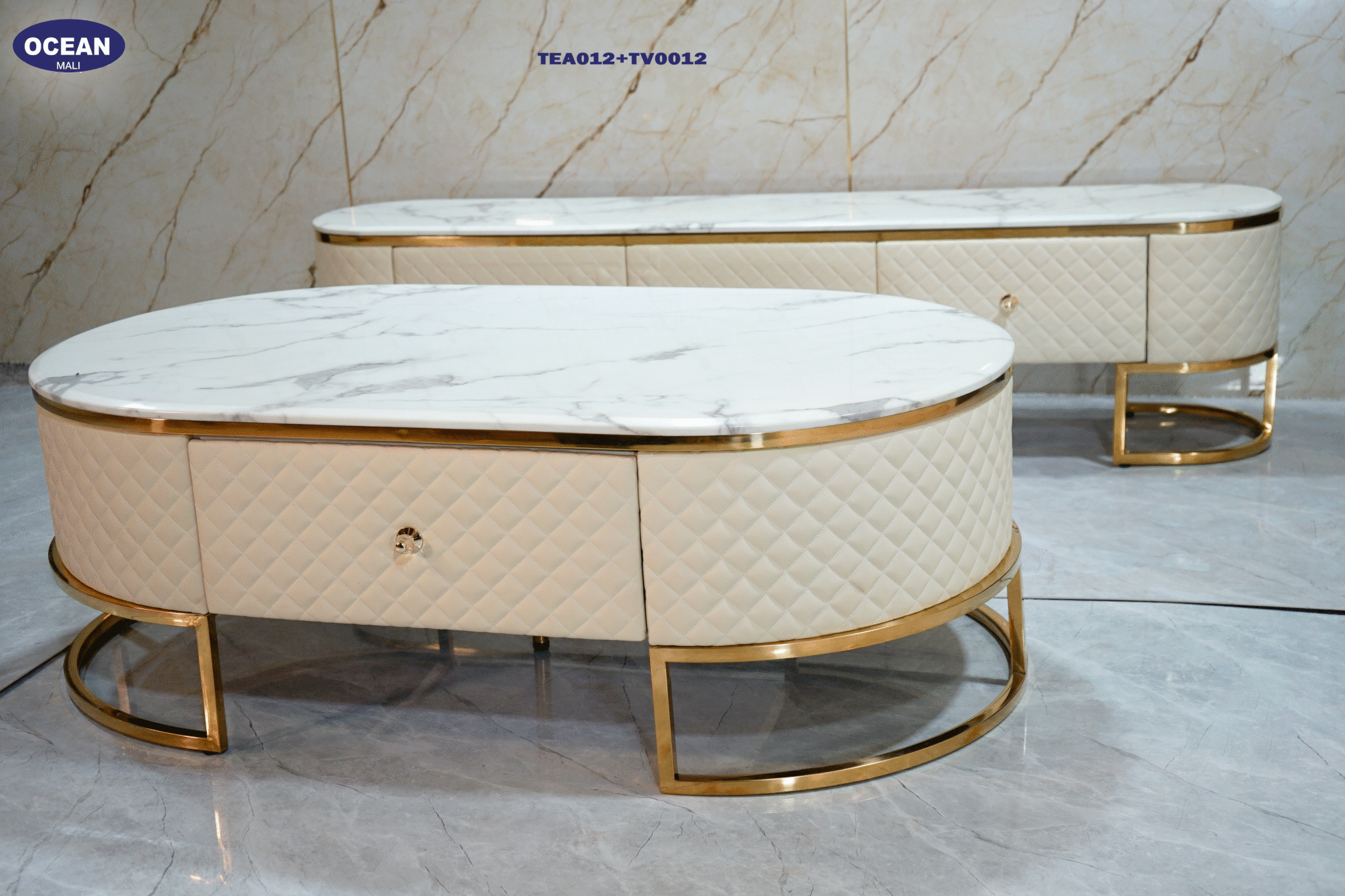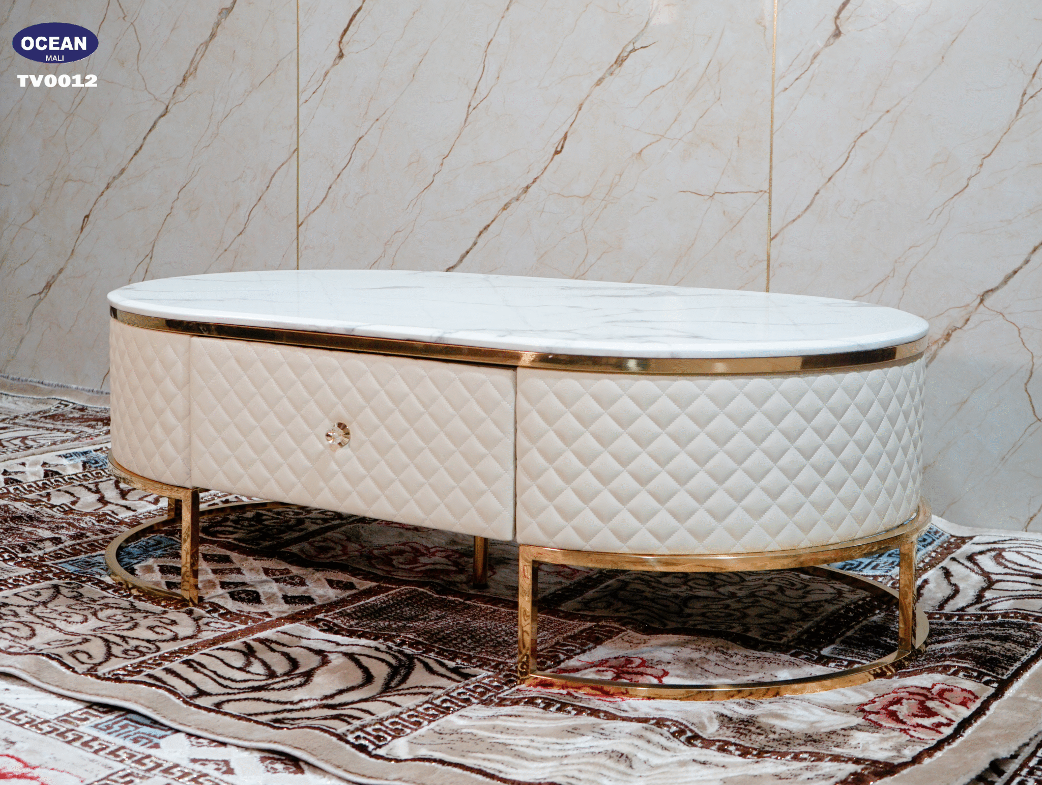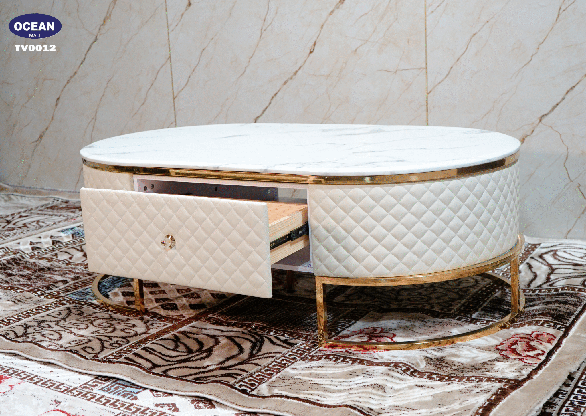 Apportez une touche de luxe et de sophistication à votre salon avec la table basse ovale “Élégance Marquise”. Son plateau en marbre blanc de haute qualité, veiné de gris, repose délicatement sur une structure aux lignes épurées. Les façades de ses deux tiroirs, revêtues d’un similicuir matelassé et capitonné, créent un effet visuel texturé et chic. Les poignées et les contours dorés, ainsi que le piétement fin en métal doré, ajoutent une note de glamour et de raffinement. Cette table basse combine harmonieusement des matériaux nobles pour un design intemporel, à la fois fonctionnel et esthétiquement plaisant, parfait pour un intérieur moderne ou classique.