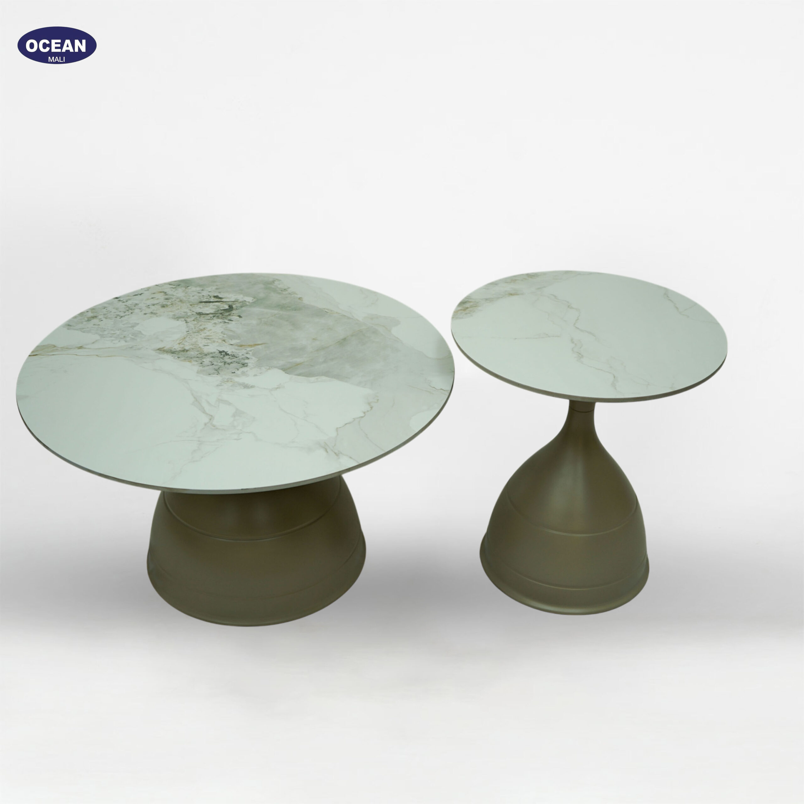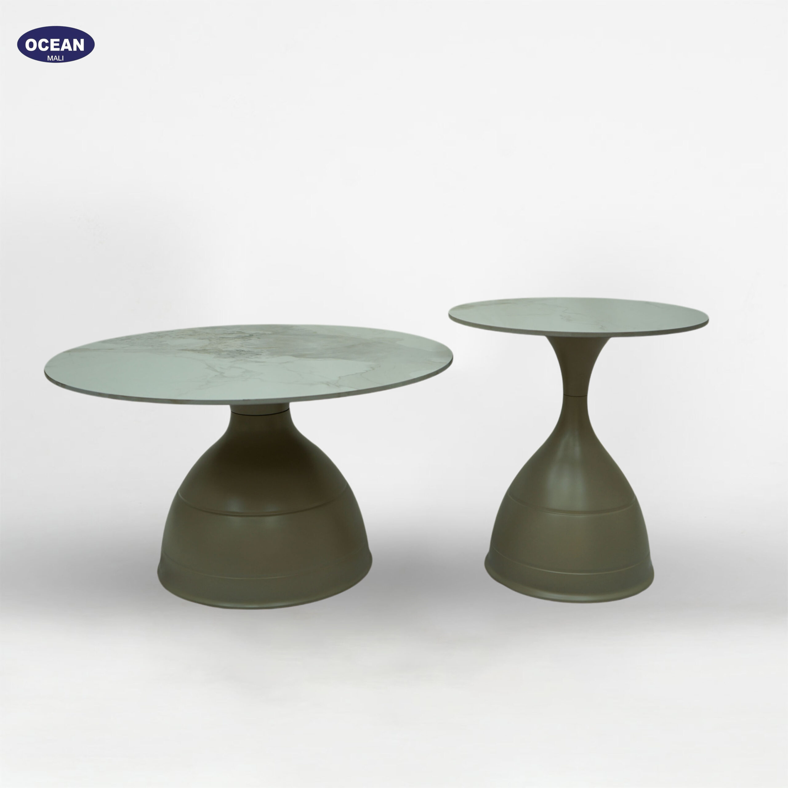 Deux tables basses rondes, l’une plus grande que l’autre, avec des plateaux clairs et des pieds coniques massifs. Elles se glissent l’une sous l’autre pour gagner de la place. Leur design simple et naturel s’adapte à tous les styles.